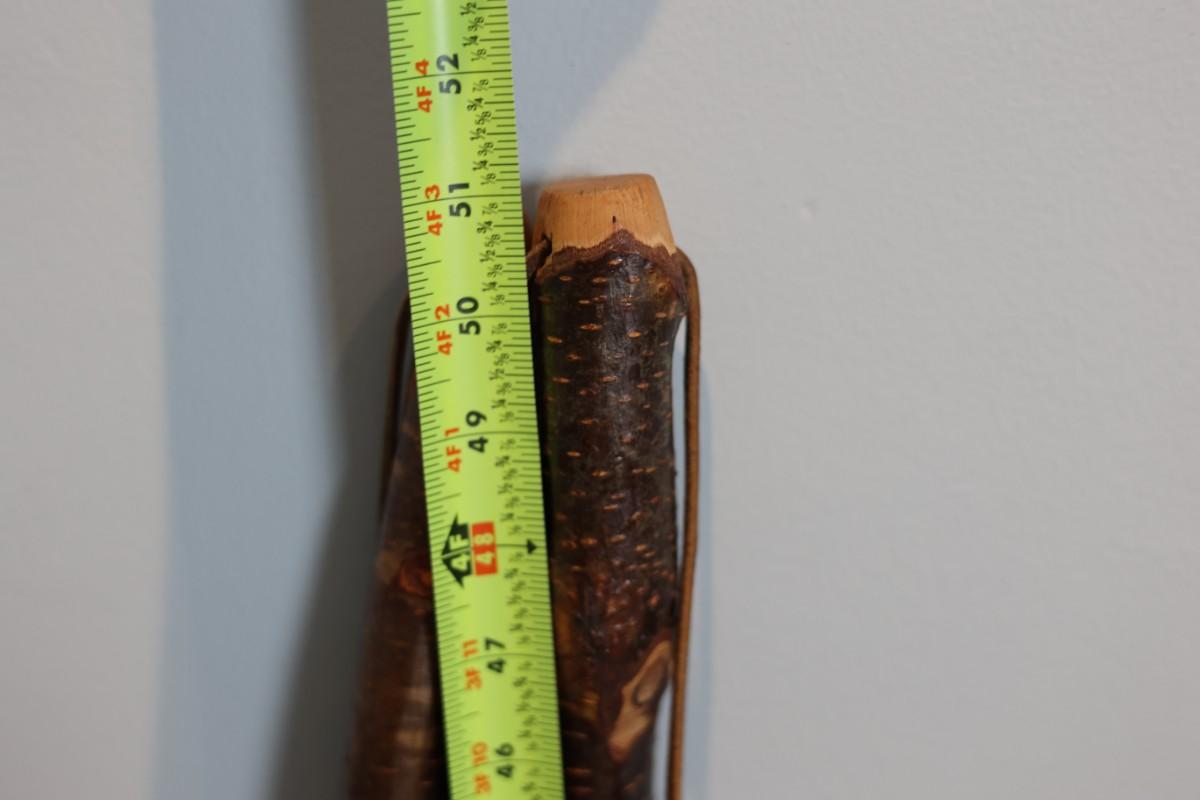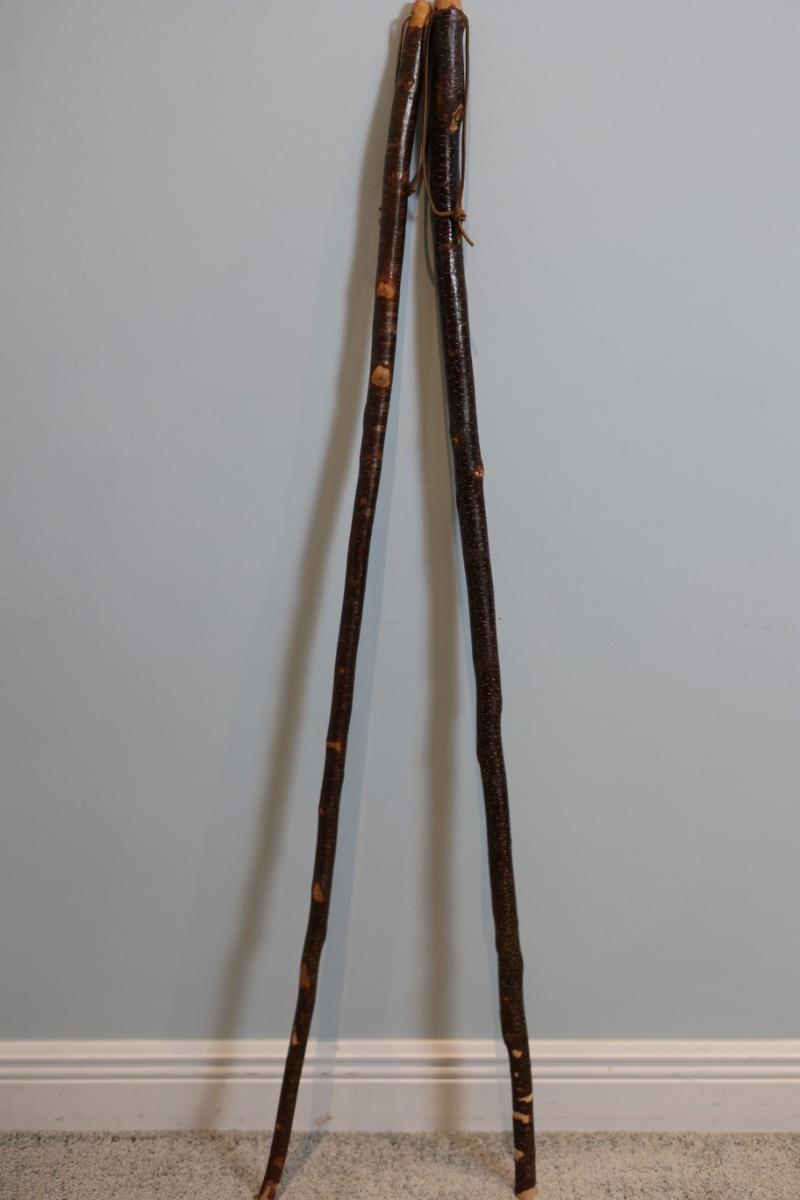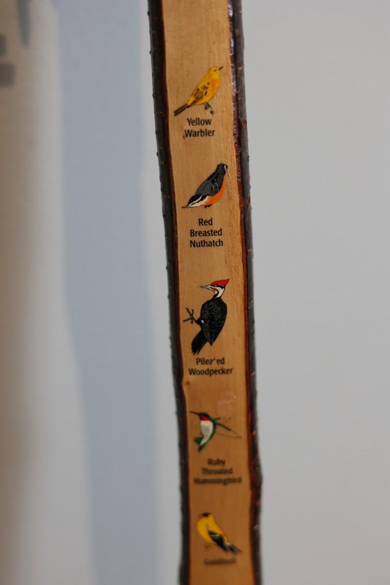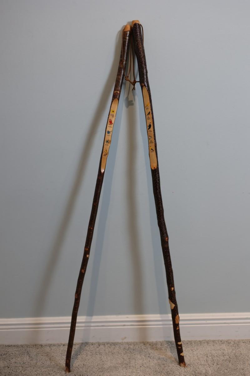 Pair of decorative wooden walking sticks featuring painted bird inlay panels and leather wrist strap.