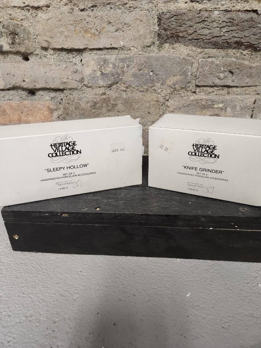 Two boxes sets of Dept 56 accessories. Sleepy Hollow and knife Grinder
