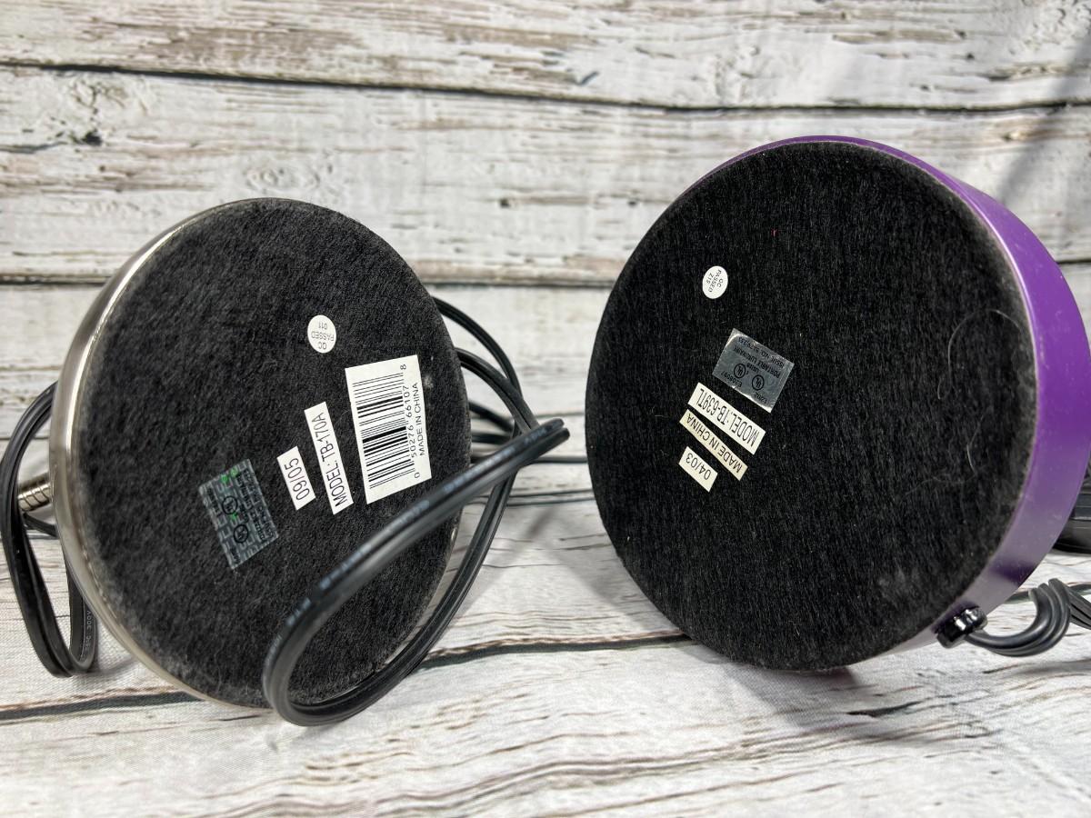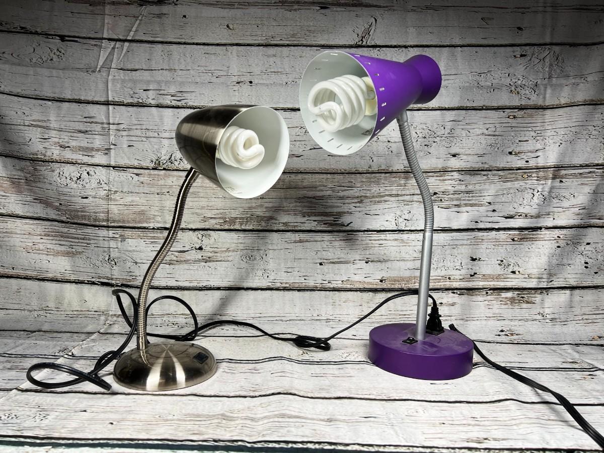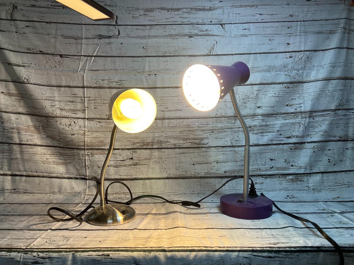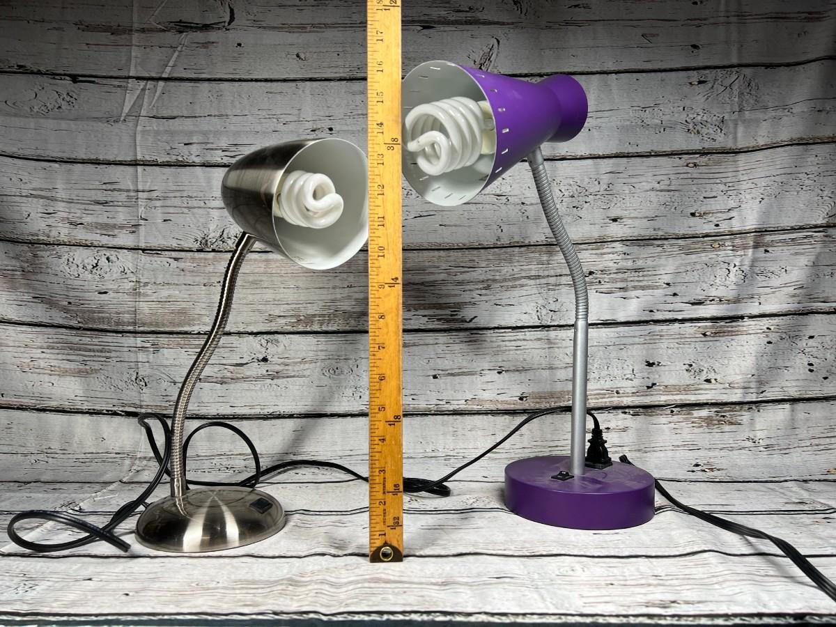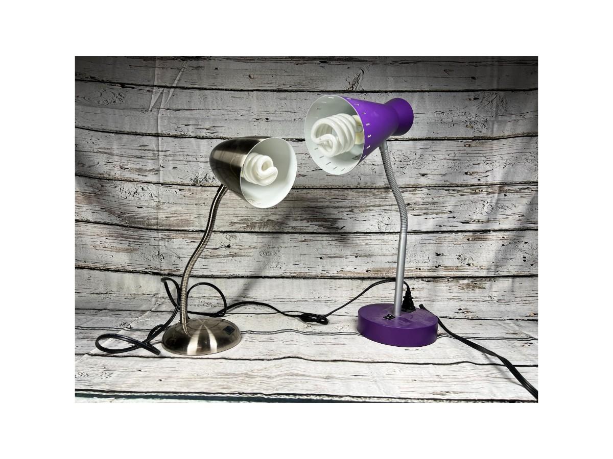Pair of Desktop Office Bendable & Adjustable Table Drawing Lamps, there is no significant damage to both of the lamps and is in good useable condition. Both have been tested and works perfectly, the purple lamp does not come with the lightbulb. Check pictures for more details and for sizing.