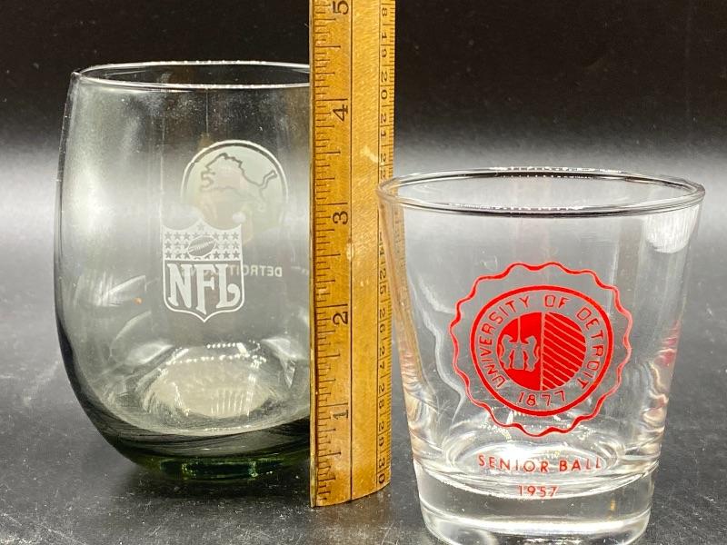 Pair of Detroit themed glasses. NFL Detroit Lions tumbler and a University of Detroit collectors glass. Both in good condition.