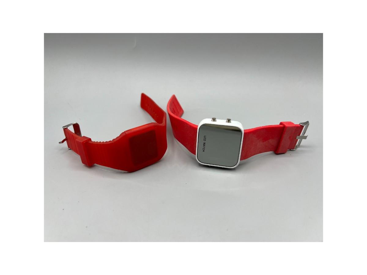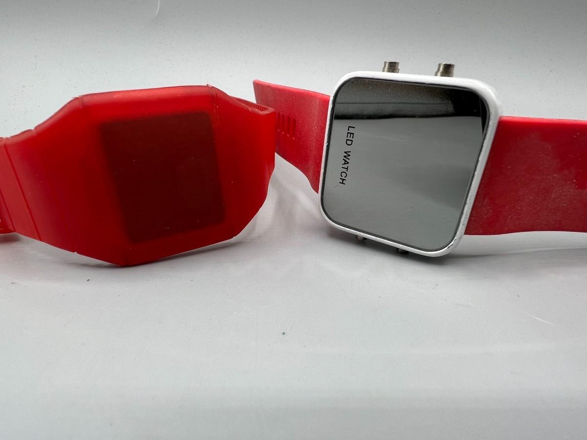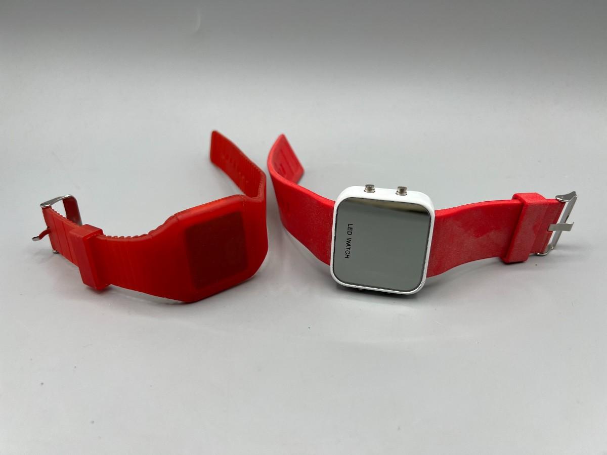 Pair of Digital LED Red Strap Watches, there is no signifncant damage to the bodies of the watches and is in good condition. The watches do not turn on and has not been tested with new batteries, check pictures for more details and for sizing.