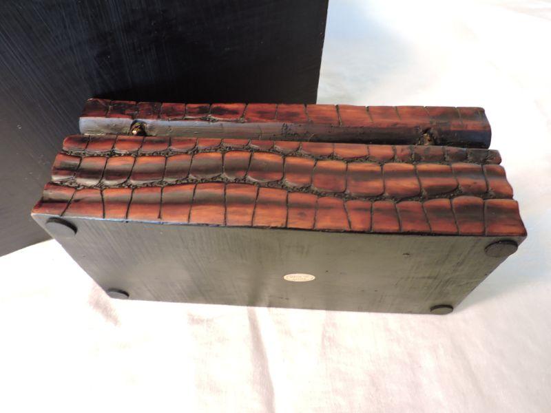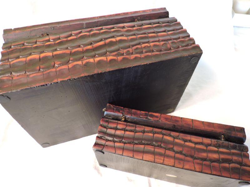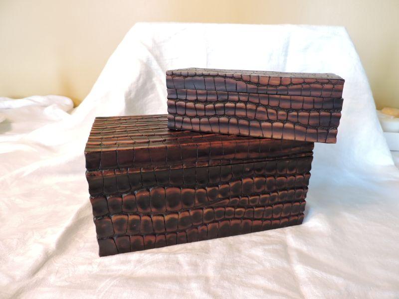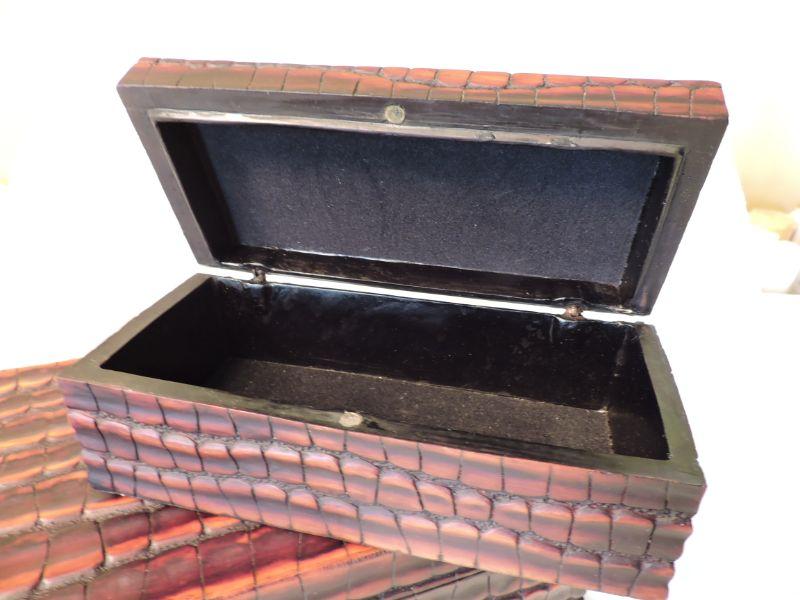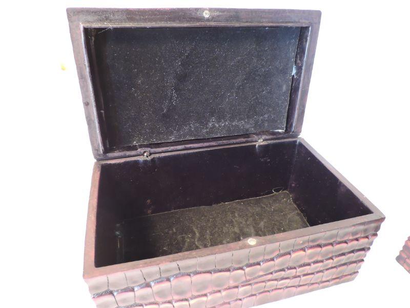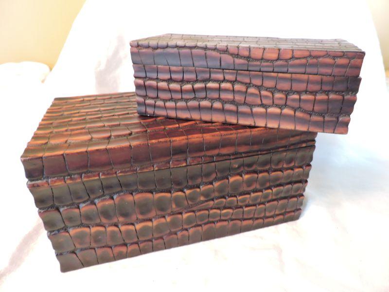 Pair of Display boxes, lined with velvet with a faux snake skin outside. **Please read Terms and Conditions before placing a bid. Pick up is Wednesday, September 25 from 4pm to 7pm and Saturday, September 28 from 9am to 1pm in Williamstown, NJ. All sales are final. All sales are as is, where is. Please review all photos. Any props included in photos are not included in listing. All measurements are approximate.