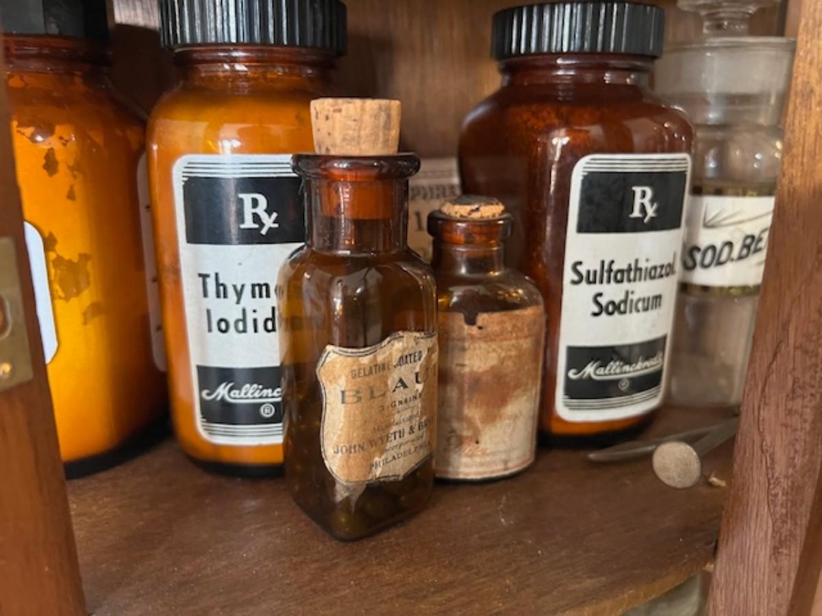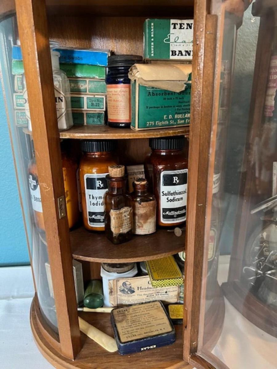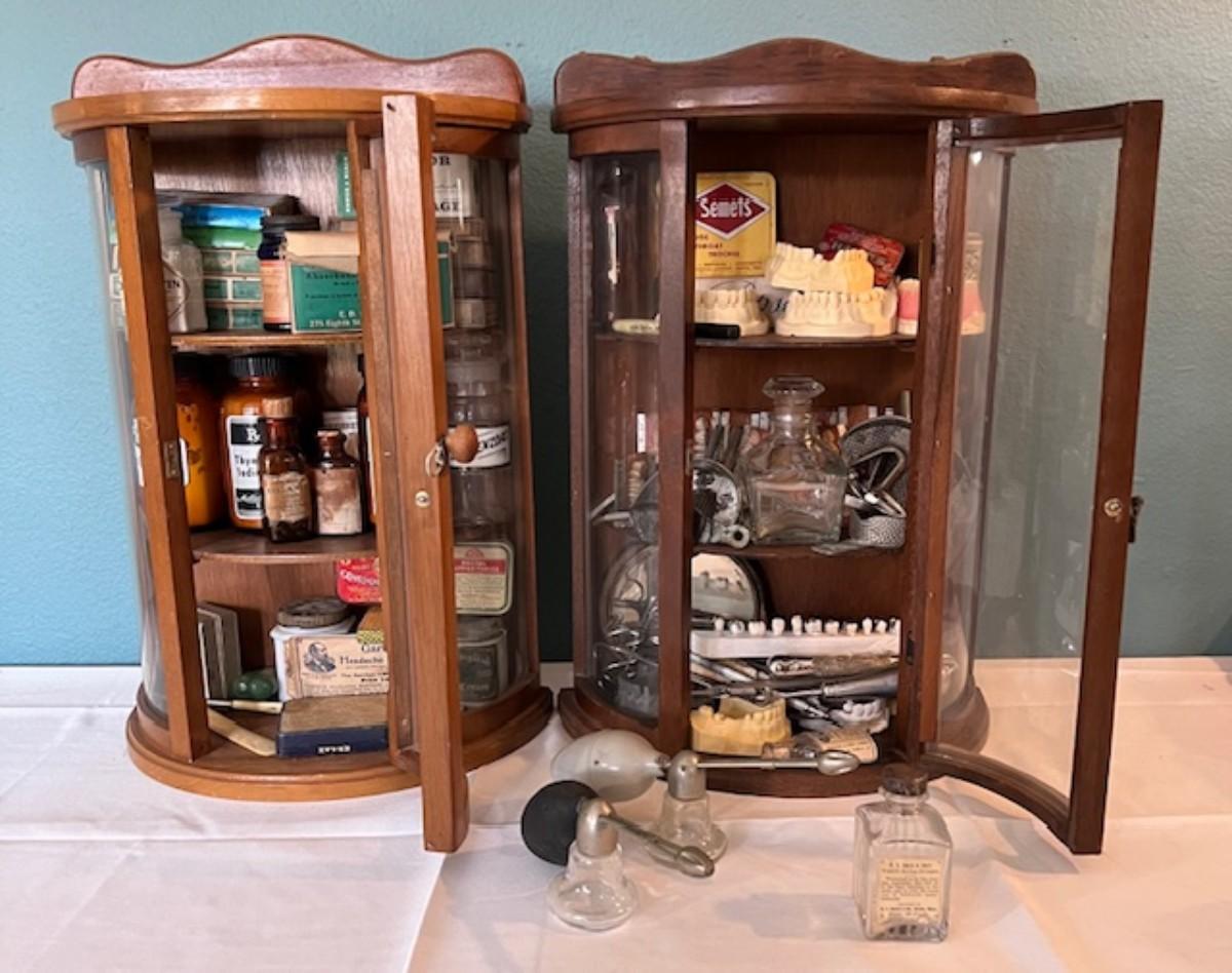 Contents include medical and dental bottles and accessories. Total of 40+ pieces in two cabinets. Measurement of cabinets: 19"H x 13"W (each).