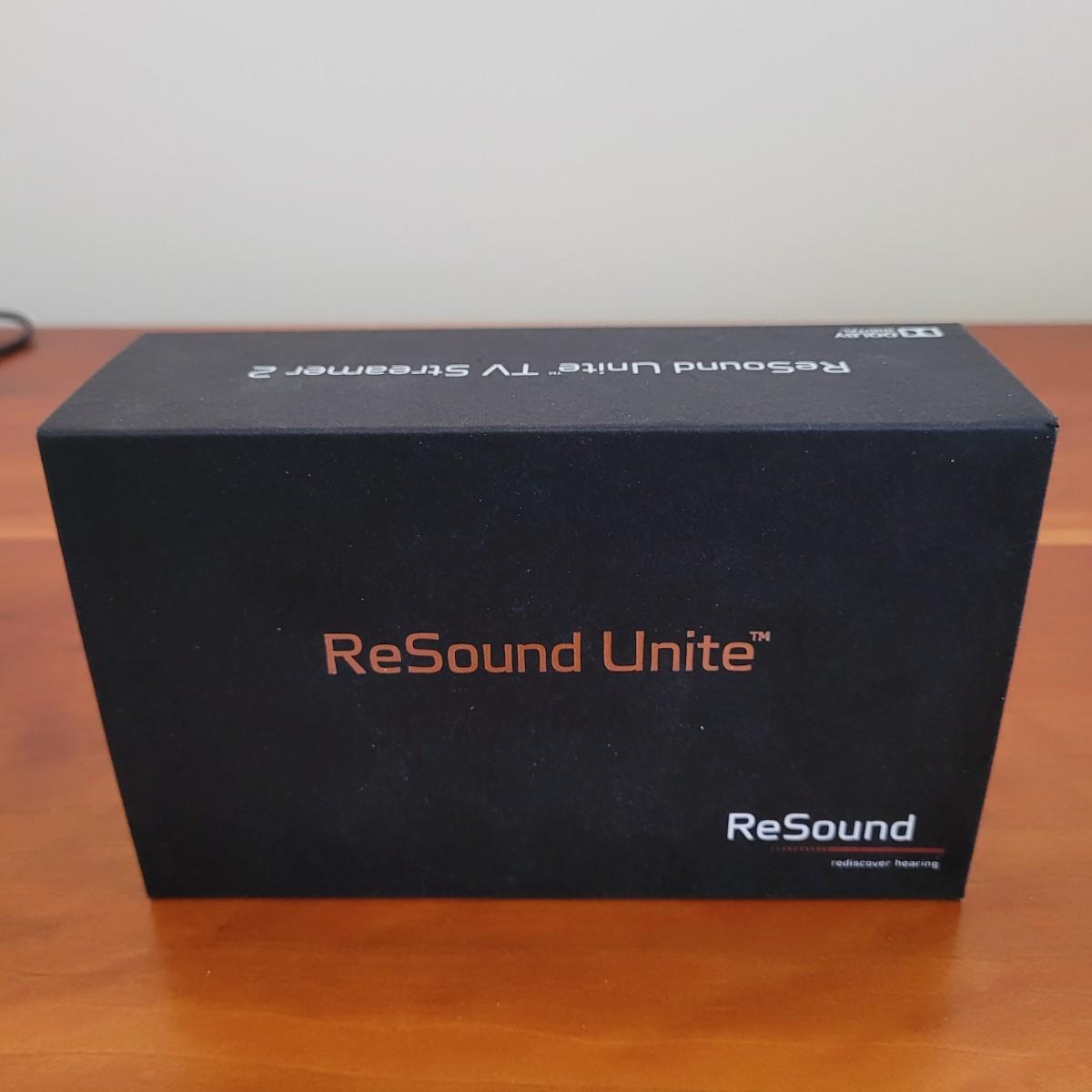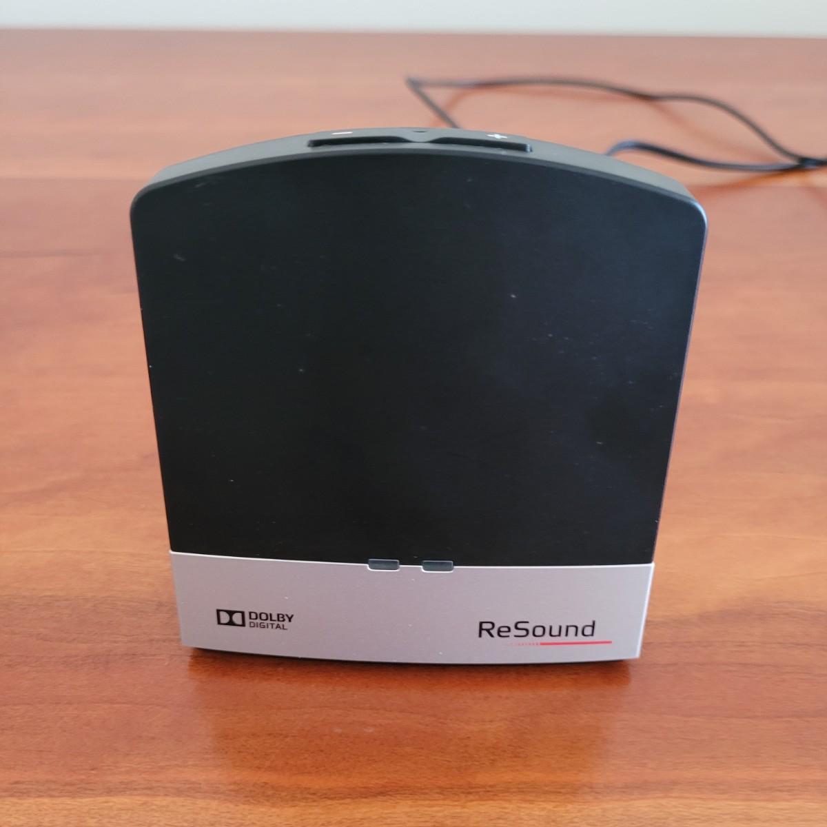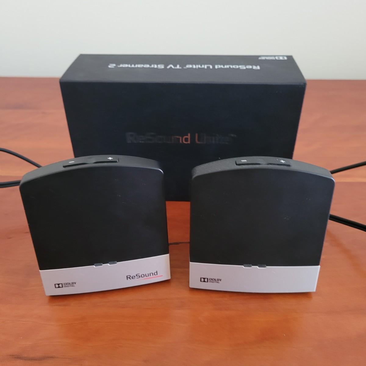 This lot includes two Dolby Digital brand ReSound Unite TV streamers.The ReSound TV Streamer 2 is a wireless accessory that streams audio from a TV, computer, or other audio source directly to ReSound hearing aids, turning them into wireless headphones. It allows users to adjust the volume to their preference, while others can still listen at their preferred volume. The streamer is compatible with various ReSound hearing aid models and offers a range of up to 22 feet. This lot includes all cables and cords and one set of original packaging and paperwork. We were unable to test these items due to not having the hearing aids.