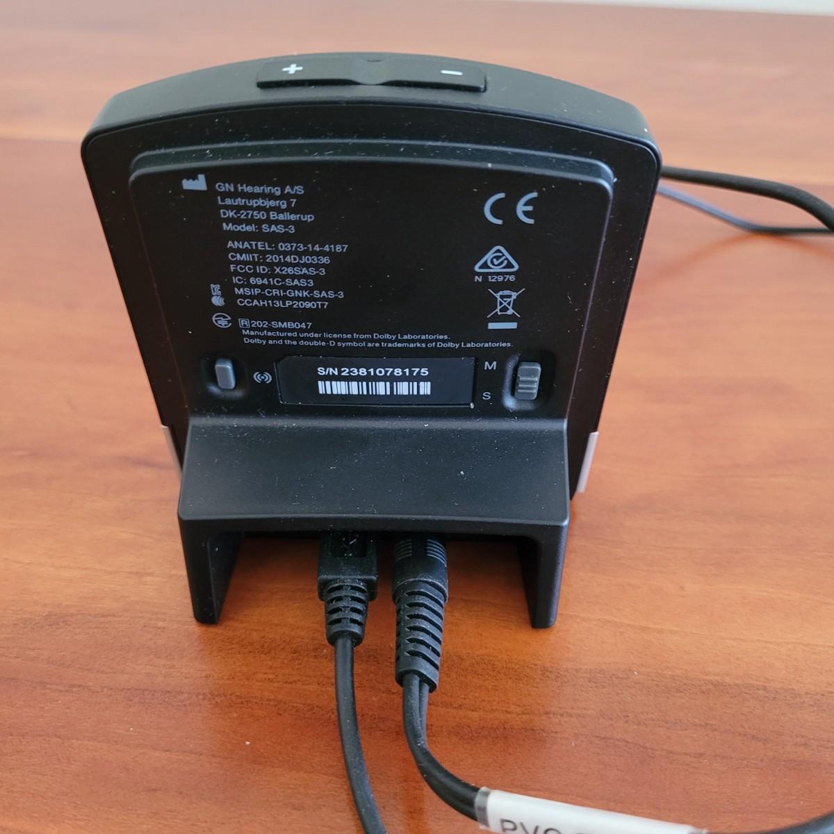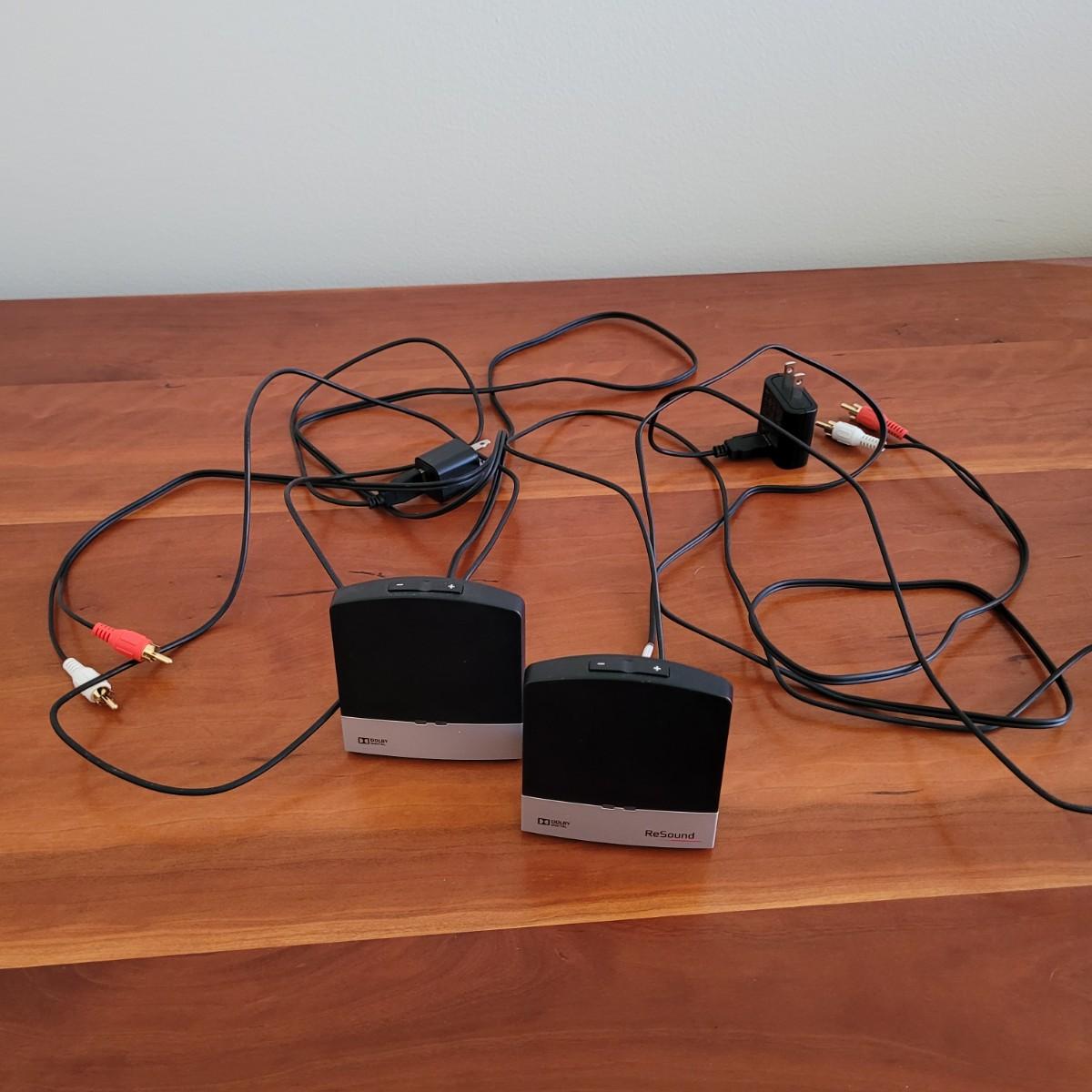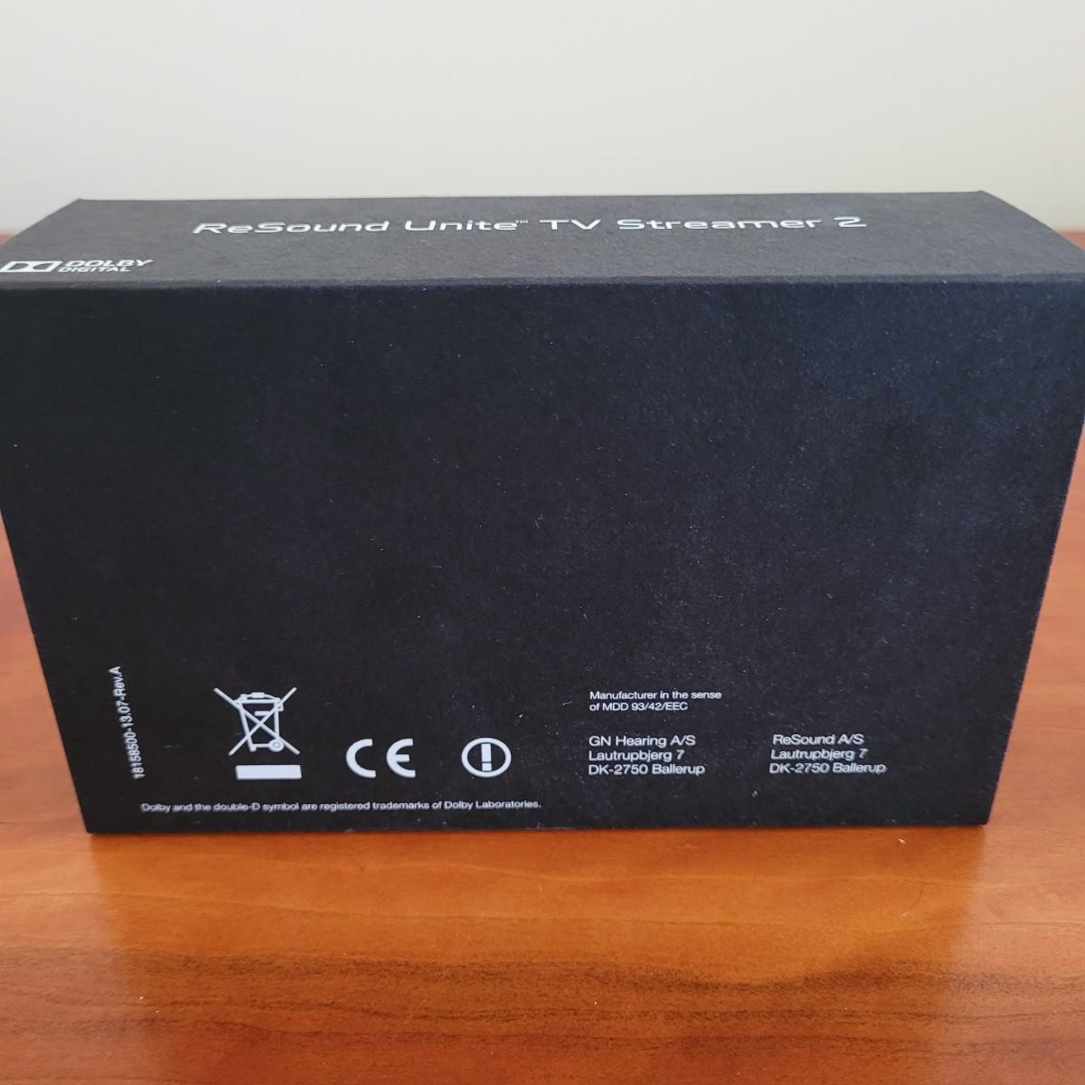 This lot includes two Dolby Digital brand ReSound Unite TV streamers.The ReSound TV Streamer 2 is a wireless accessory that streams audio from a TV, computer, or other audio source directly to ReSound hearing aids, turning them into wireless headphones. It allows users to adjust the volume to their preference, while others can still listen at their preferred volume. The streamer is compatible with various ReSound hearing aid models and offers a range of up to 22 feet. This lot includes all cables and cords and one set of original packaging and paperwork. We were unable to test these items due to not having the hearing aids.