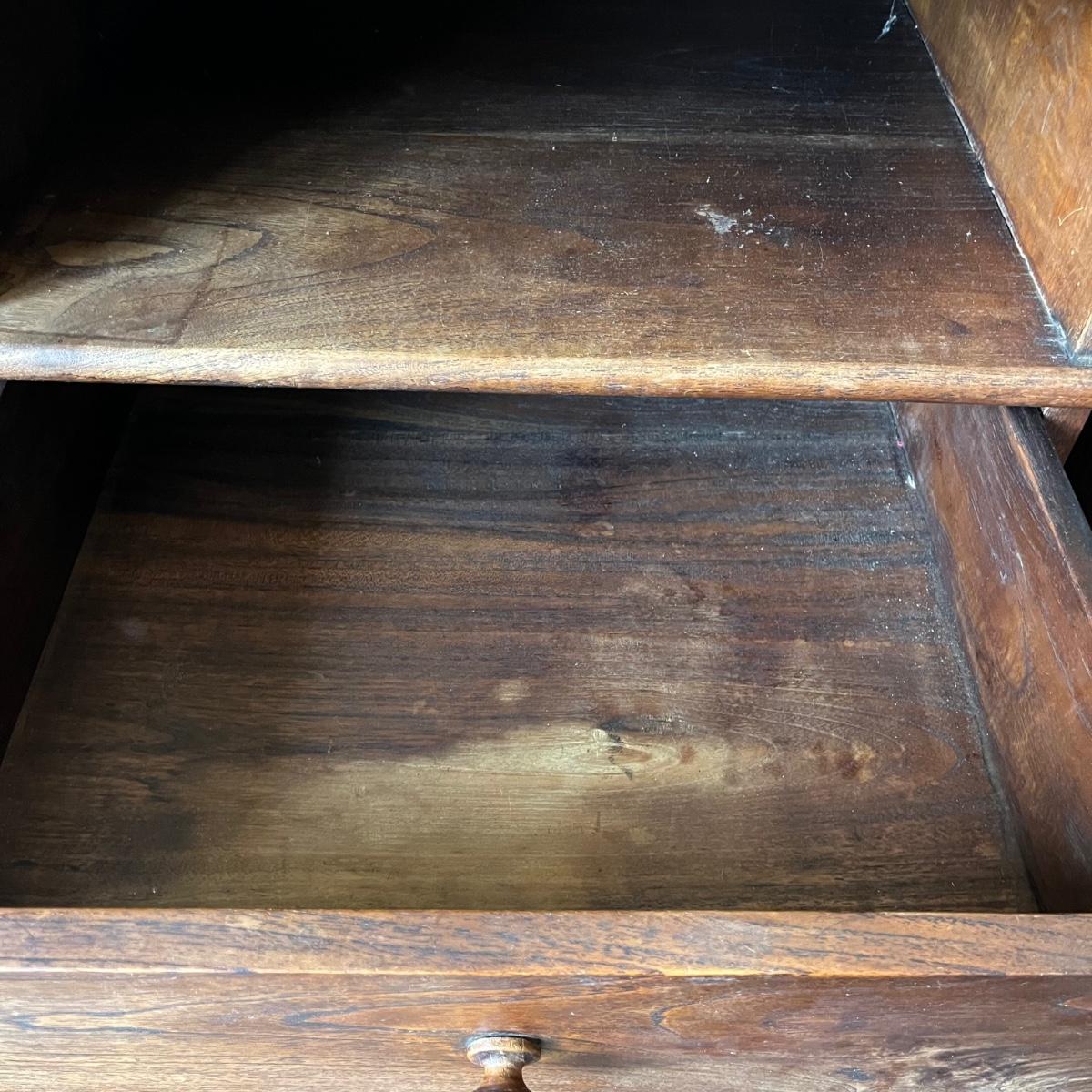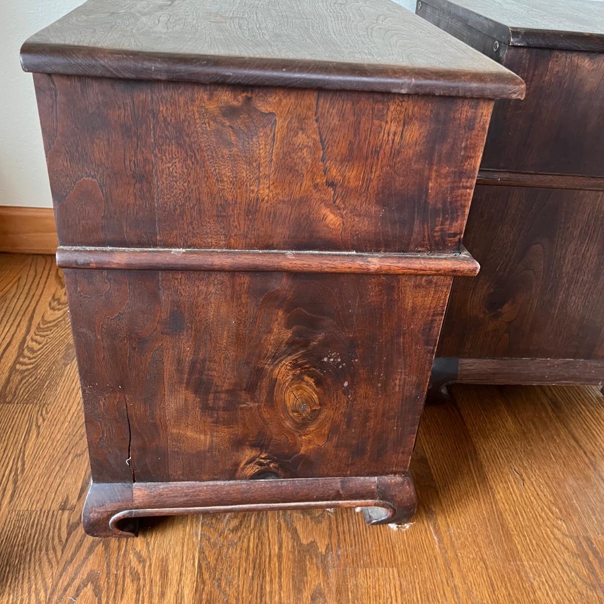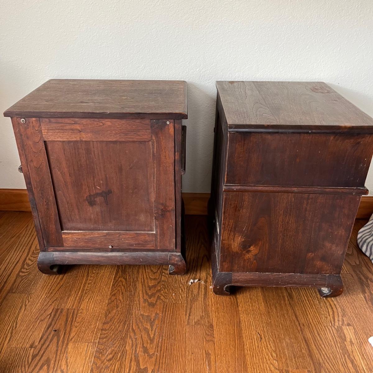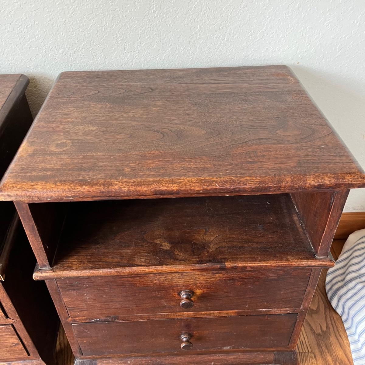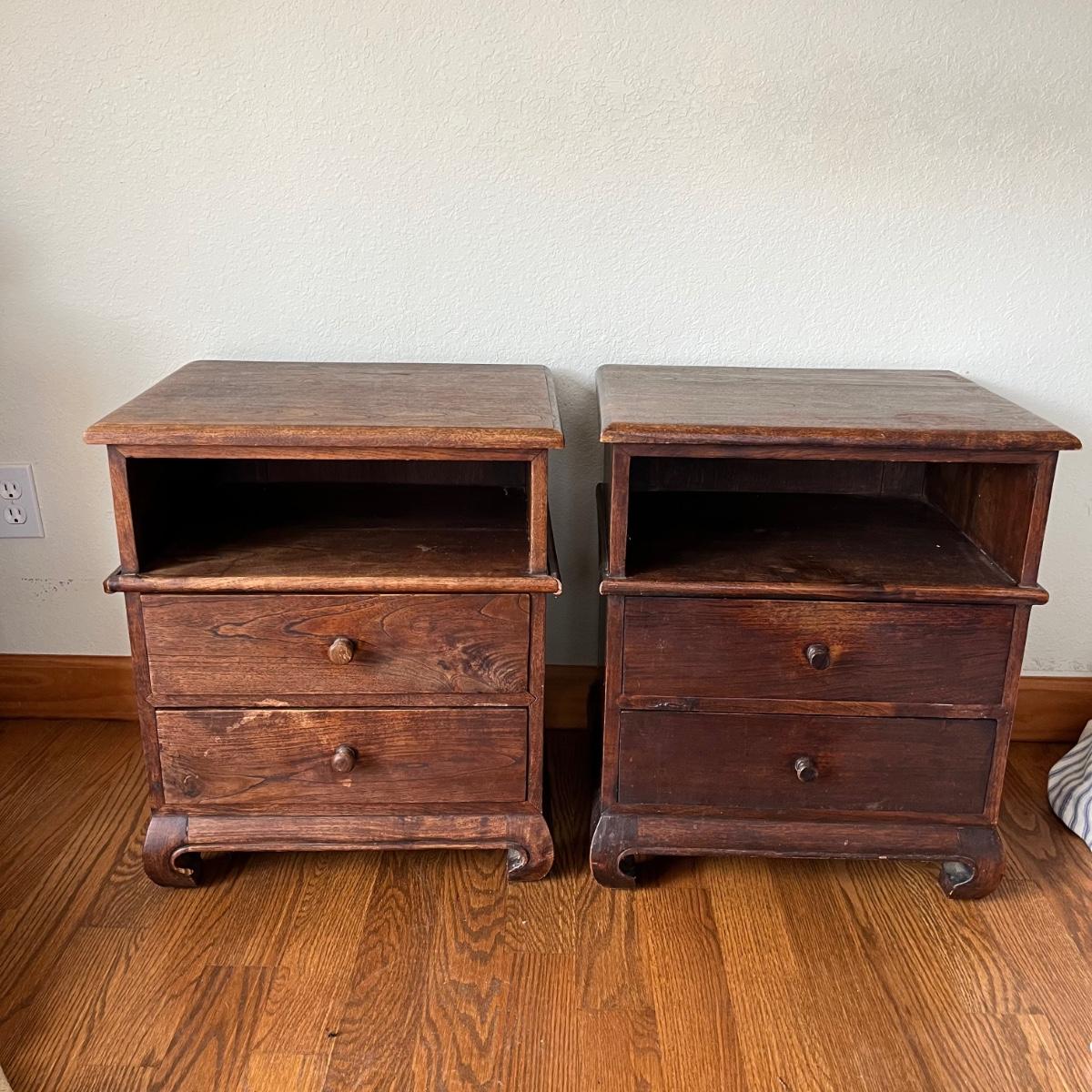 Lot includes a pair of dried teak end tables. Both tables have two dovetailed drawers. One table has split on side and the trim is loose, see pictures, otherwise they are in good condition. This sale features a similar dried teak bed. Tables measure 15” x 20” x 23”.