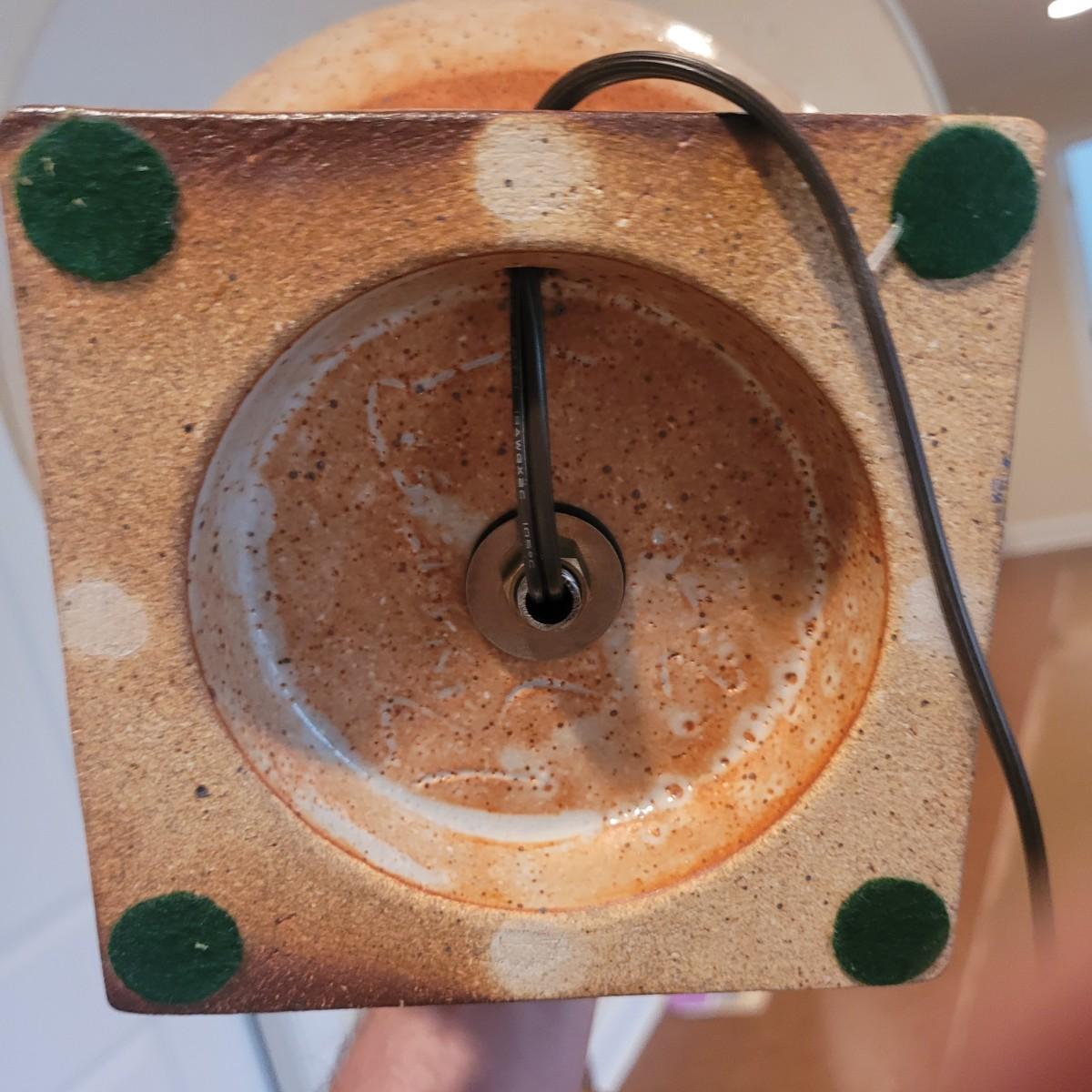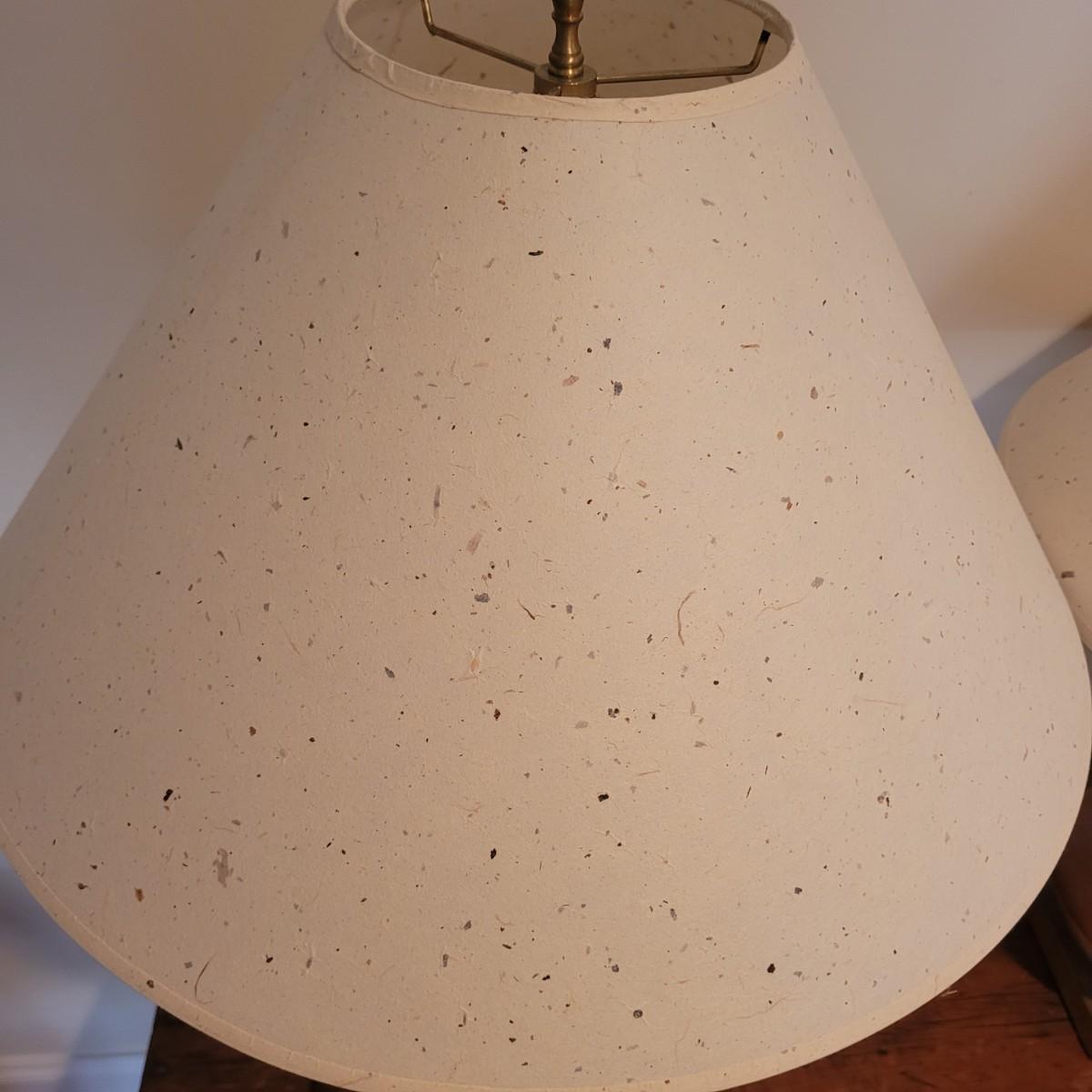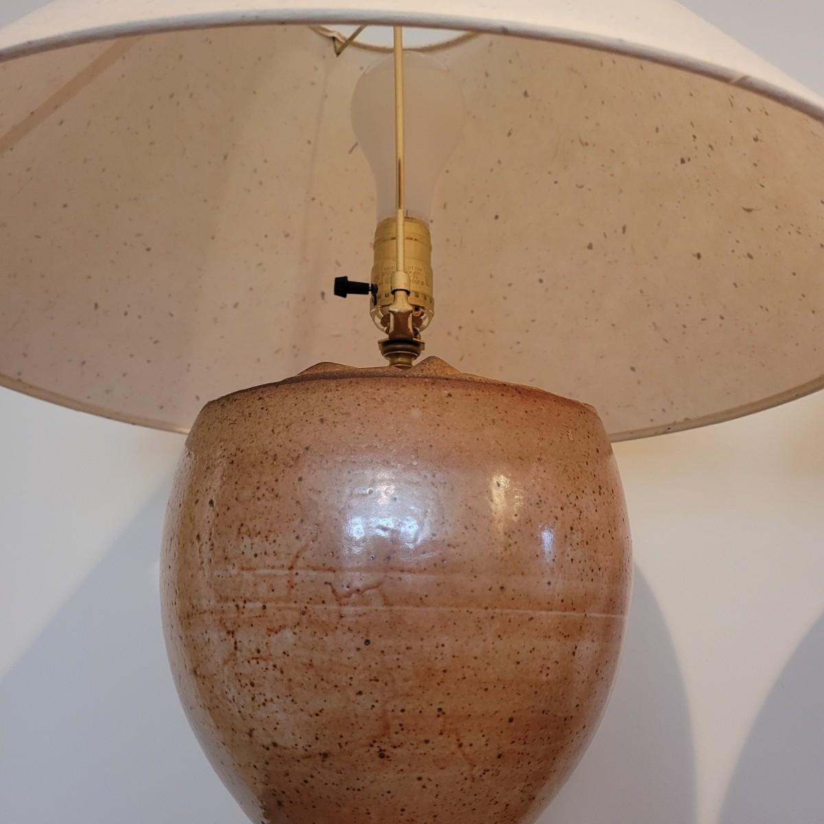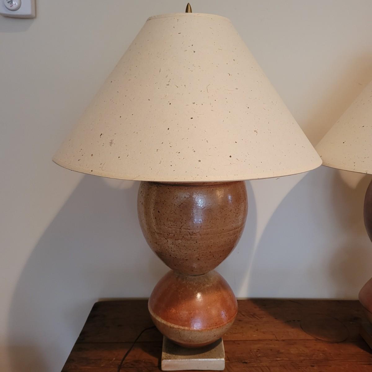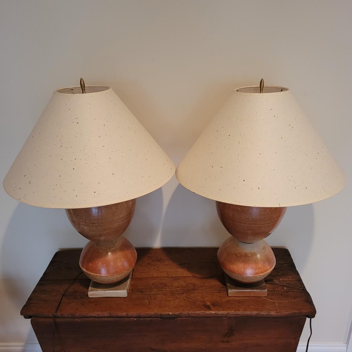Two mid-century earthenware lamps. They are identical and feature a three-level dimmer switch and paper lamp shades. Both power on when plugged in. Both are heavy and very sturdy. Individually, the lamps measure 20" x 20" x 28"H. Pictured table is available in a separate lot.