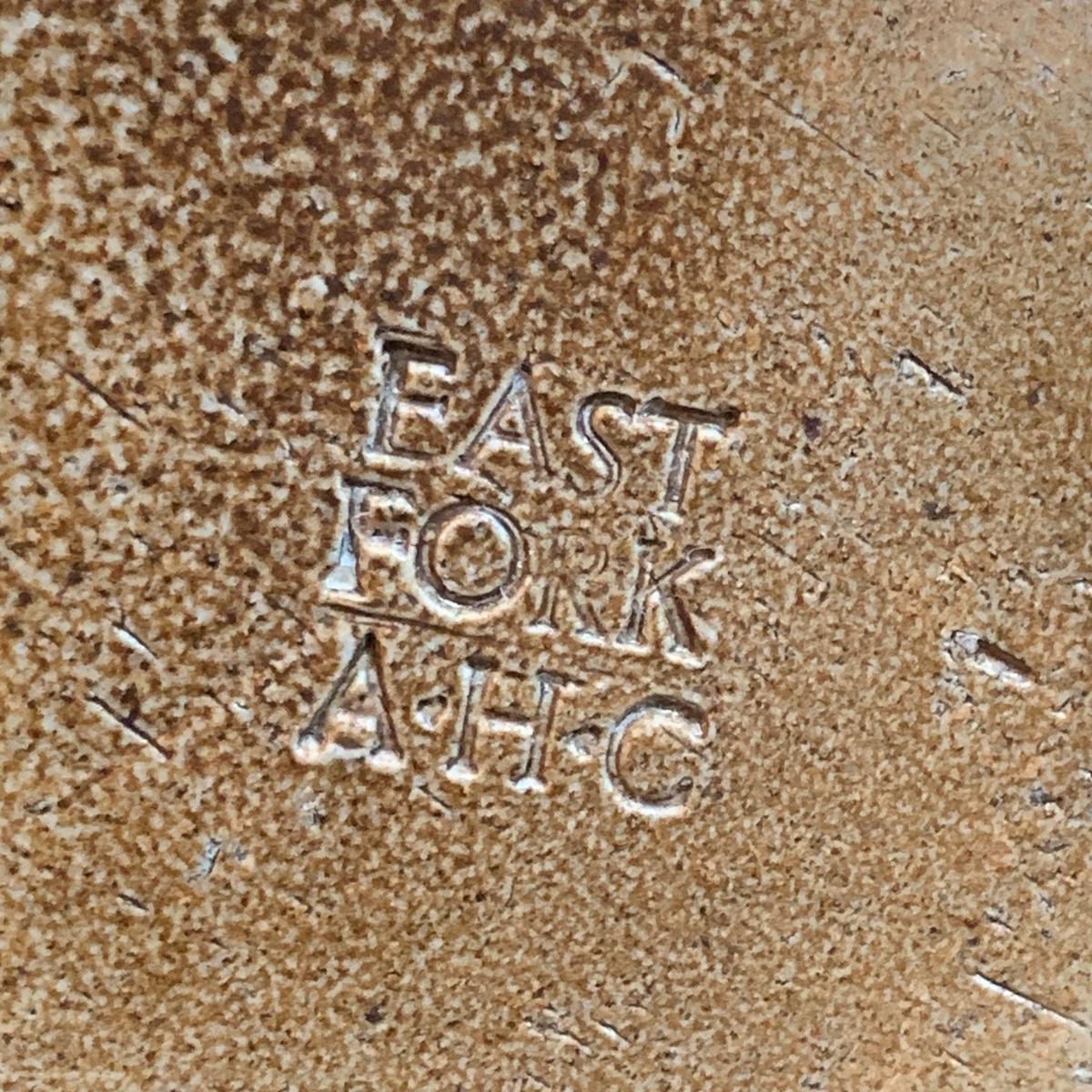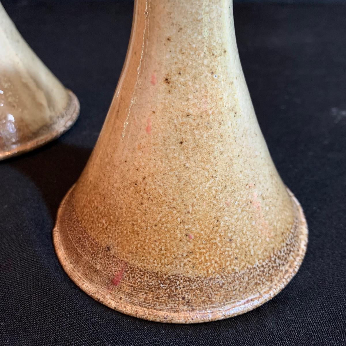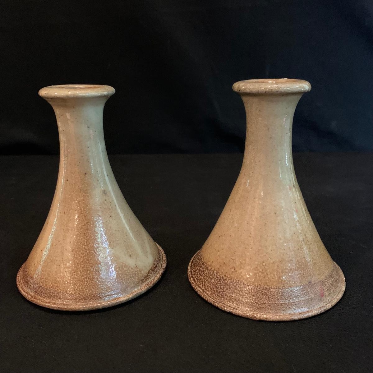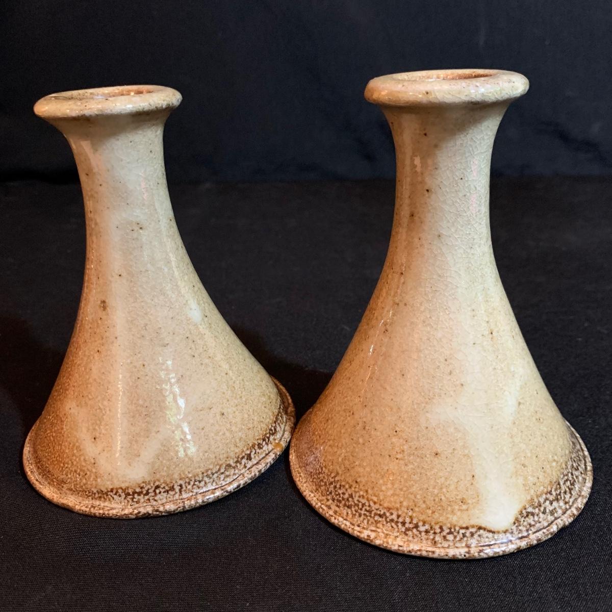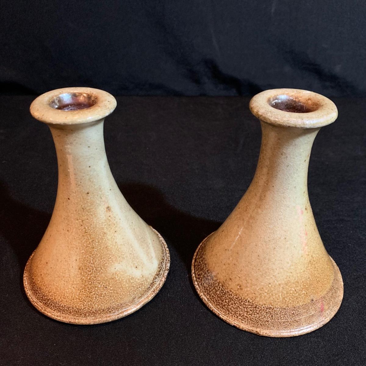 A set of two tan colored ceramic candle holders from Asheville’s local East Fork Pottery. Per the potter, Alex Matisse, these bear the stamp of the second or third EF employee circa 2012 or 2013. At the base these are approximately 4.25”D and they are 5.5”H. Some candle wax residue remains. There is a tiny chip on the base of one; see photos.