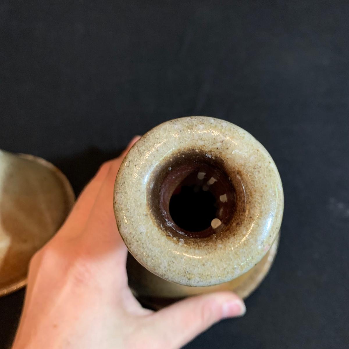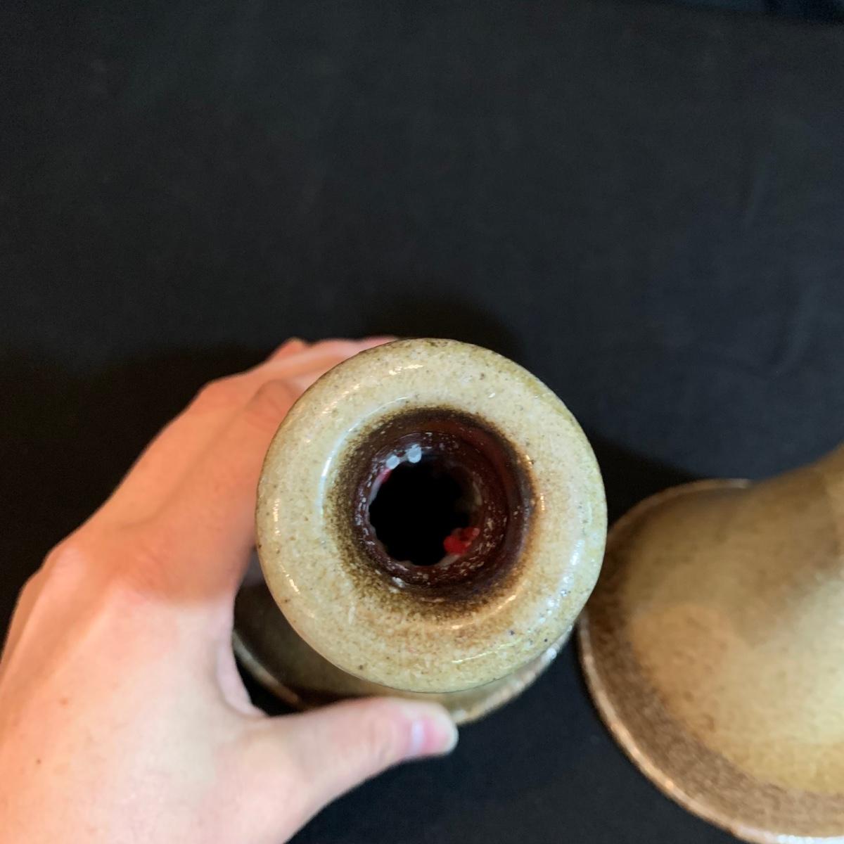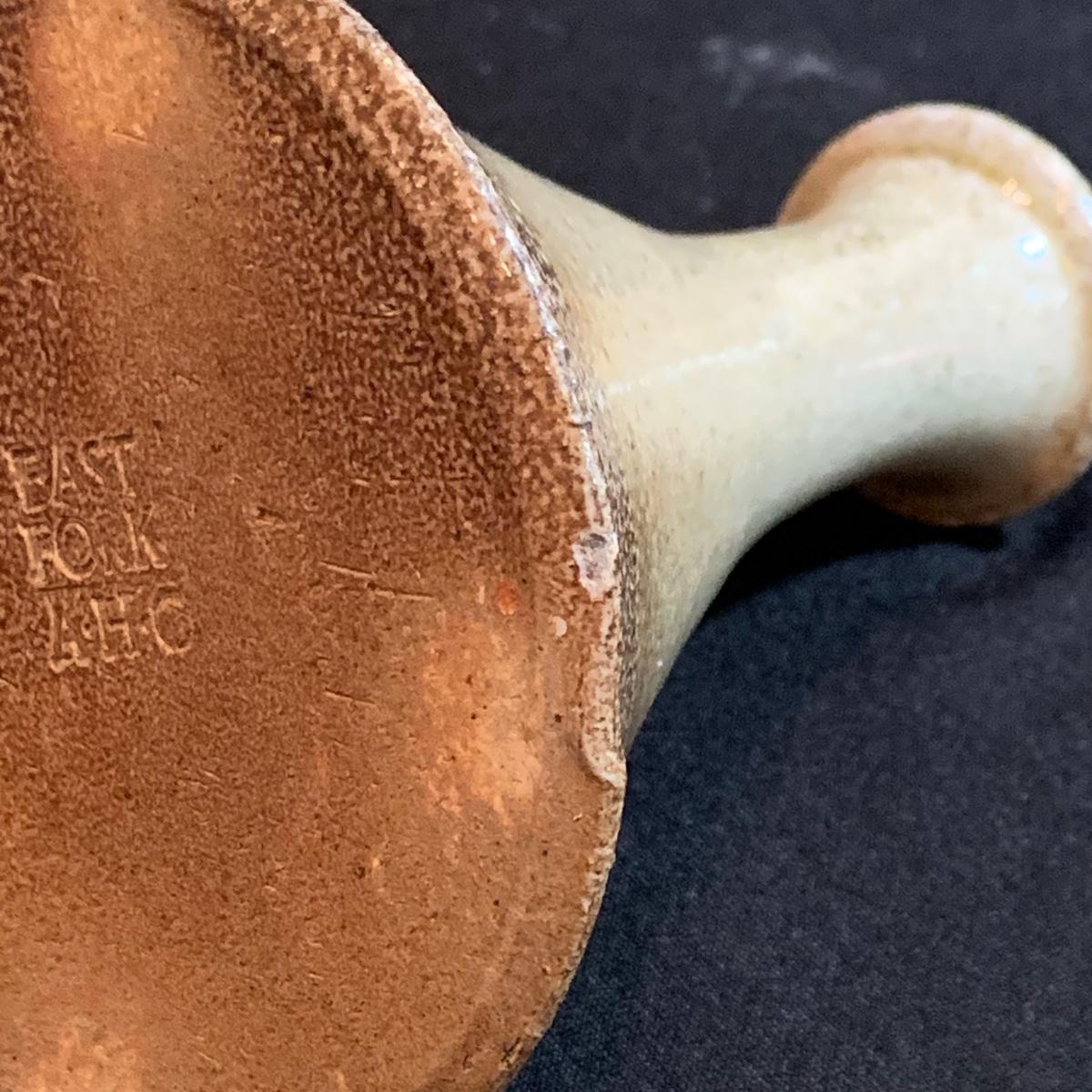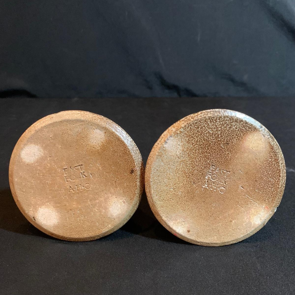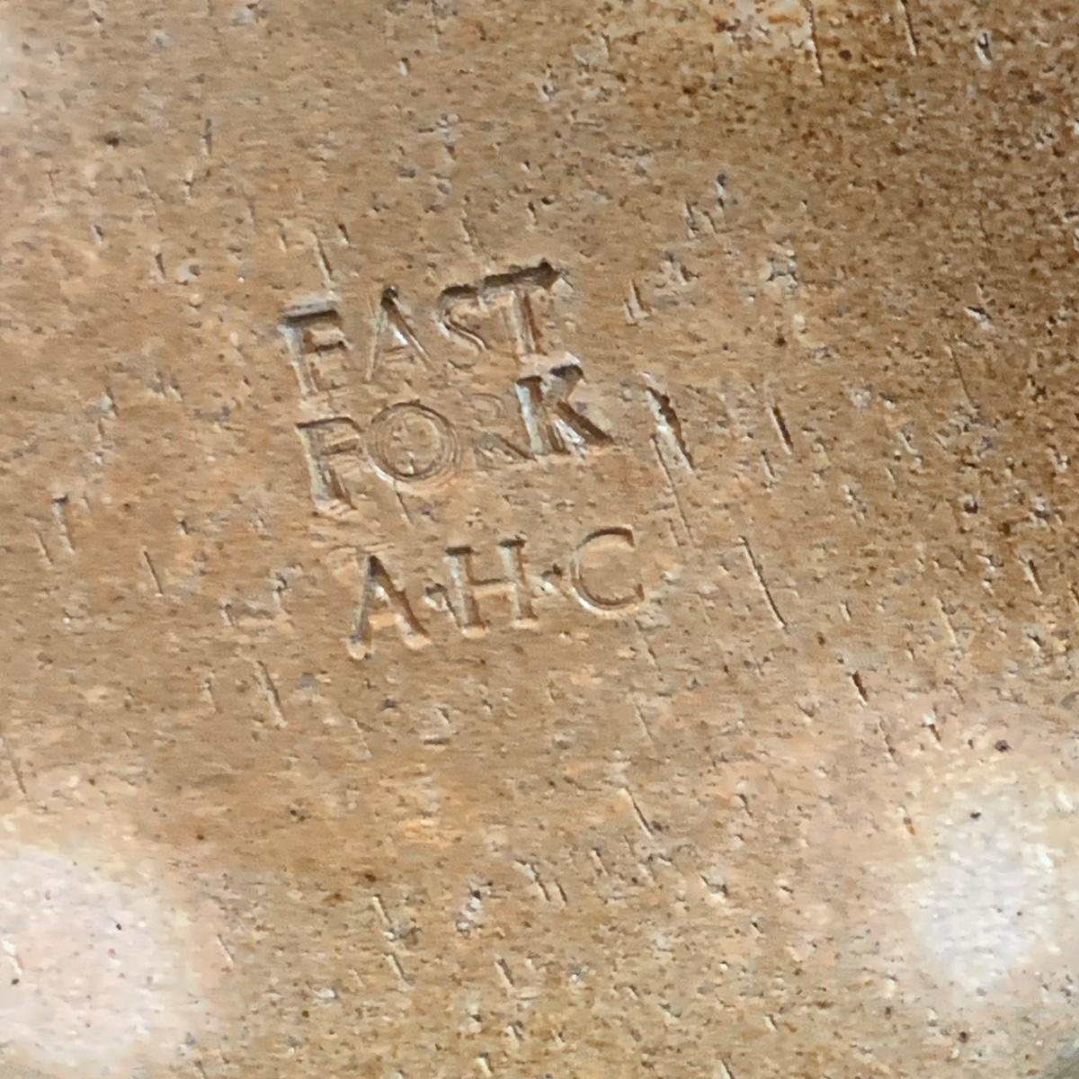A set of two tan colored ceramic candle holders from Asheville’s local East Fork Pottery. Per the potter, Alex Matisse, these bear the stamp of the second or third EF employee circa 2012 or 2013. At the base these are approximately 4.25”D and they are 5.5”H. Some candle wax residue remains. There is a tiny chip on the base of one; see photos.