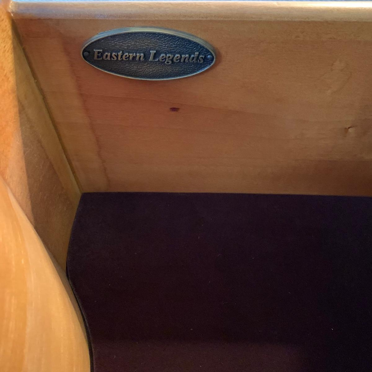Set of two gorgeous solid wood two-drawer dressers by Eastern Legends. Dressers have metal drawer pulls and dovetailed drawers. The top drawers each have a removable velvet lining. Each dresser measures 40” x 21” x 33”H. Dressers are quite heavy and very sturdy.