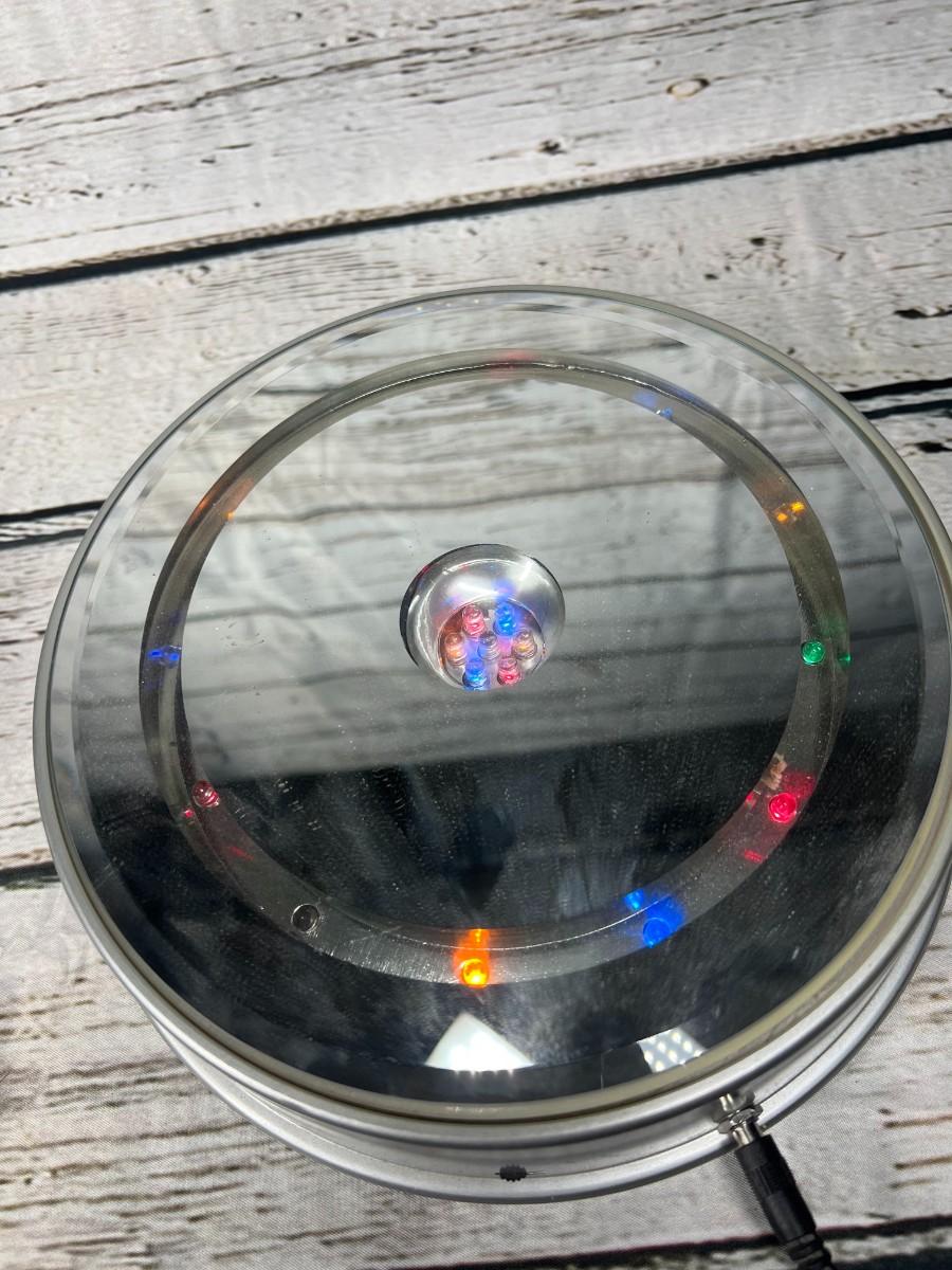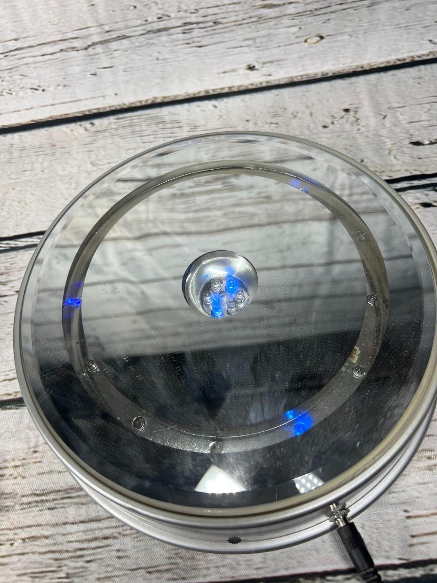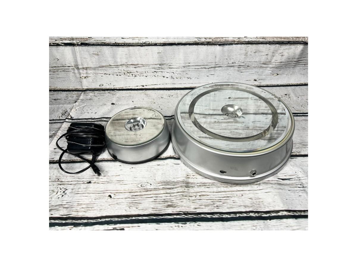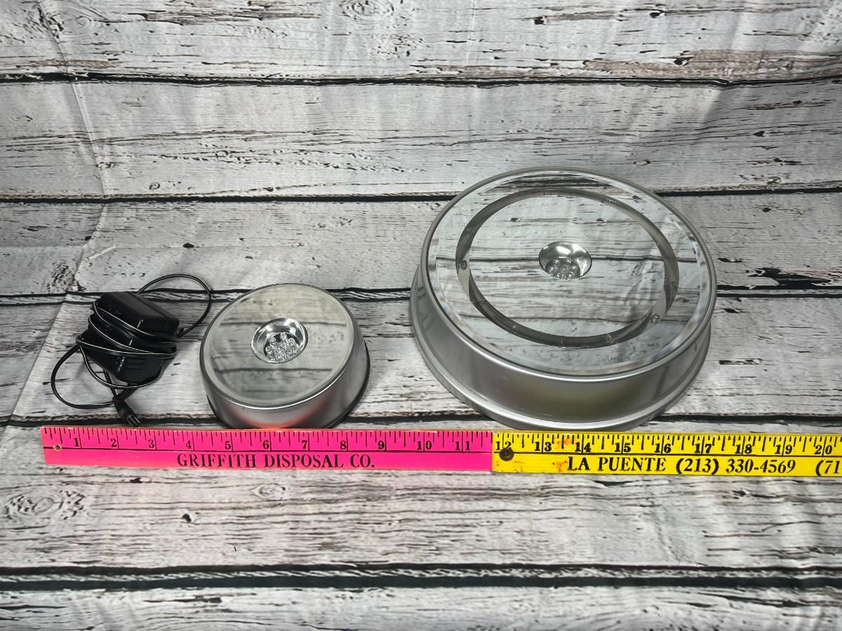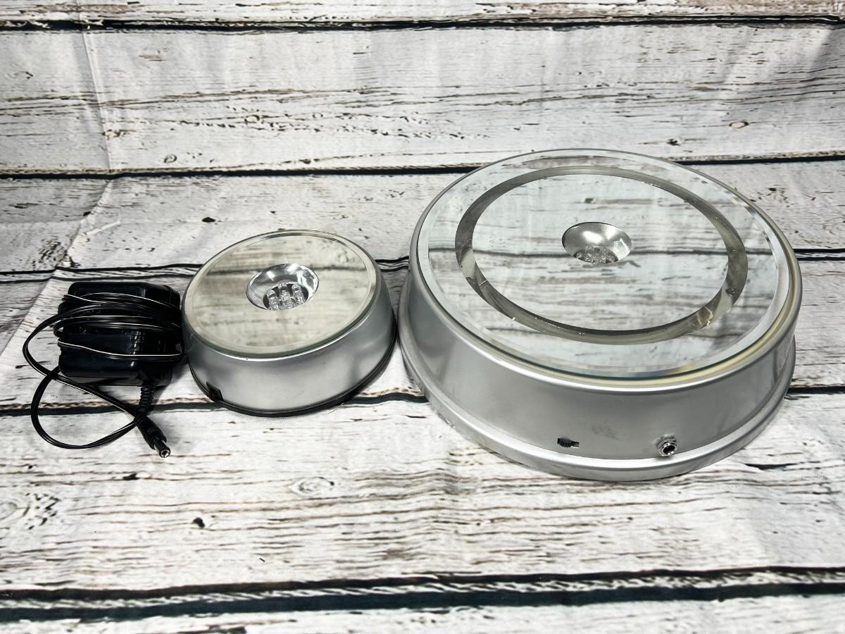 Pair of Electronic Light Up Spinning Rotating Display Stands, there is some light wear, but there is no significant damage to the stands and are in good useable condition. Appears to be powered by a power source and batteries, has been tested and both work perfectly. Comes with one plug in power source, check pictures for more details and for sizing.