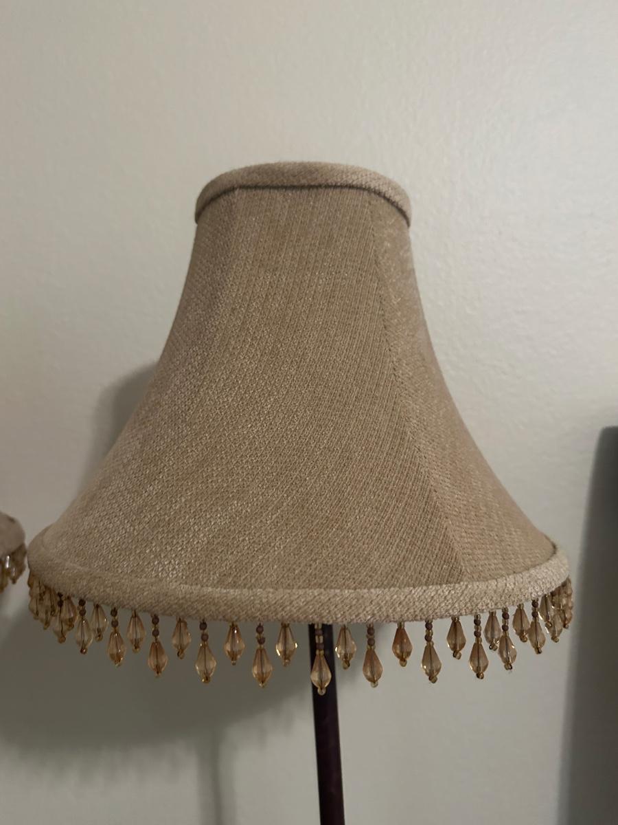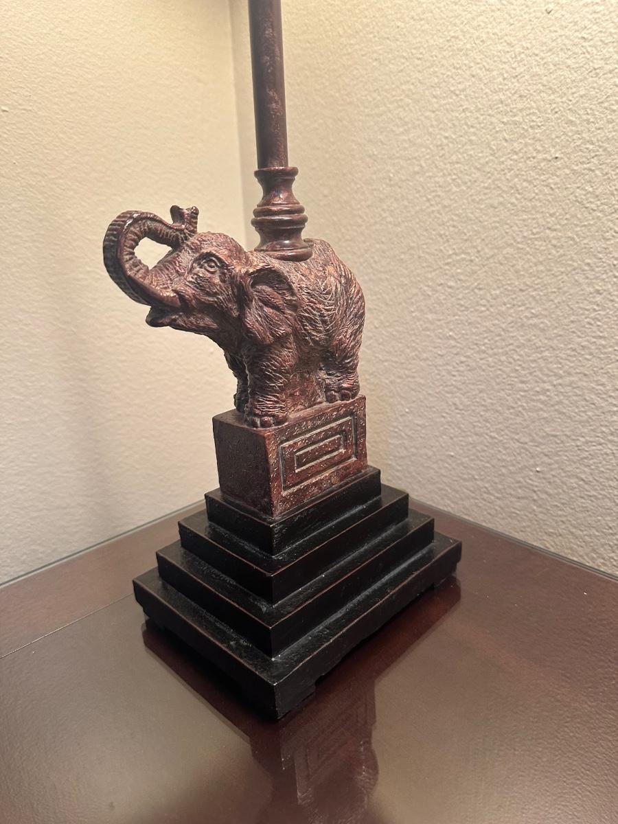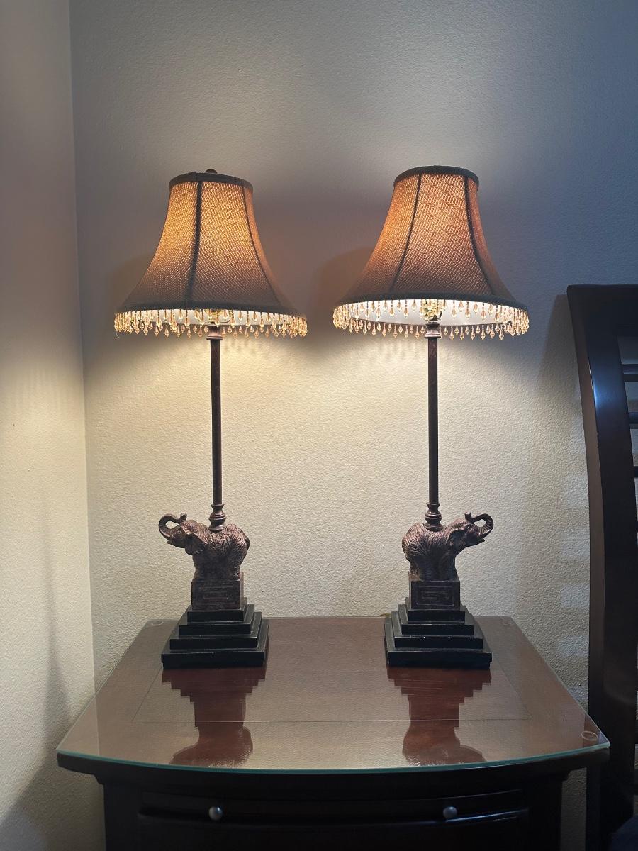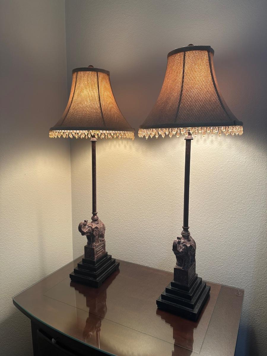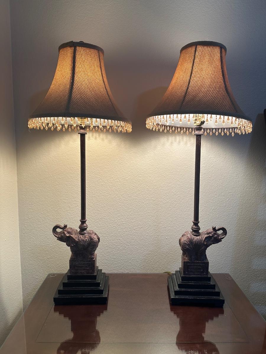 Matching pair of table lamps featuring elephants on stepped bases. Includes fabric shades with decorative beaded trim.