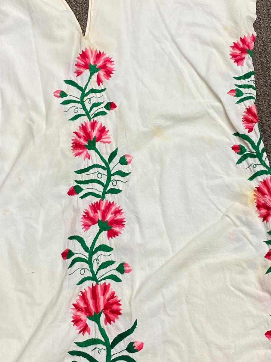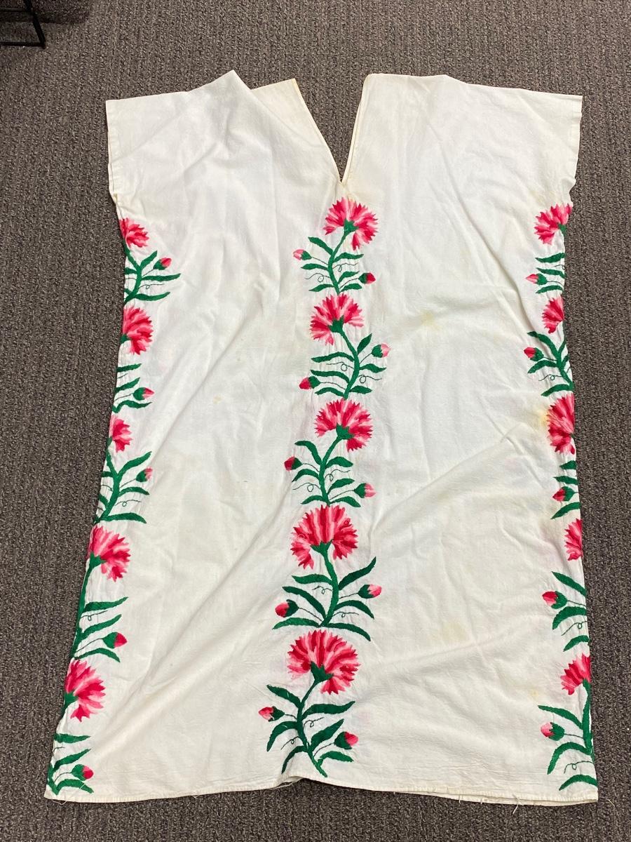 Pair of embroidered Mexican caftans. Knee length. There is quite a bit of spots & yellowing discolor on both, see photos.