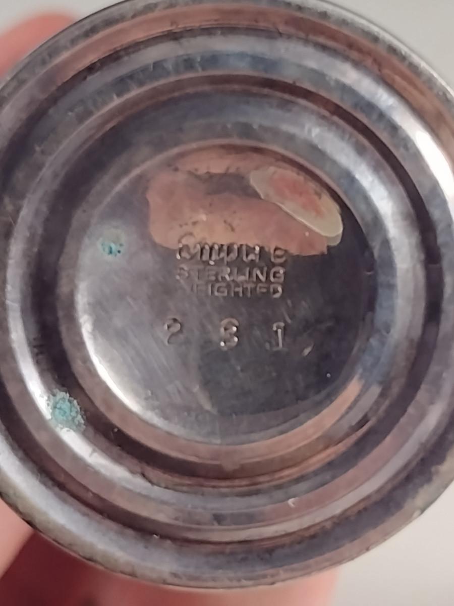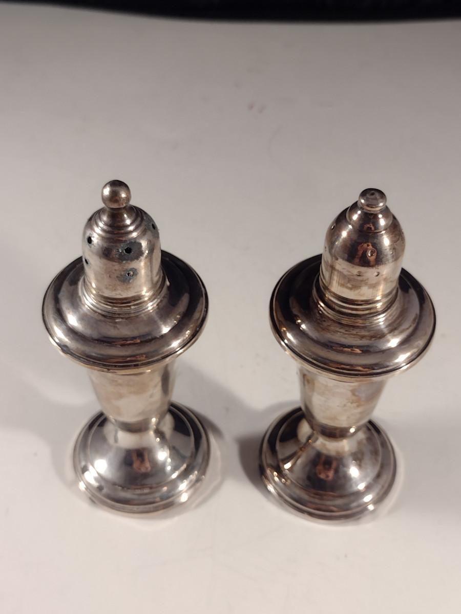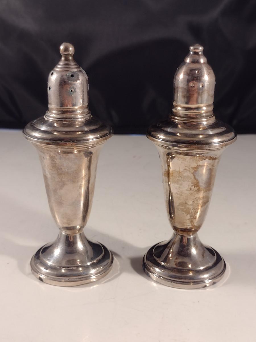 Pair of Empire #231 Weighted Sterling Silver Salt and Pepper Shakers (#1). Salt shaker has oxidation- please see all pictures for condition.