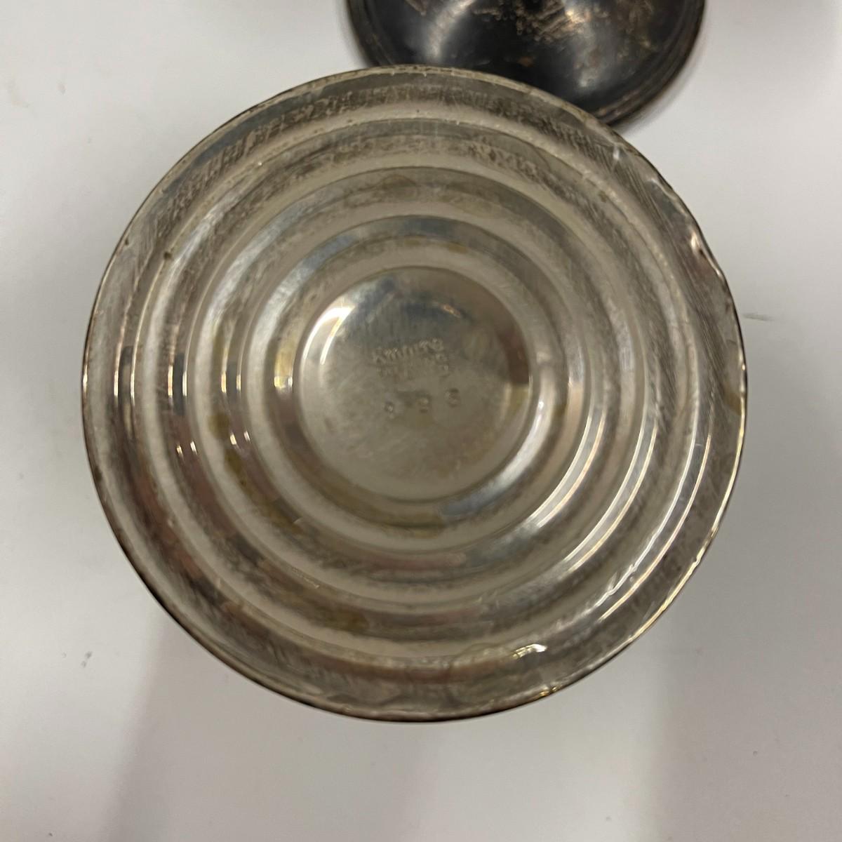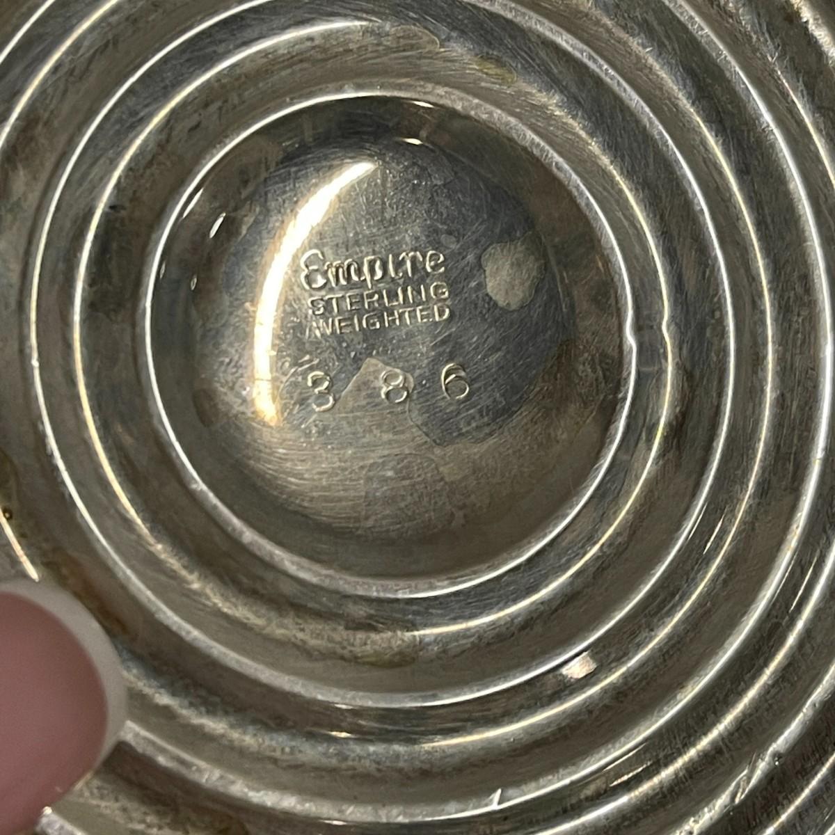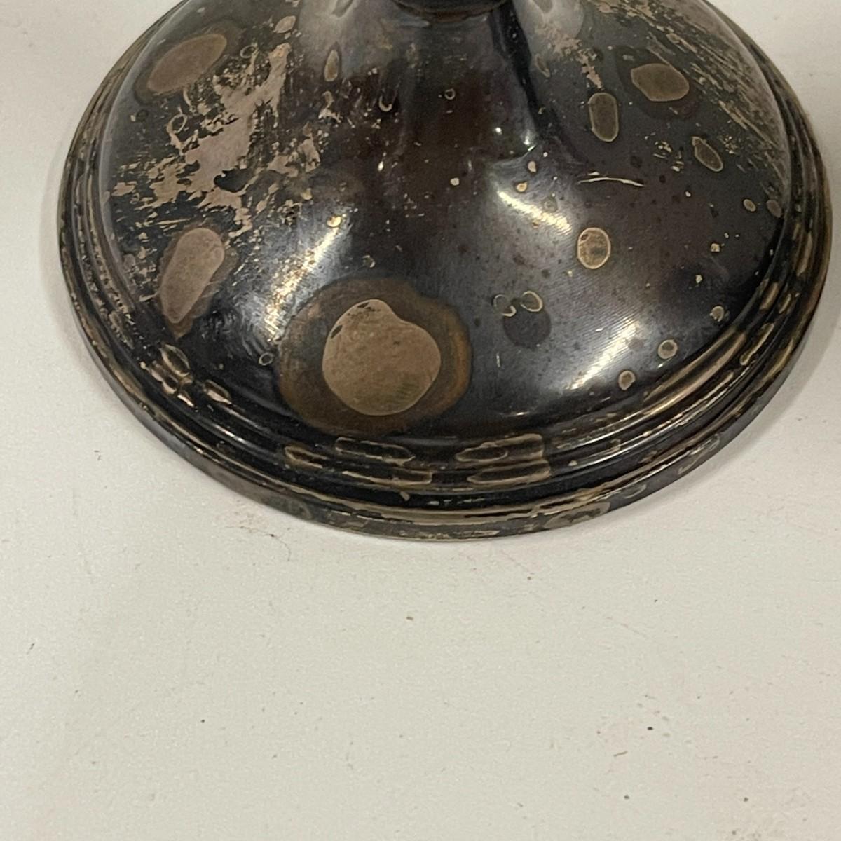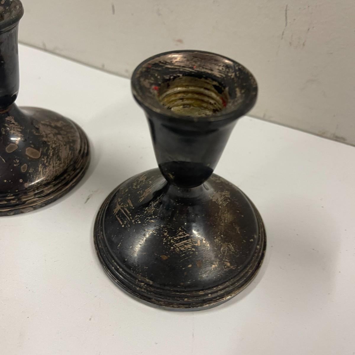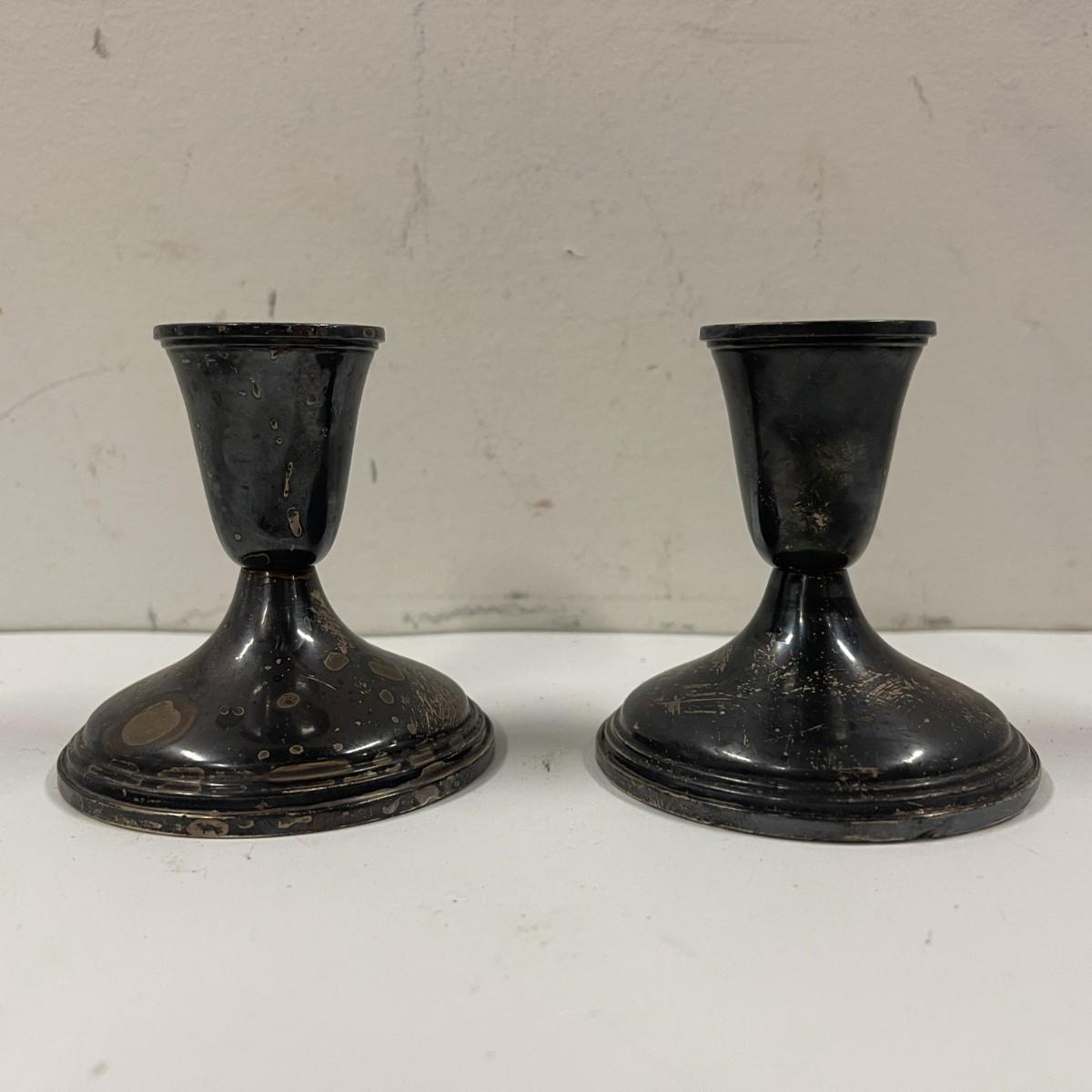 Pair of vintage Empire weighted sterling silver candlesticks. Very tarnished and bent around the rim a bit. 3 1/4" high x 3".