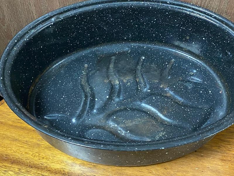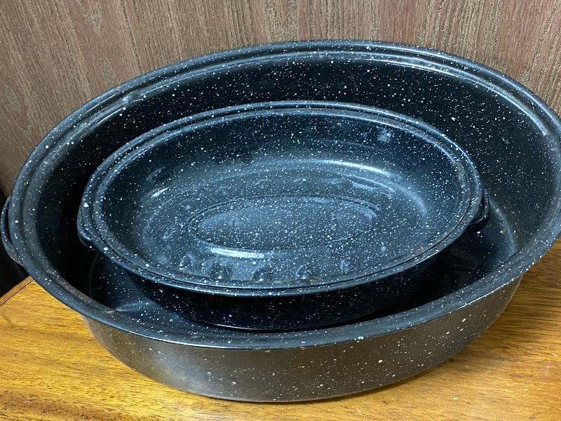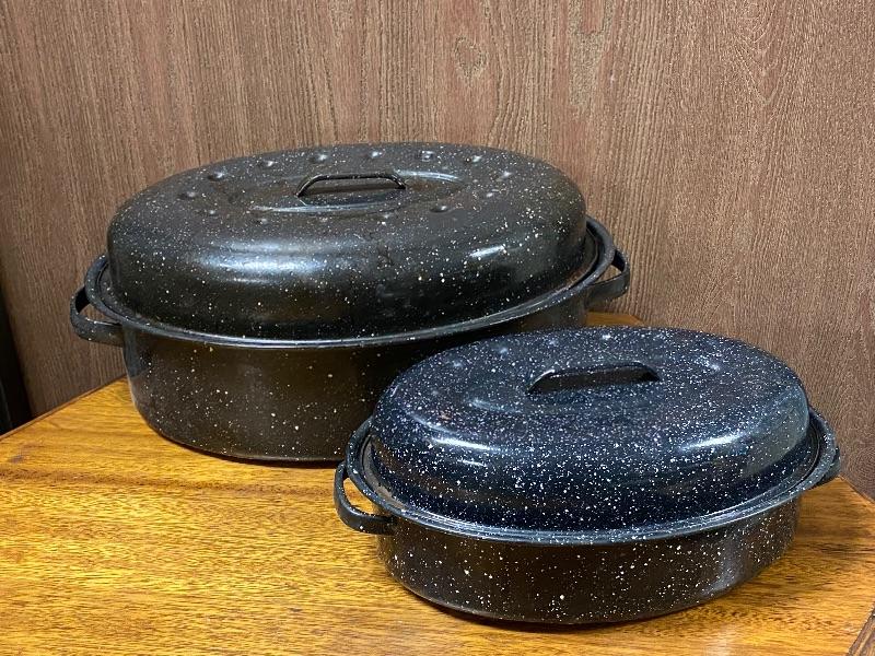 Pair of Black Speckle Enamel Roaster Pans. Both have lids. Good Condition, previously used.
