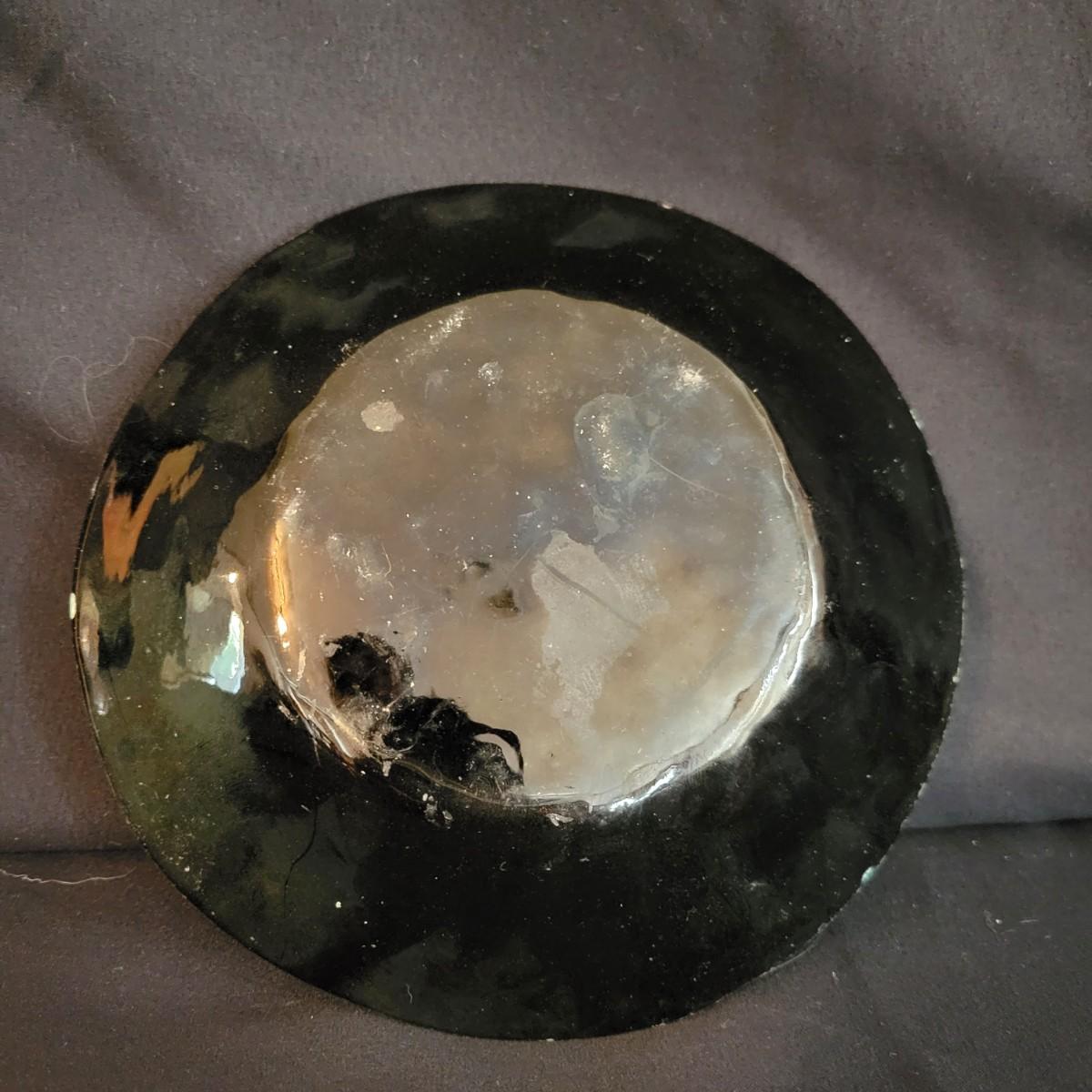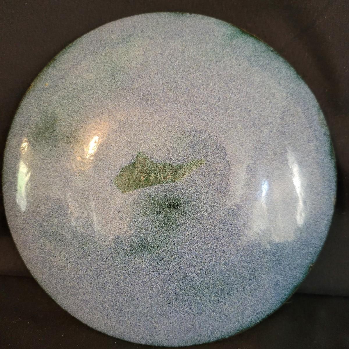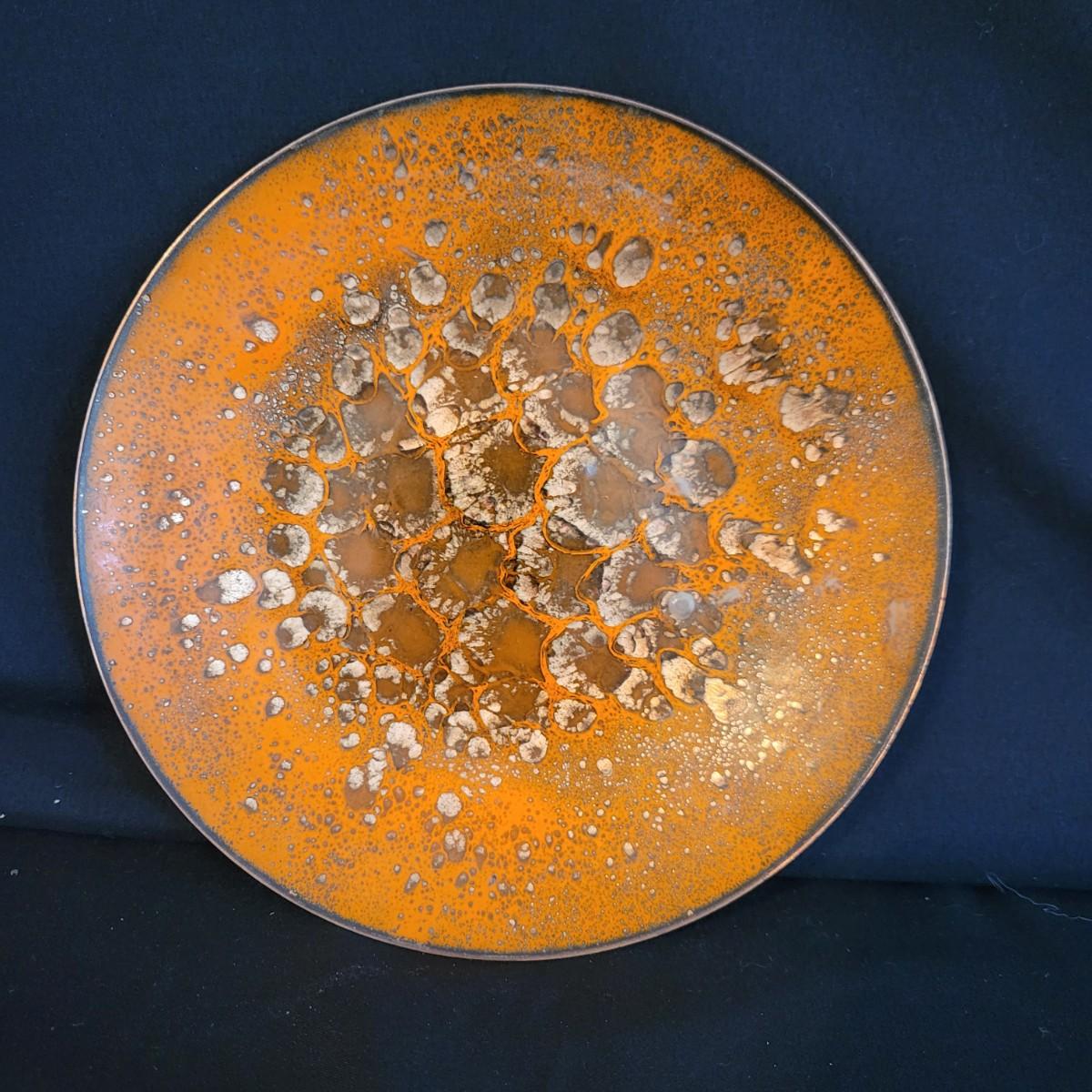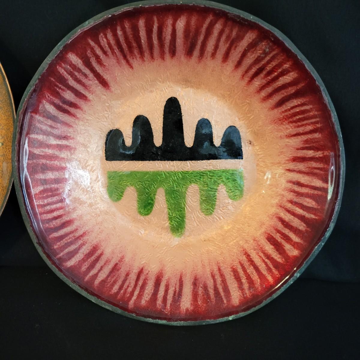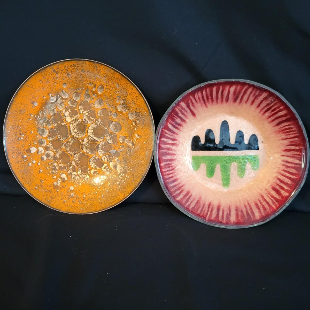 A pair of enameled bowls with vivid glazing. The larger orange-tinted bowl measures approximately 7"D and has a stamp of North Carolina with what appears to be "Theo" etched into it. Shipping available
