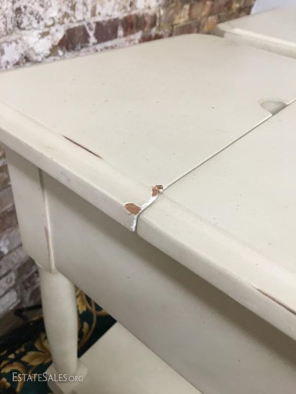 Some nicks and scrapes on this set see photos. Built in power strip and USB charging ports in hinged back area or the table. Single drawer. Measure 24" tall, 14" wide and 22" deep.