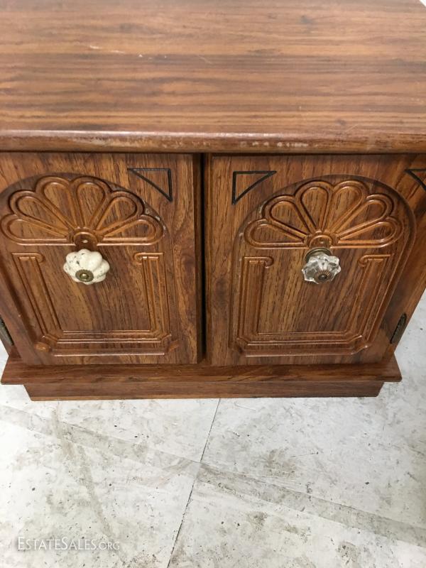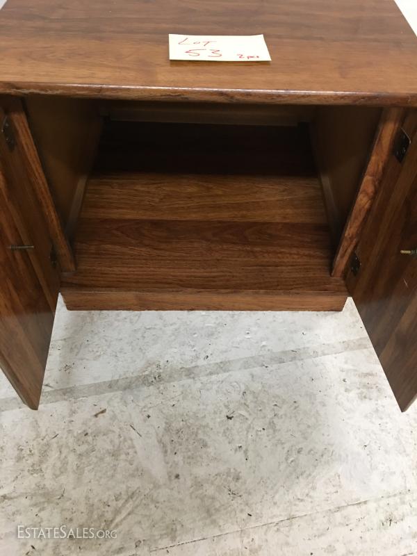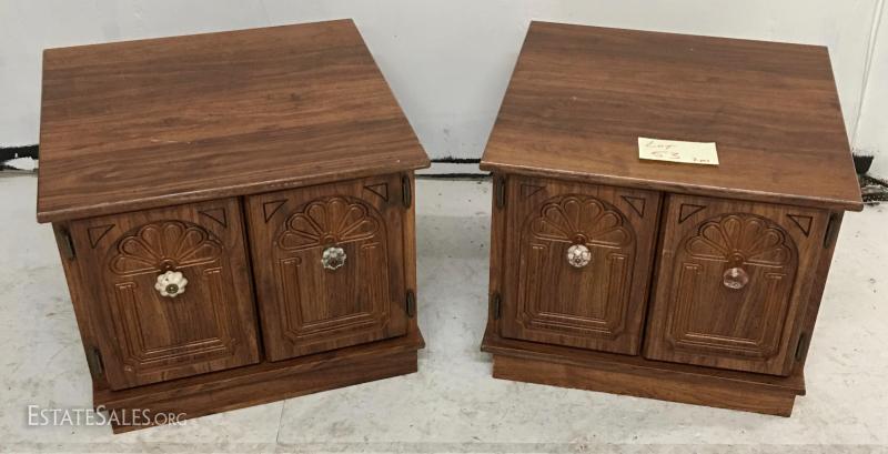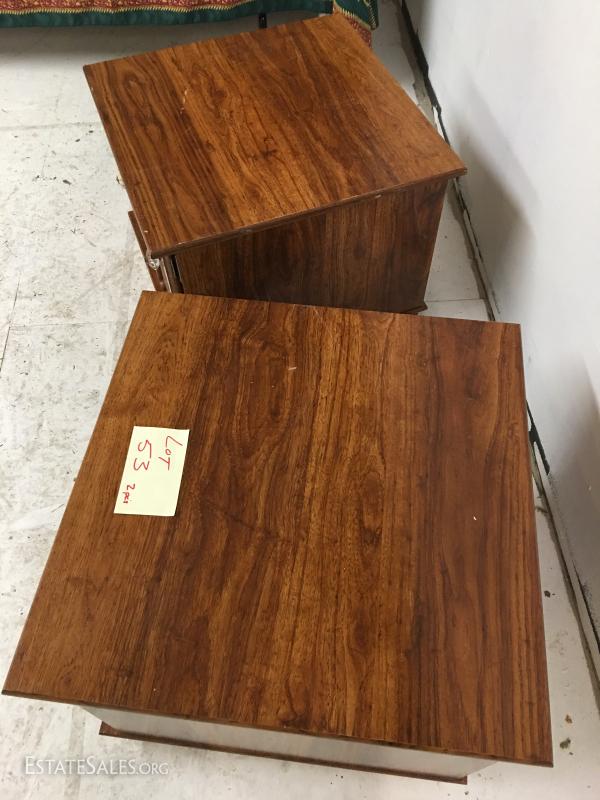Two end tables, Faux wood finish over particle board. Measure 24" square and 19" tall. Some wear to edges, doors all work good, mismatched handles.