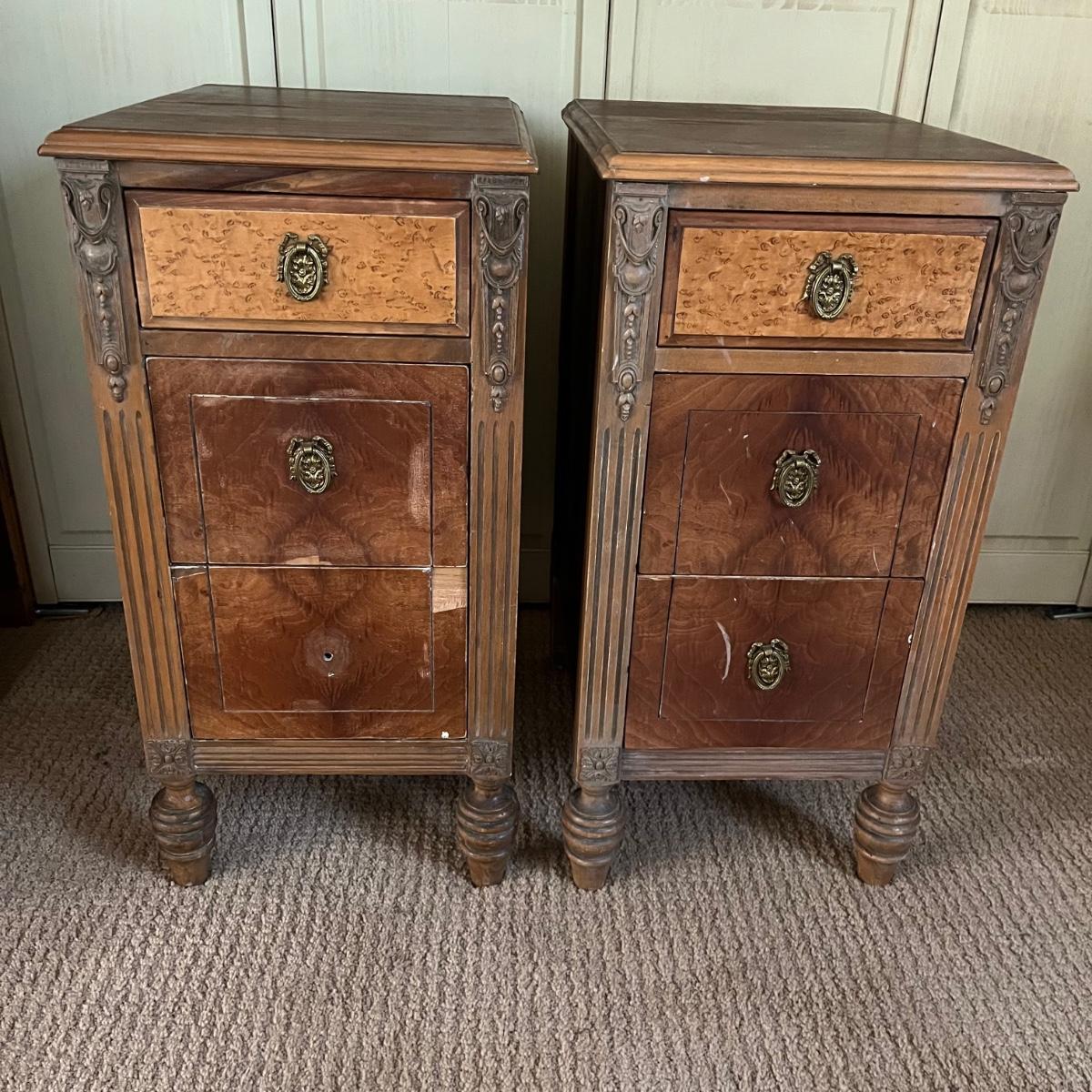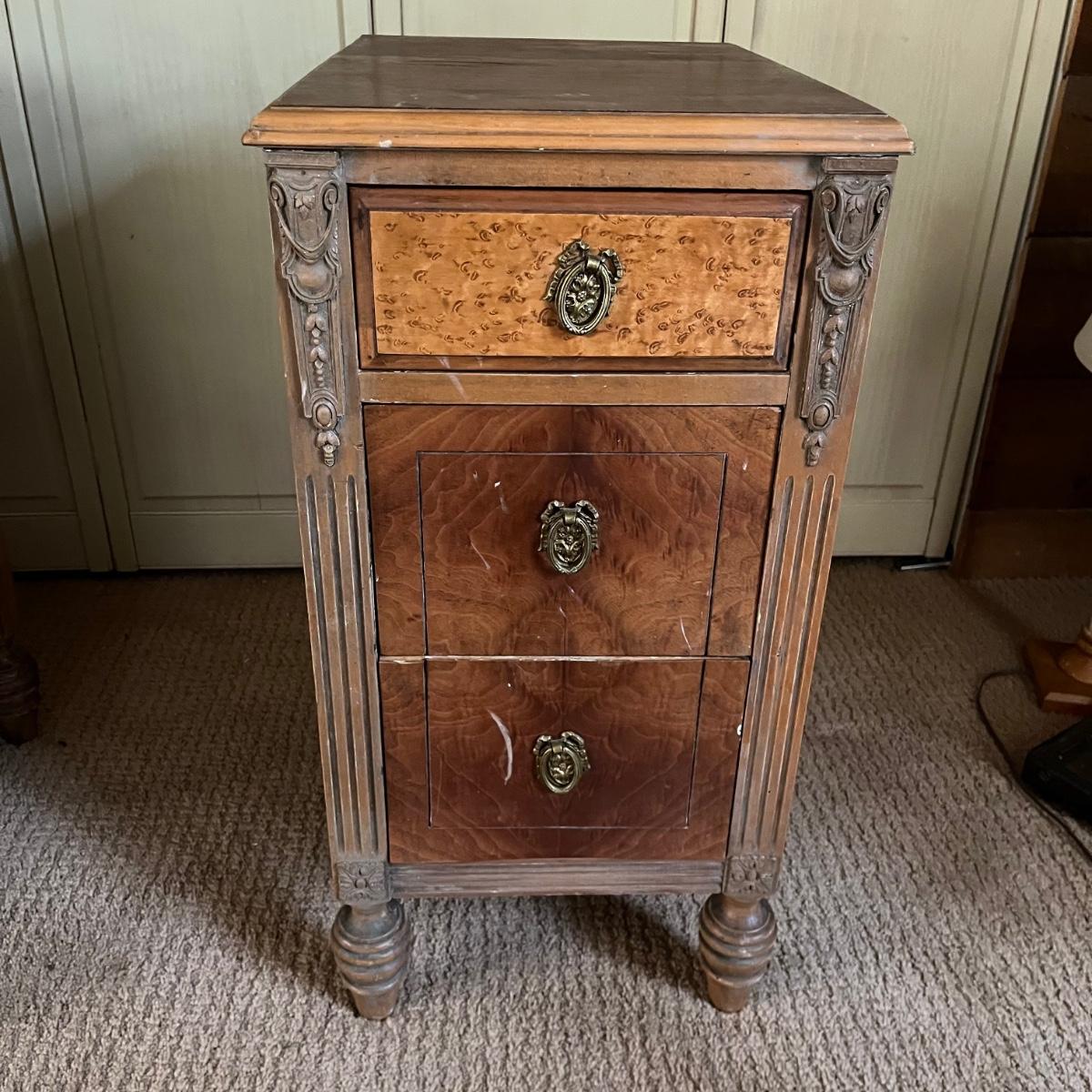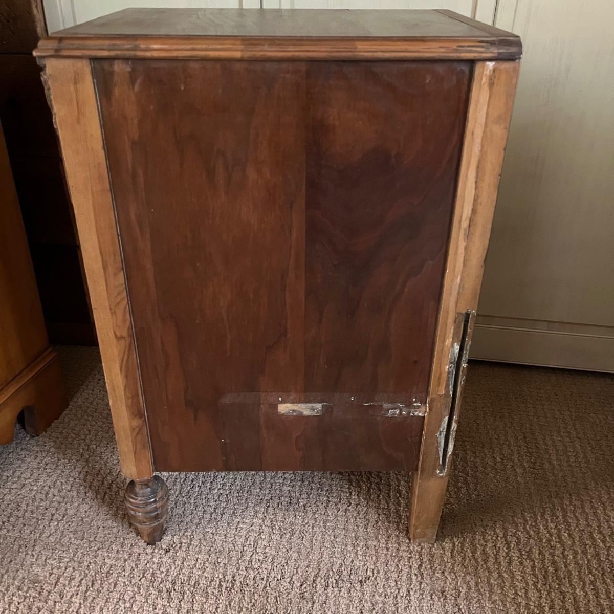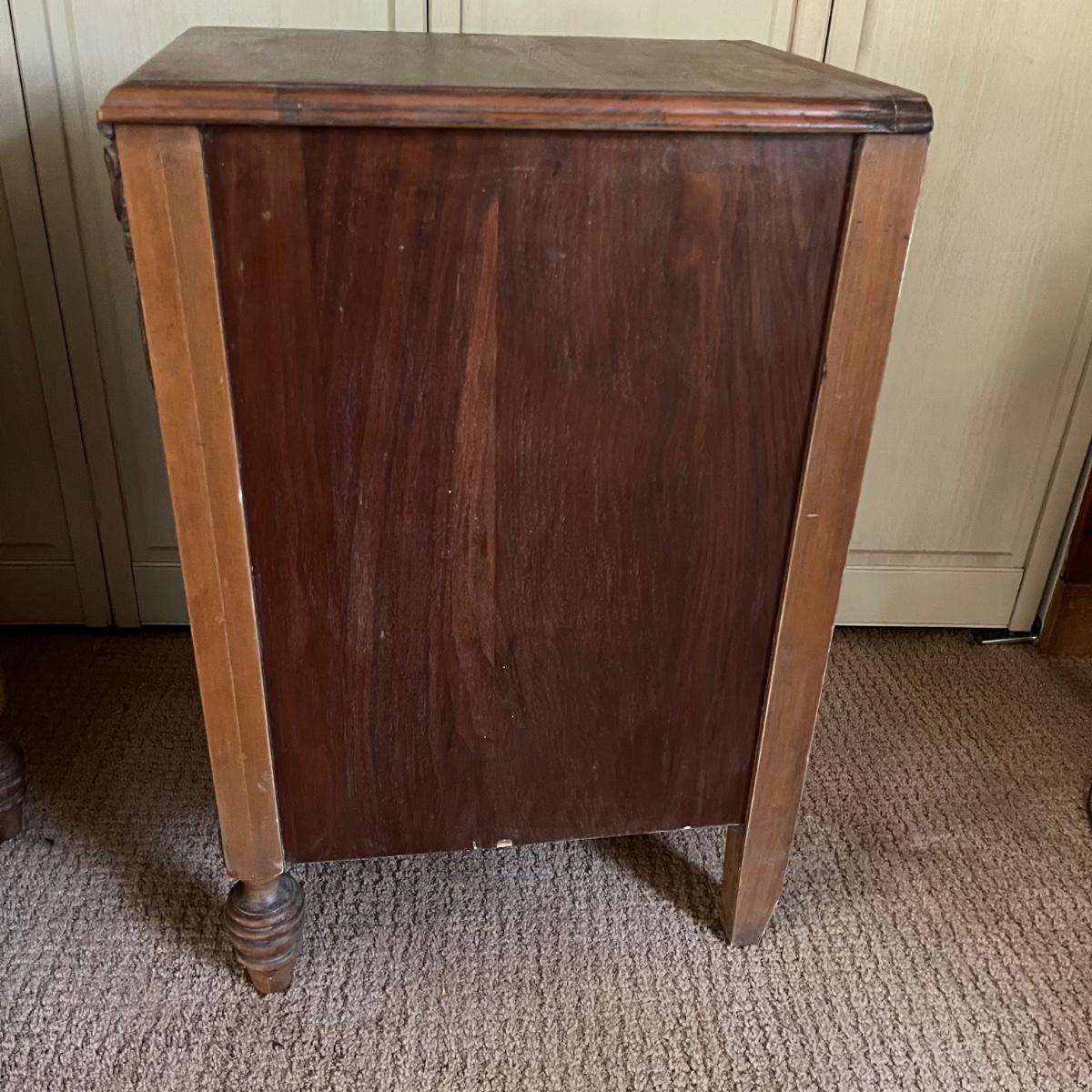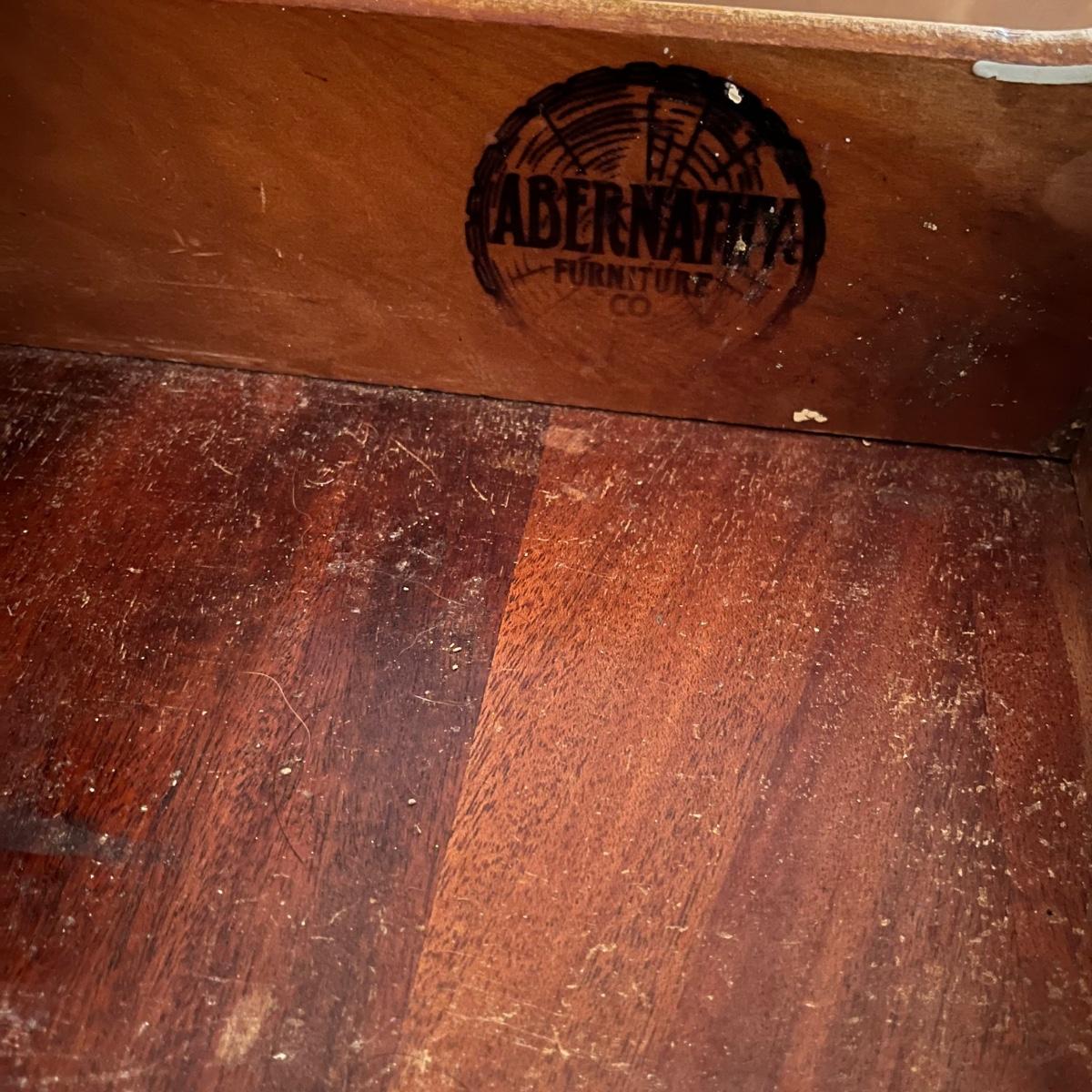 These two matching Abernathy Furniture Co. end tables have three drawers each. Some of the veneer is chipped and loose and one handle is missing, see pictures. Tables measure 13.5” x 15” x 27.5”. There is a matching chest of drawers in the next lot.