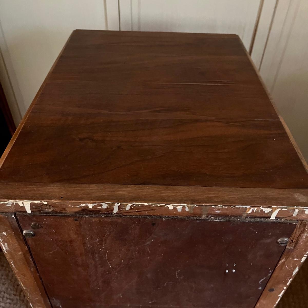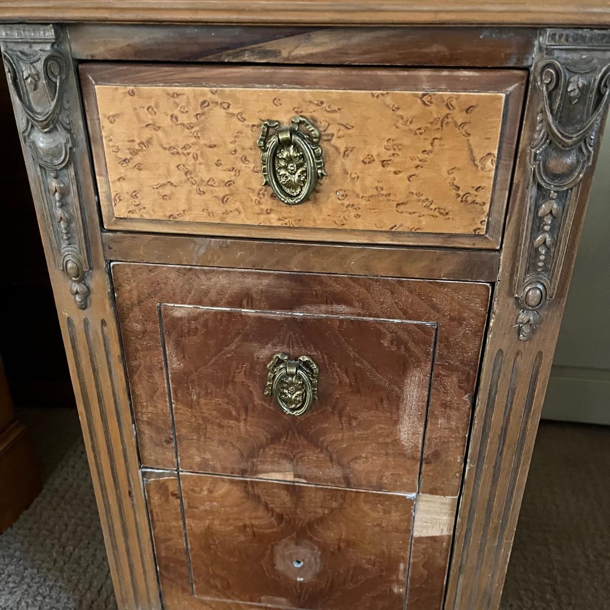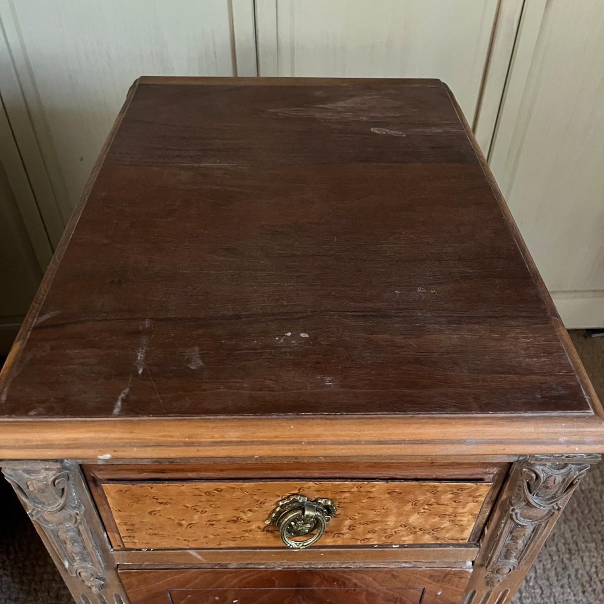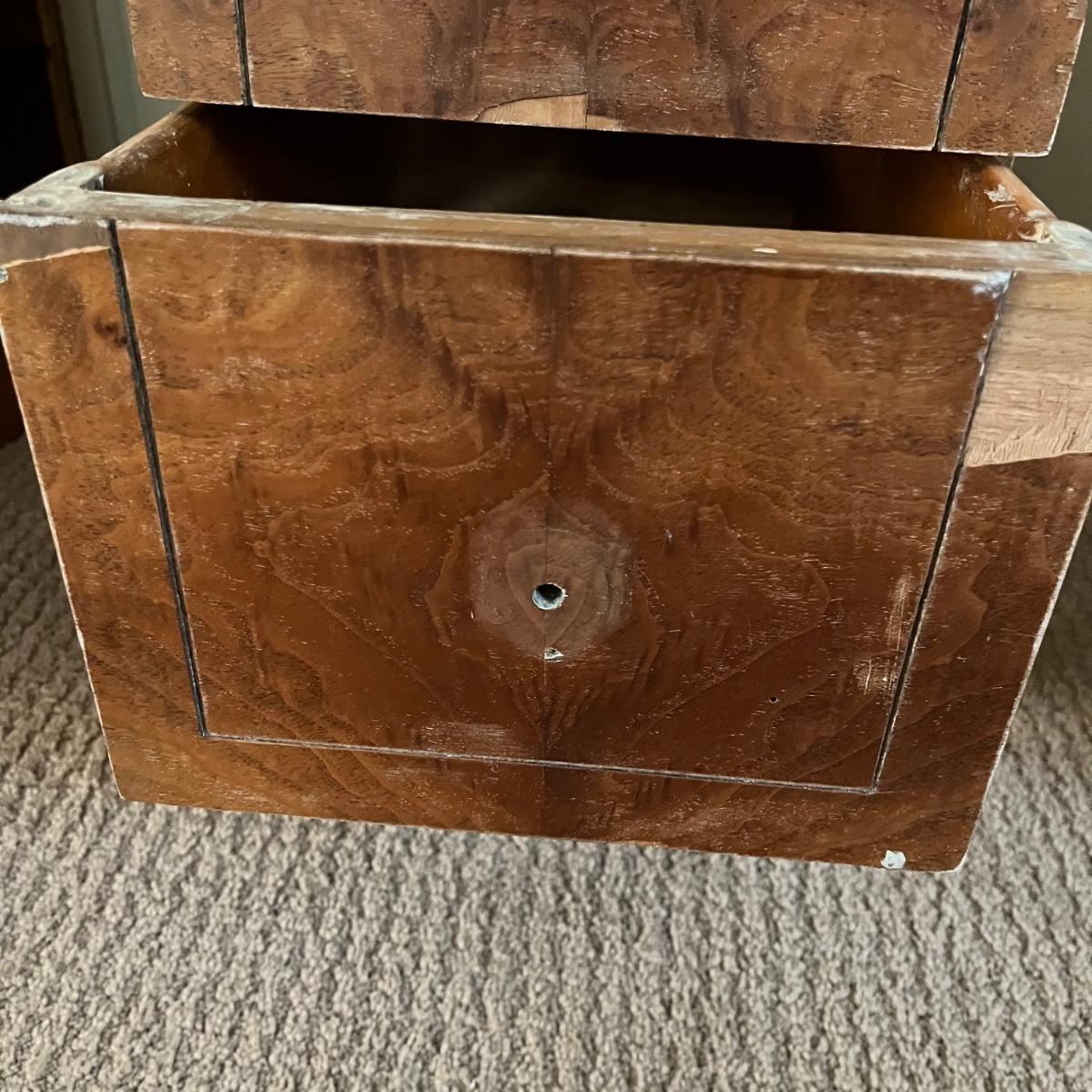 These two matching Abernathy Furniture Co. end tables have three drawers each. Some of the veneer is chipped and loose and one handle is missing, see pictures. Tables measure 13.5” x 15” x 27.5”. There is a matching chest of drawers in the next lot.
