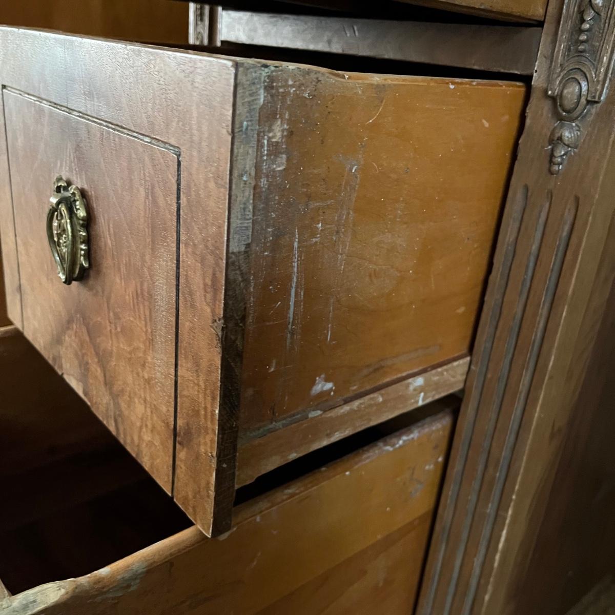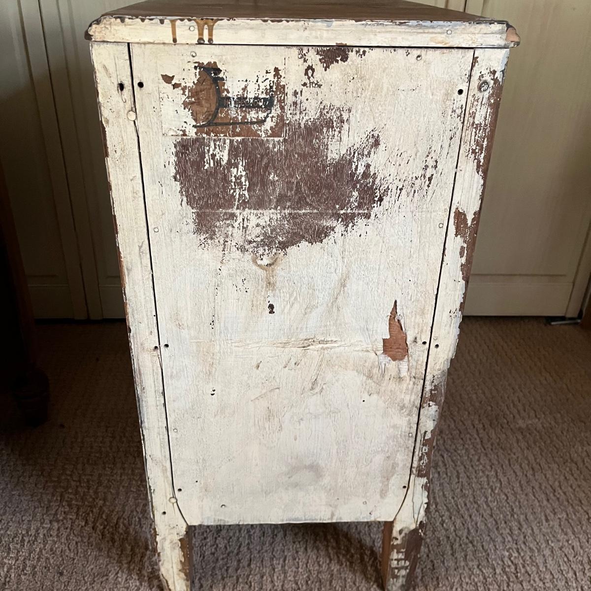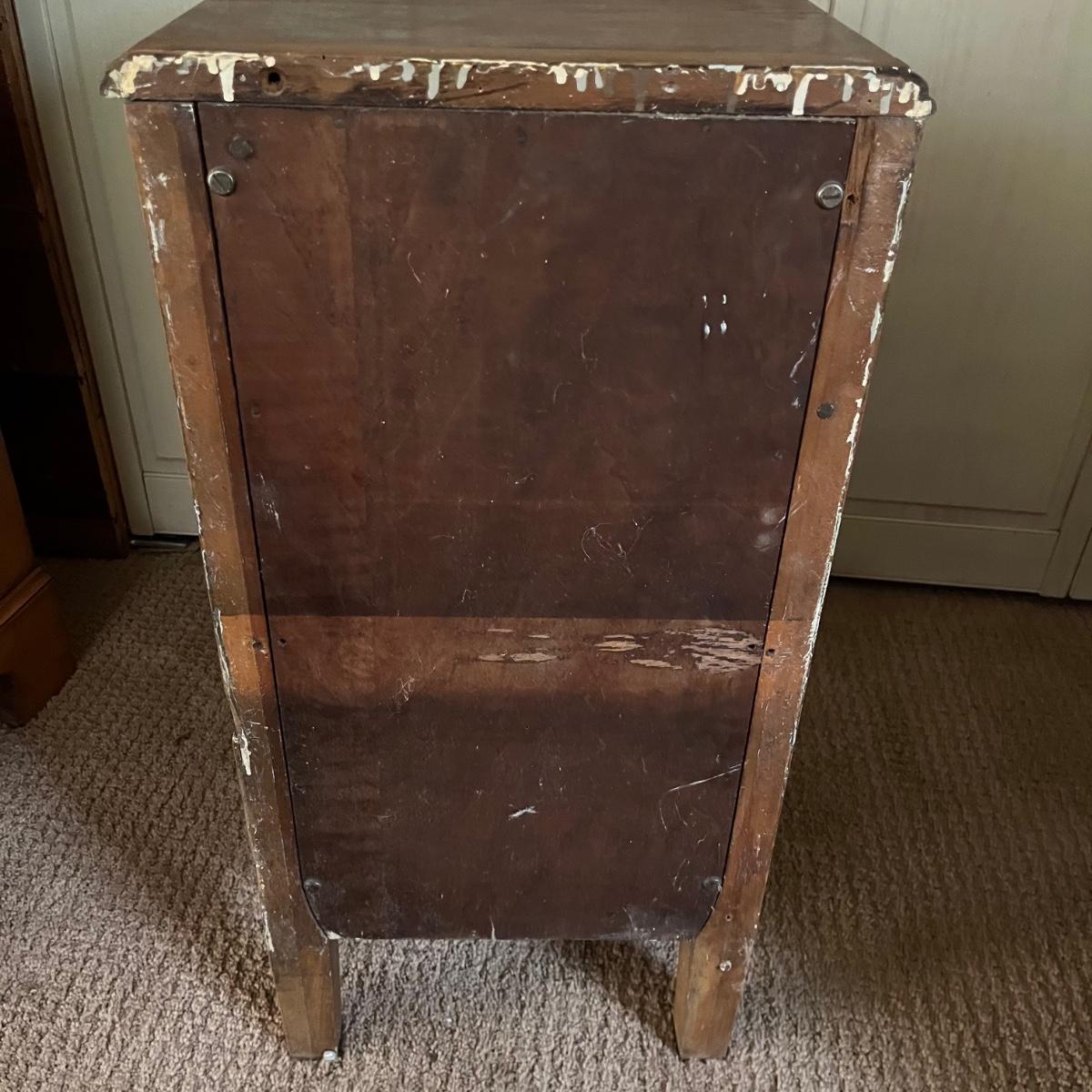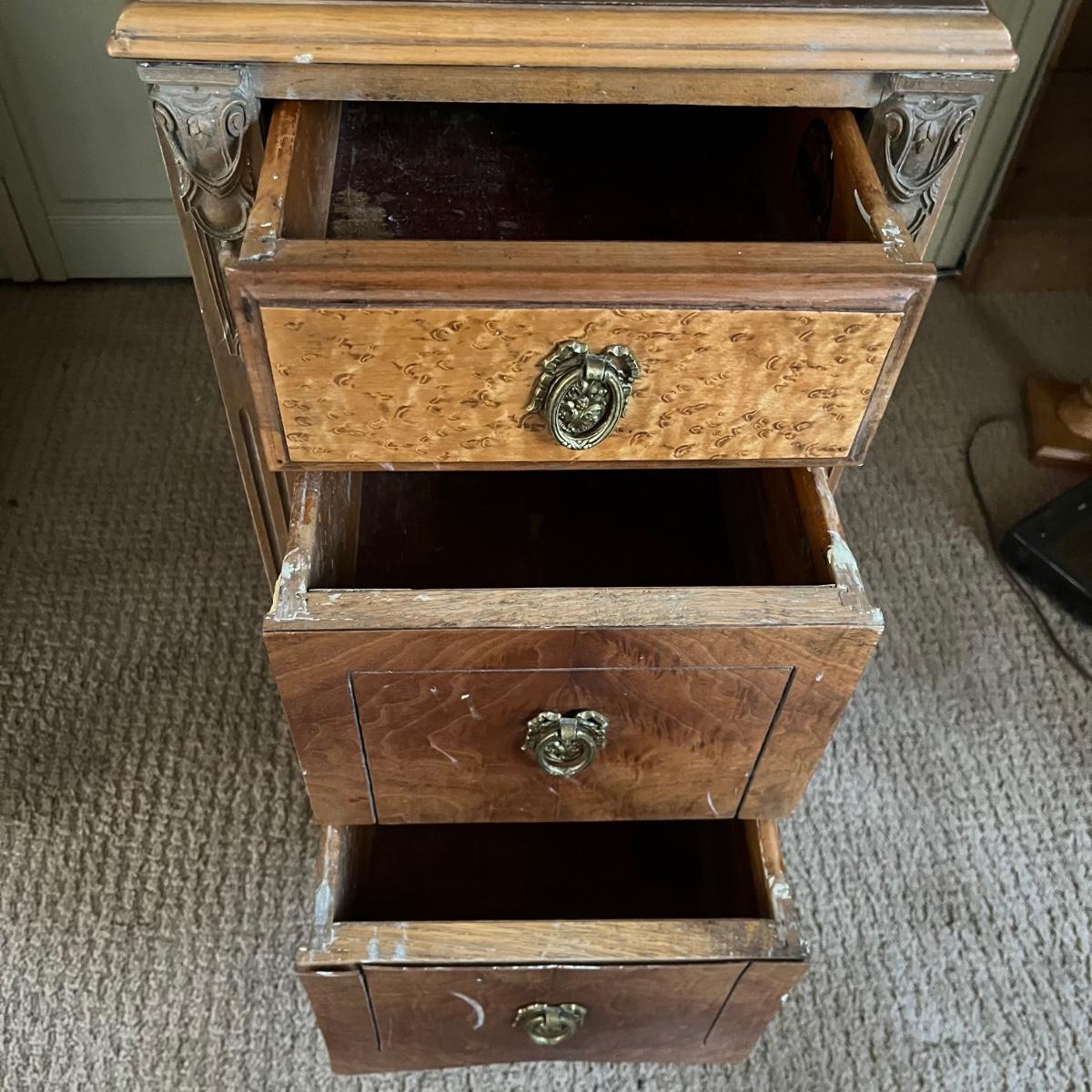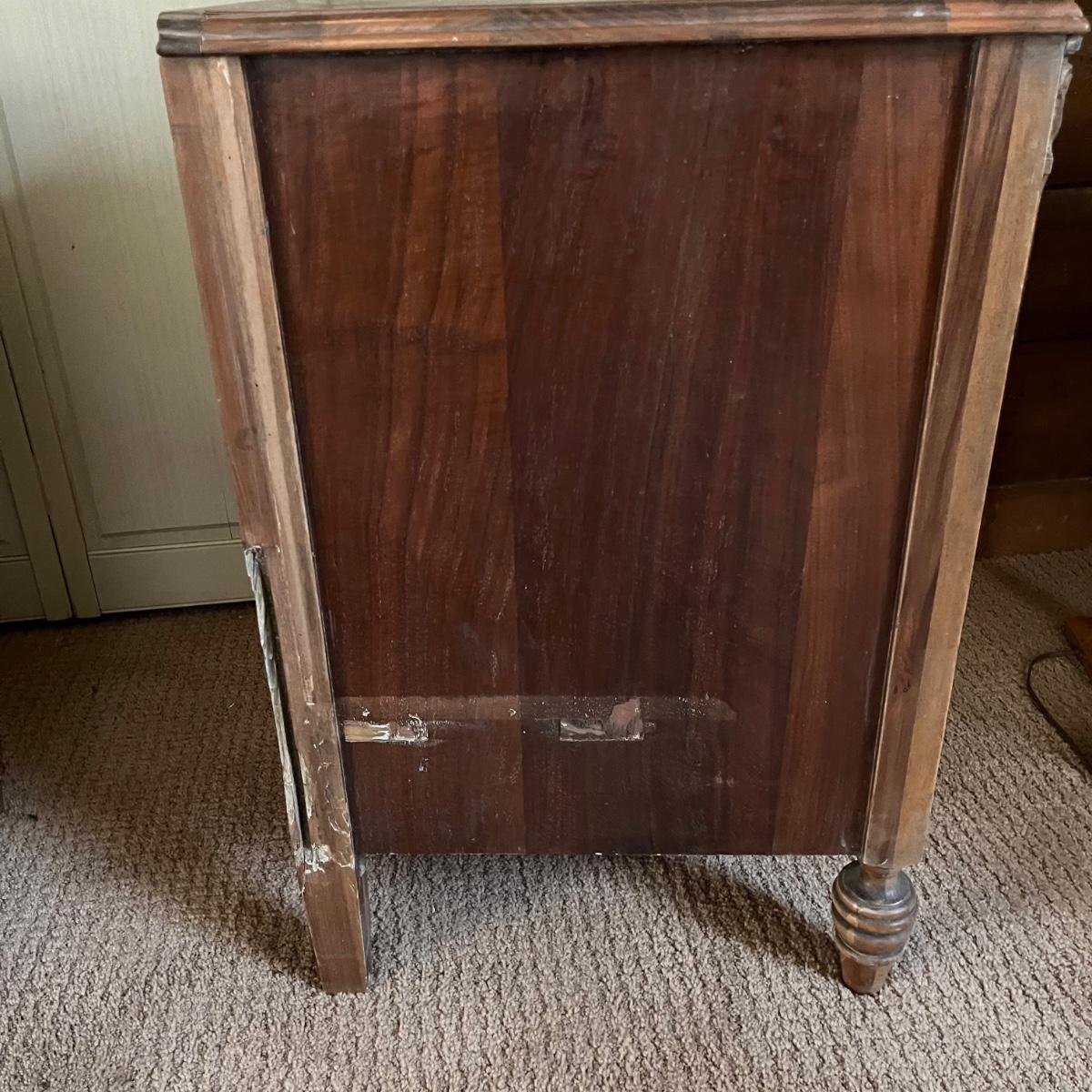 These two matching Abernathy Furniture Co. end tables have three drawers each. Some of the veneer is chipped and loose and one handle is missing, see pictures. Tables measure 13.5” x 15” x 27.5”. There is a matching chest of drawers in the next lot.