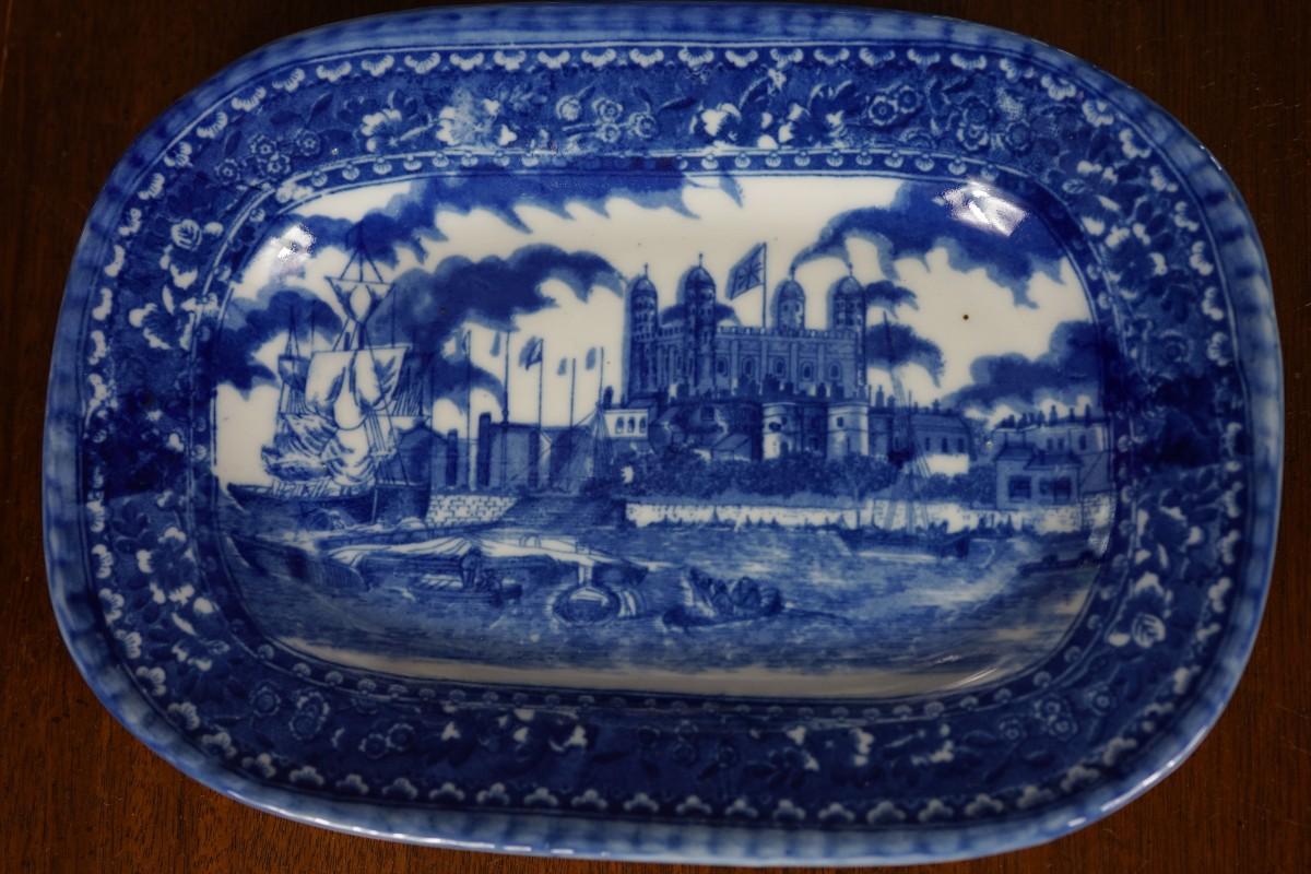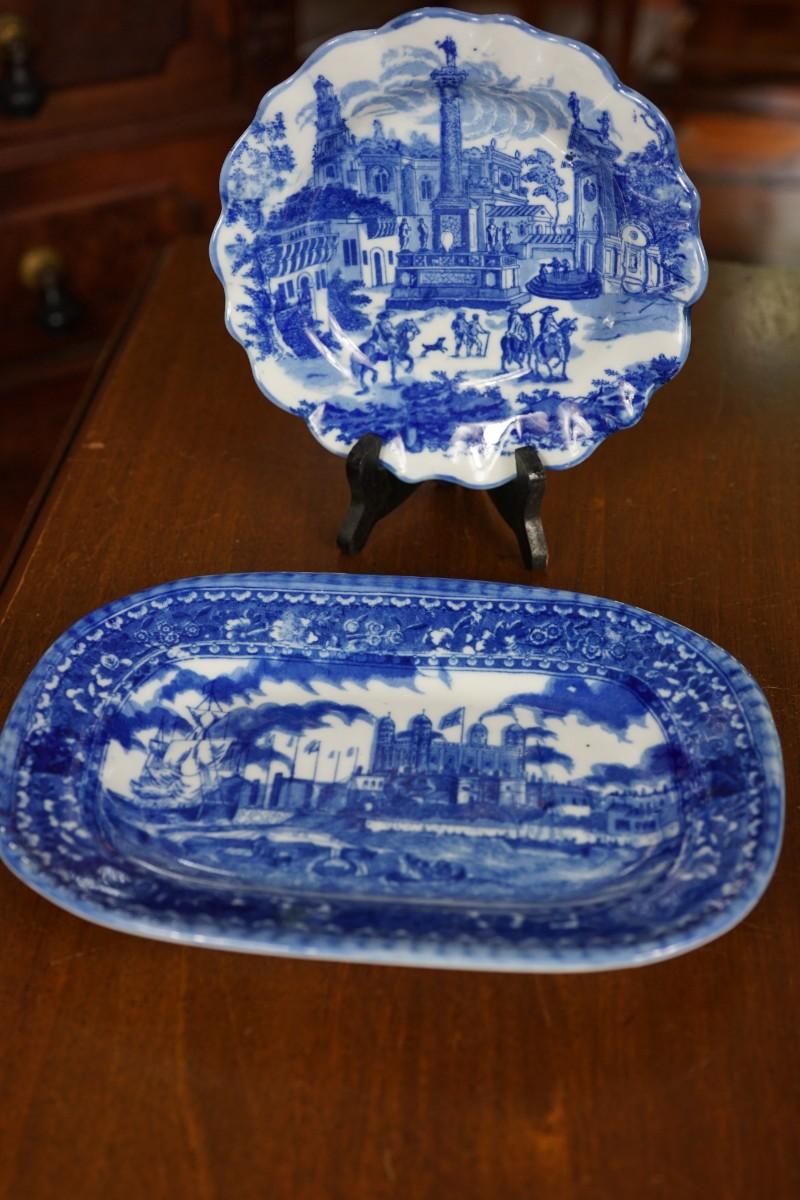 PAIR OF ENGLISH FLOW BLUE TRANSFER WARE PLATES AND OVAL SMALL PLATTER