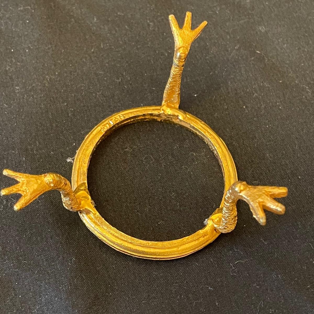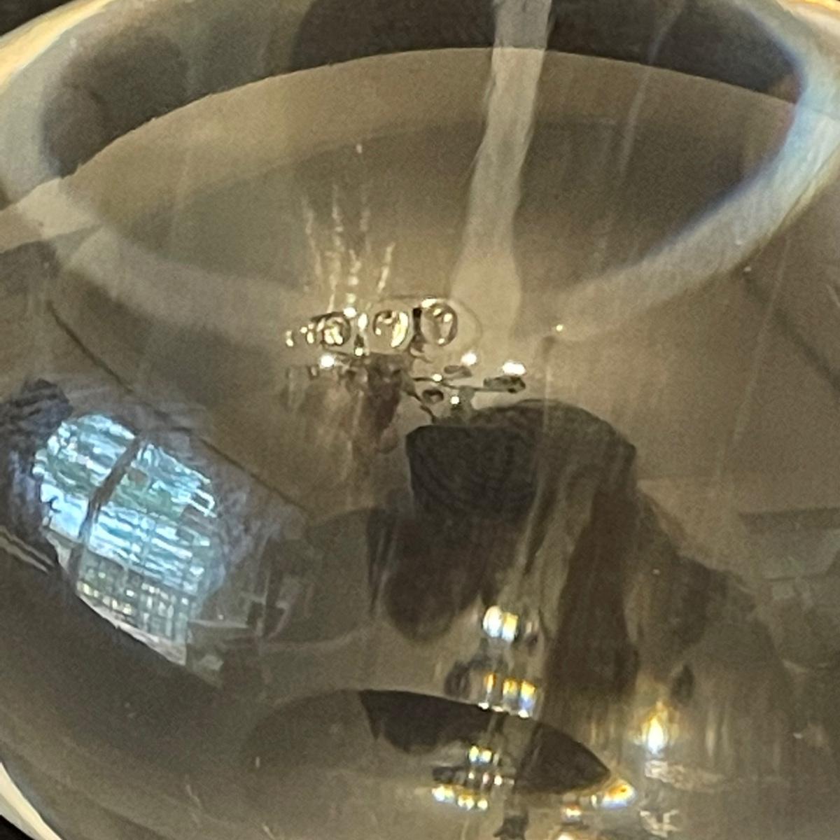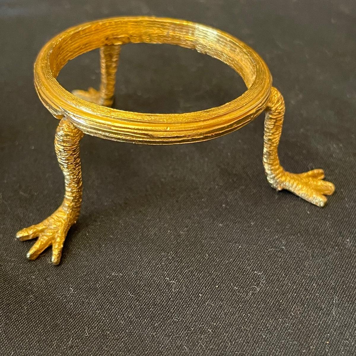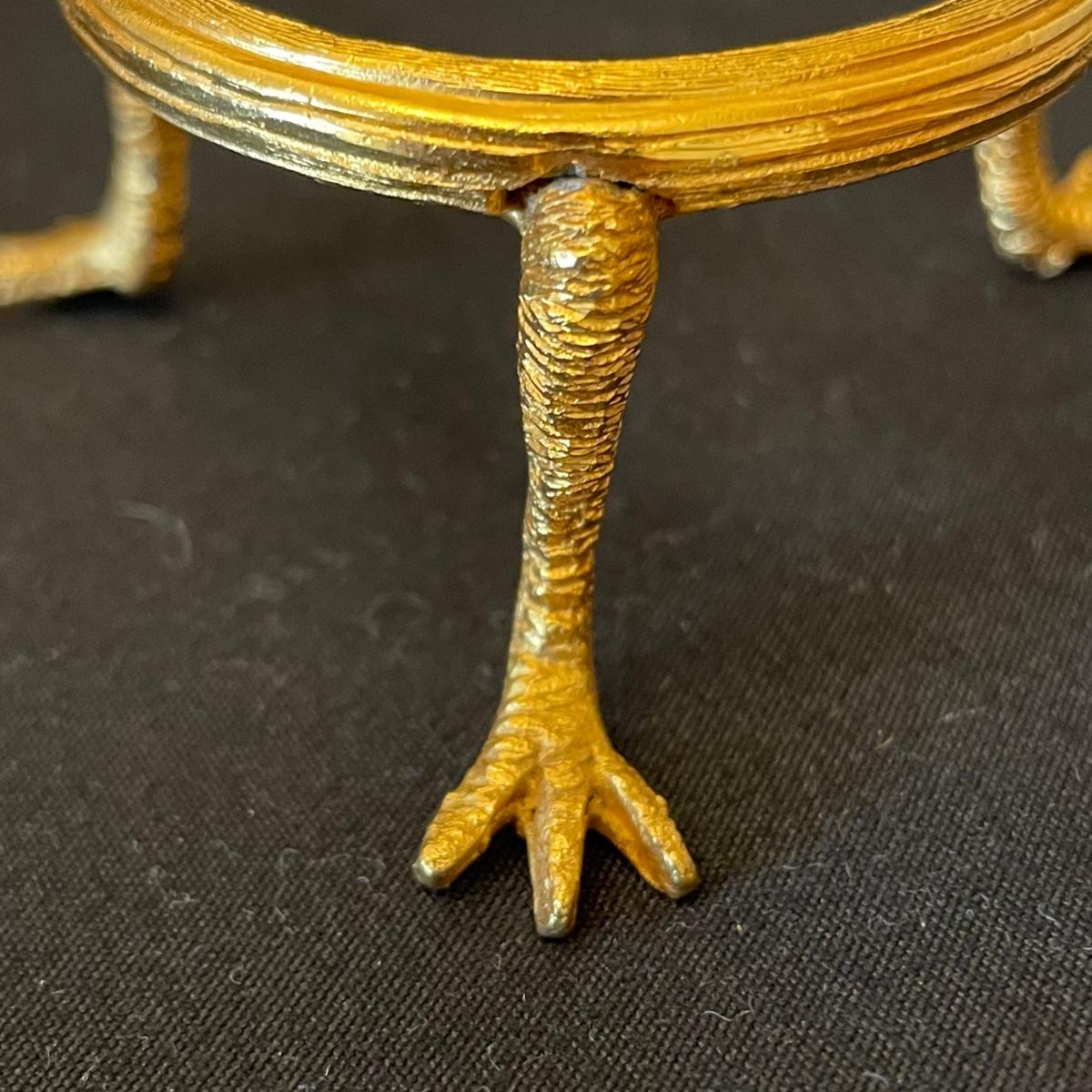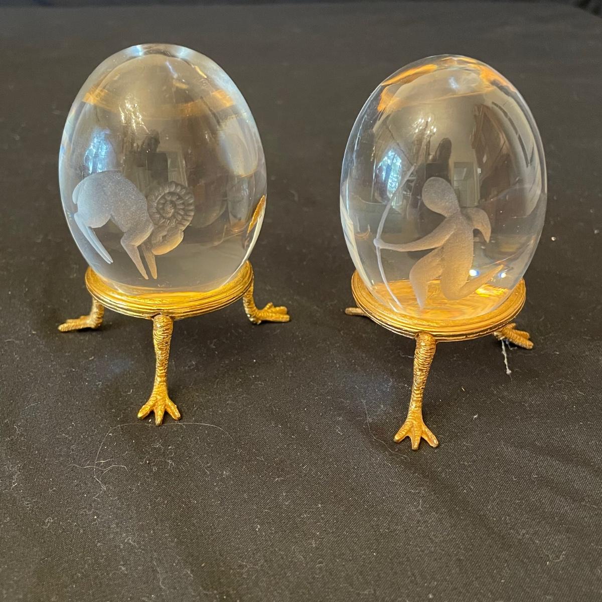 This pair of etched glass paperweights are probably Swedish made Ekanas pieces and would therefore be lead Crystal but their markings are indecipherable. They each have gold colored stands with chicken legs.