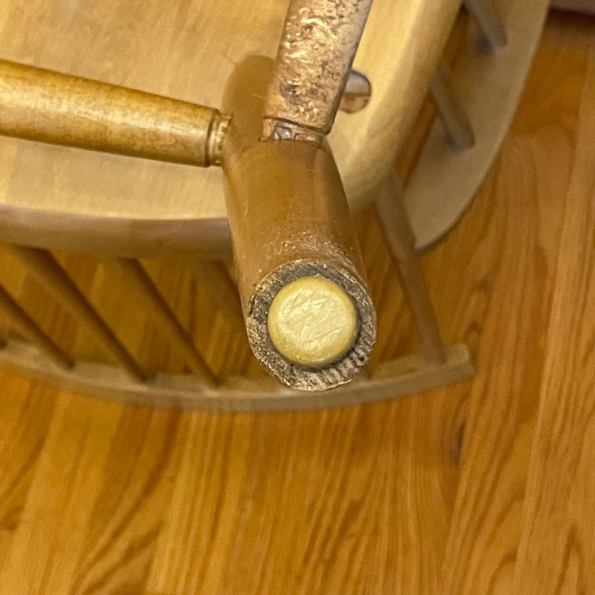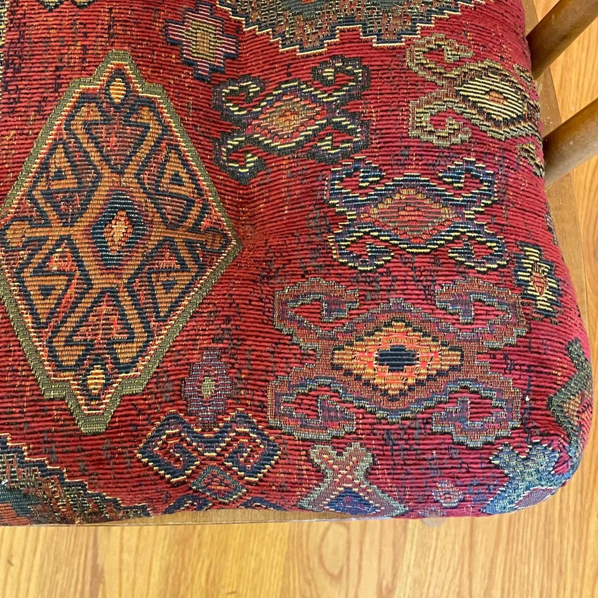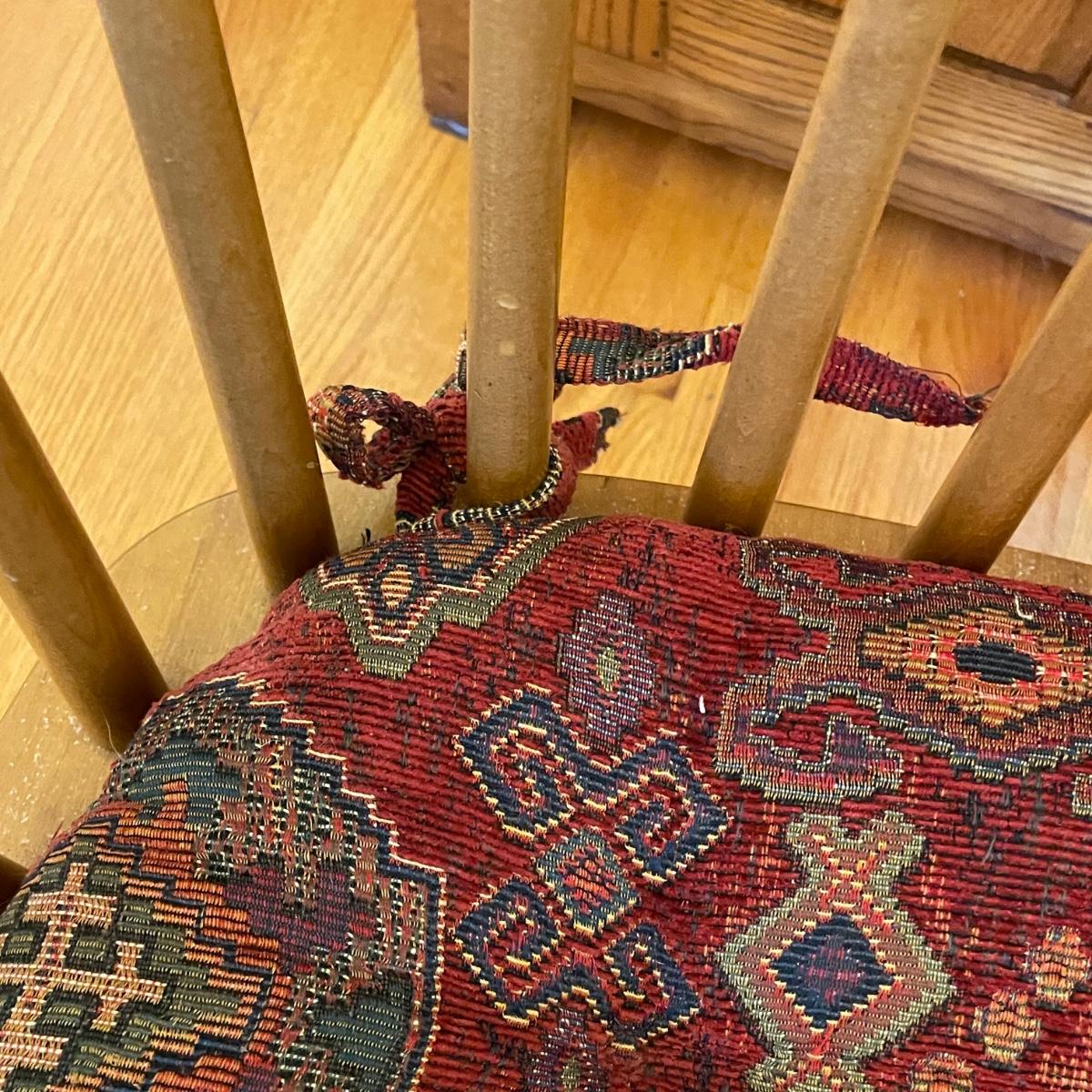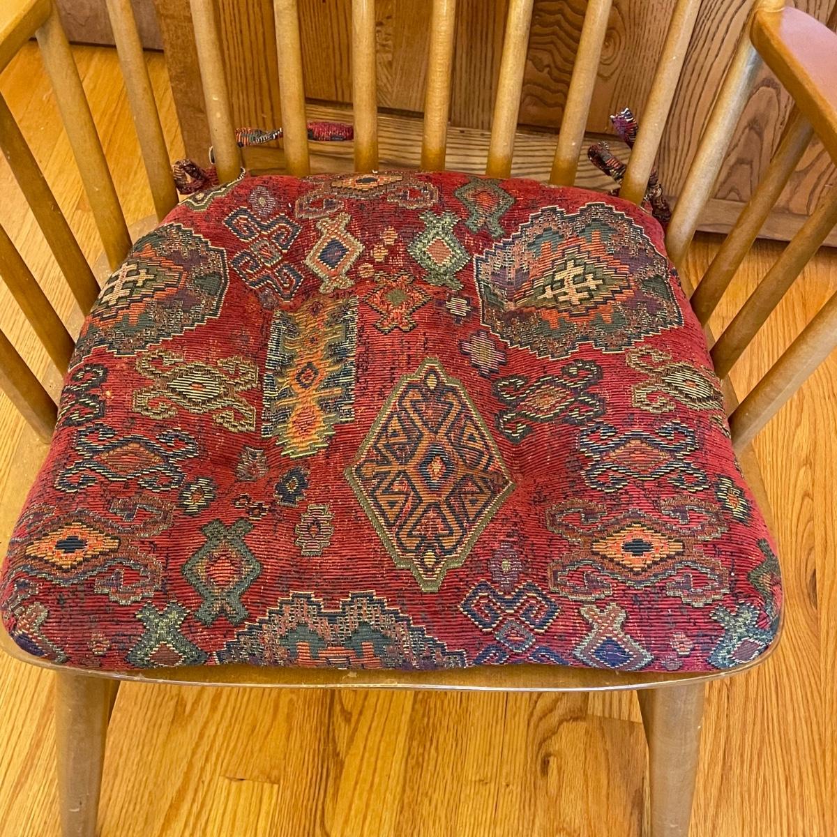 A matching pair of solid wood shaker style chairs in great condition with just a few light scratches on the one, see images. These solid wood chairs have protective pads on the base of each leg. They each come with removable cushions that tie on to the backs of the seats plus a third cushion as a spare; they are a deep red color with diamond shaped designs.