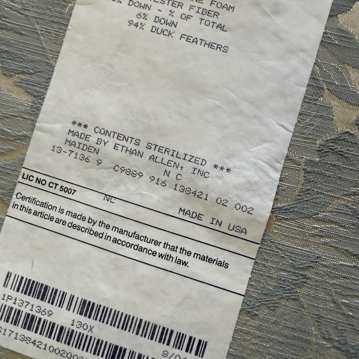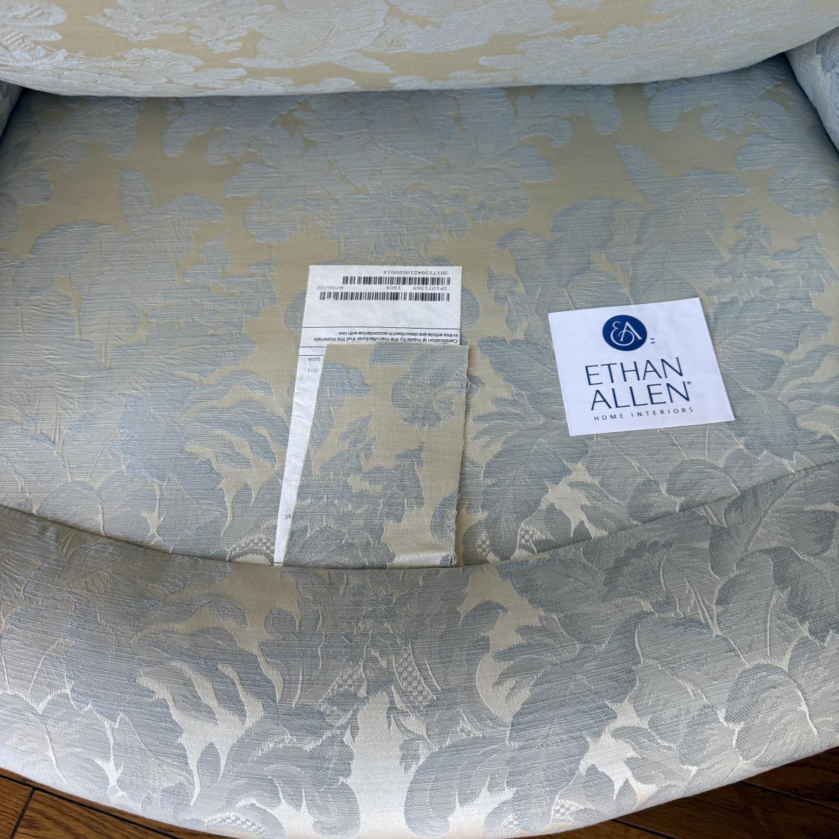 This lot contains two luxurious Ethan Allen arm chairs and a matching ottoman. These oversized arm chairs are as comfortable as they are elegant. Both chairs have a wooden base and feat and a gorgeous floral pearl design. They both measure 31” x 40” x 35.5”H with a seat height of 19”H. The ottoman measures 31” x 20” x 18”H. These pieces are in great shape with no obvious rips or stains aside from a coil poking out the bottom of the ottoman, see pictures for details. Local pick up only.
