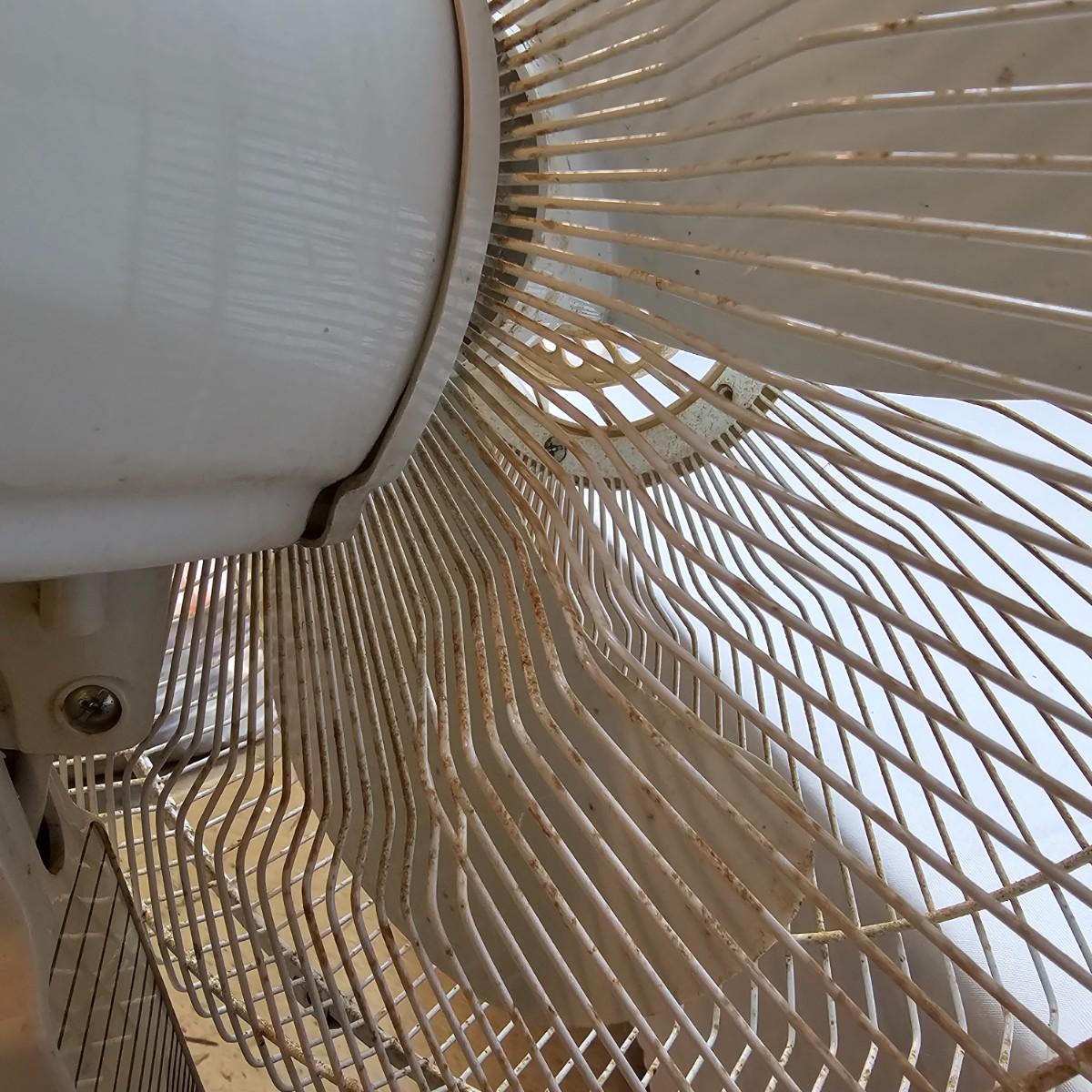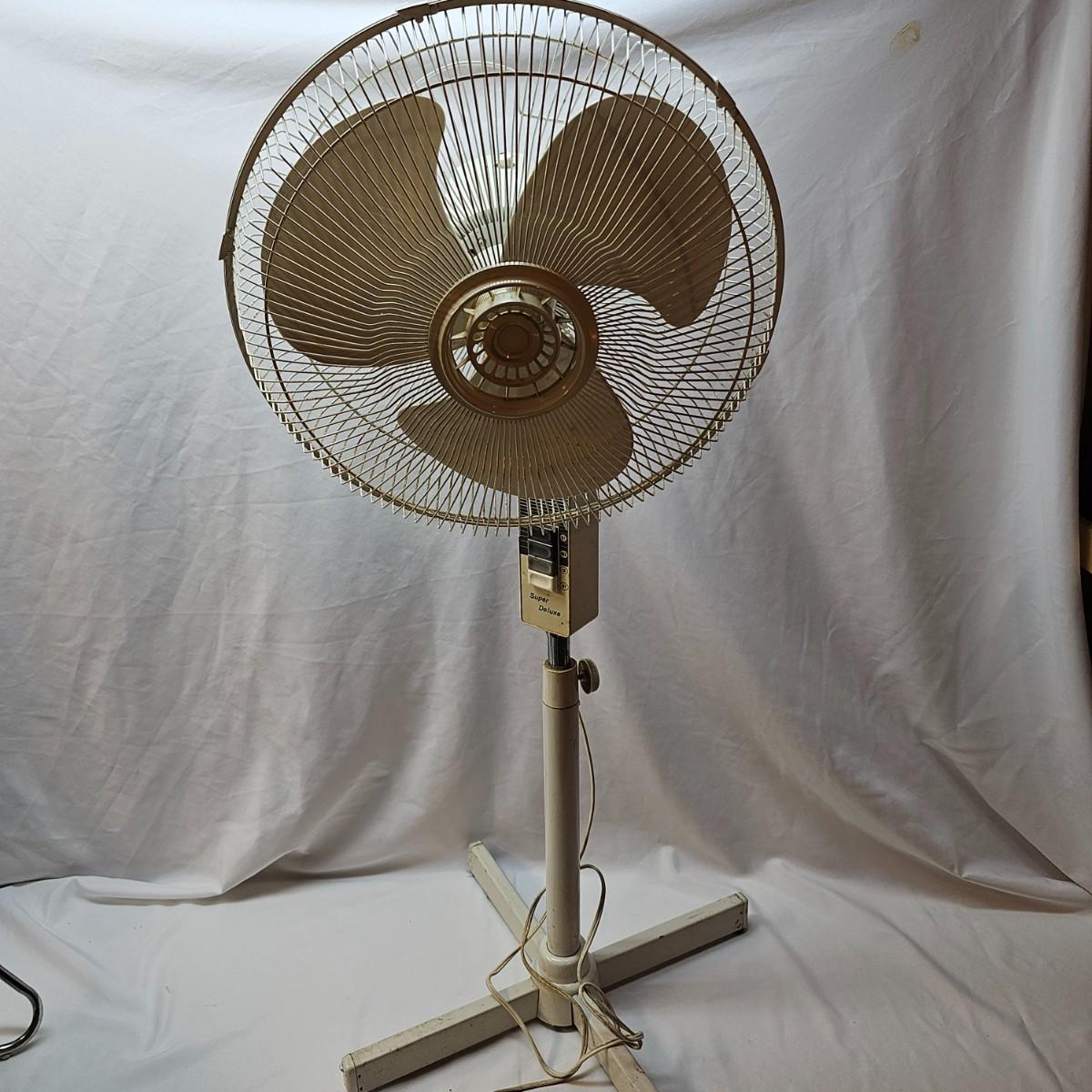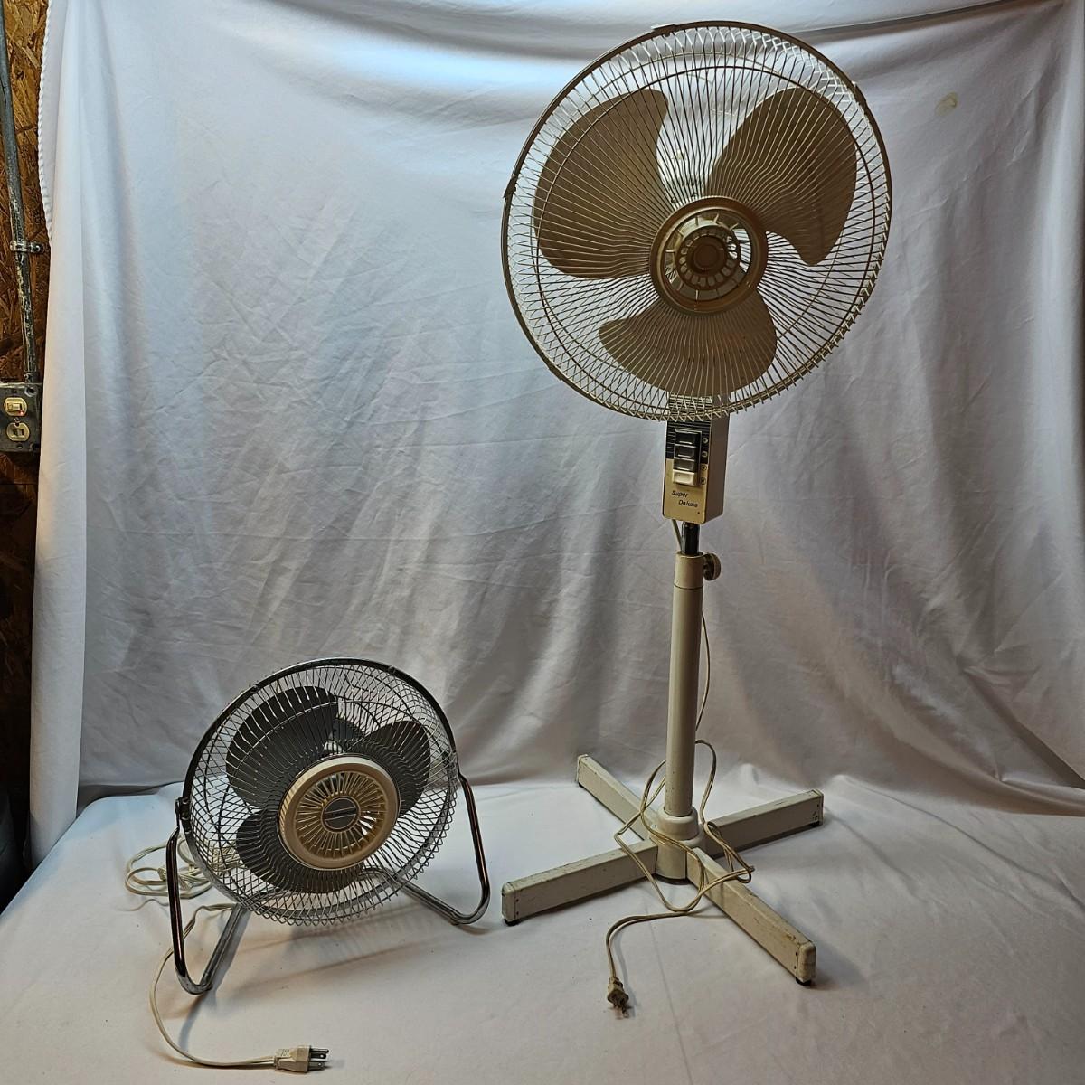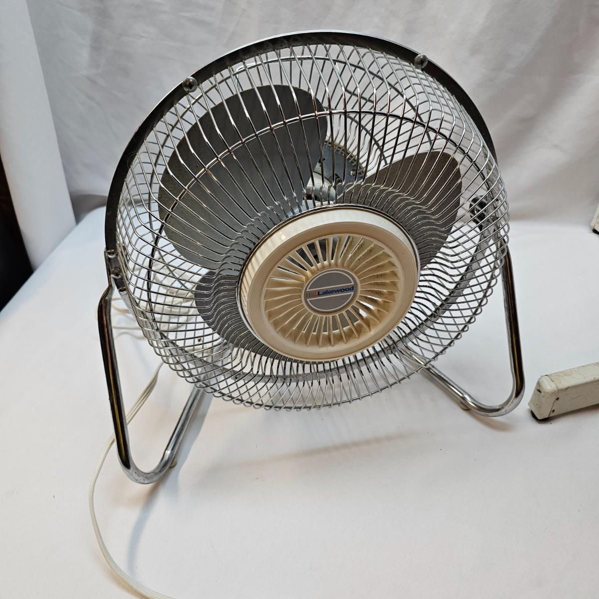 One floor model and one stand model. Floor model is by Lakewood, has three speeds and tilt frame. Measures 16" x 10" x 16"H with 10" blade. Stand model has four straight legs for stability, is adjustable for height. Oscillating unit is 24" x 24" x 44"H, has 14" blade. Cage, legs and stand need some tlc cleaning. Both fans powered on when plugged in. See photos for details. Local pickup only.