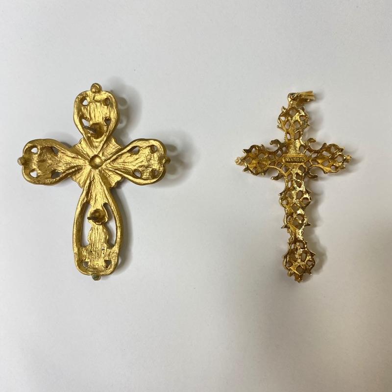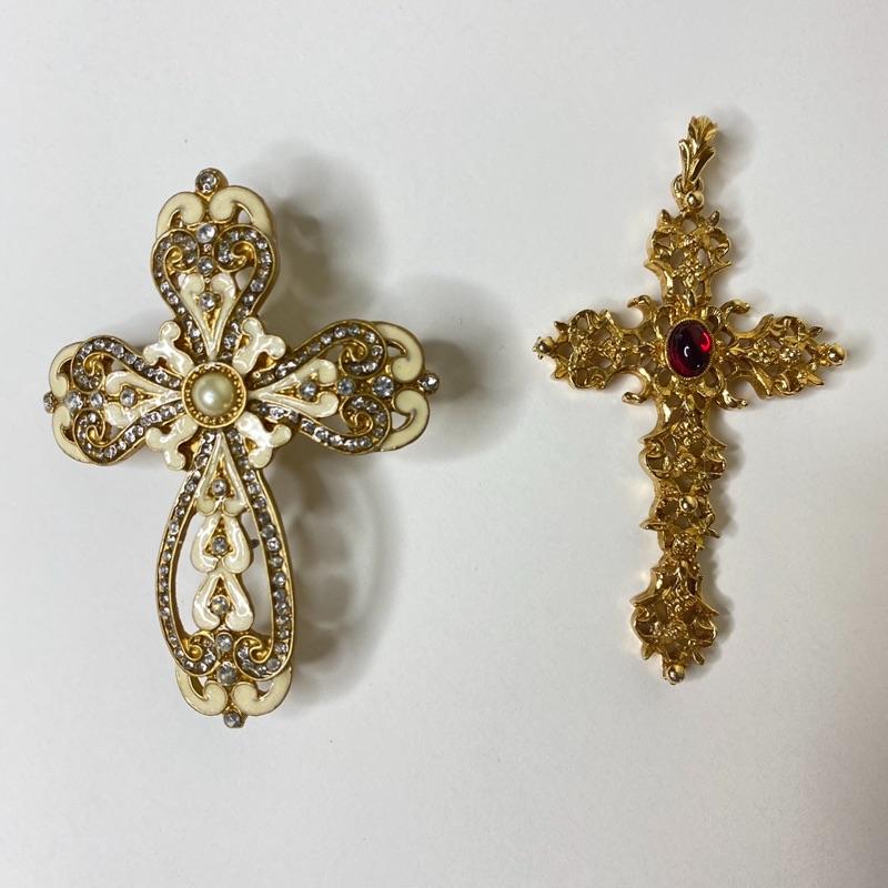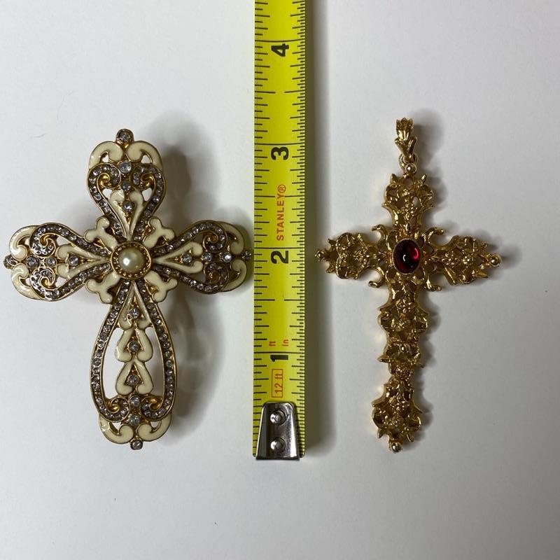 Includes one gold with red stone cross pendant / one gold and Crystal pin ( needs pin backs )