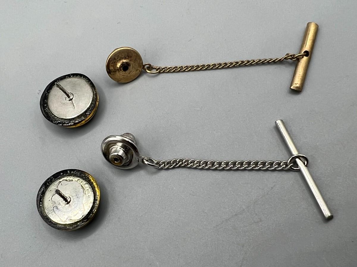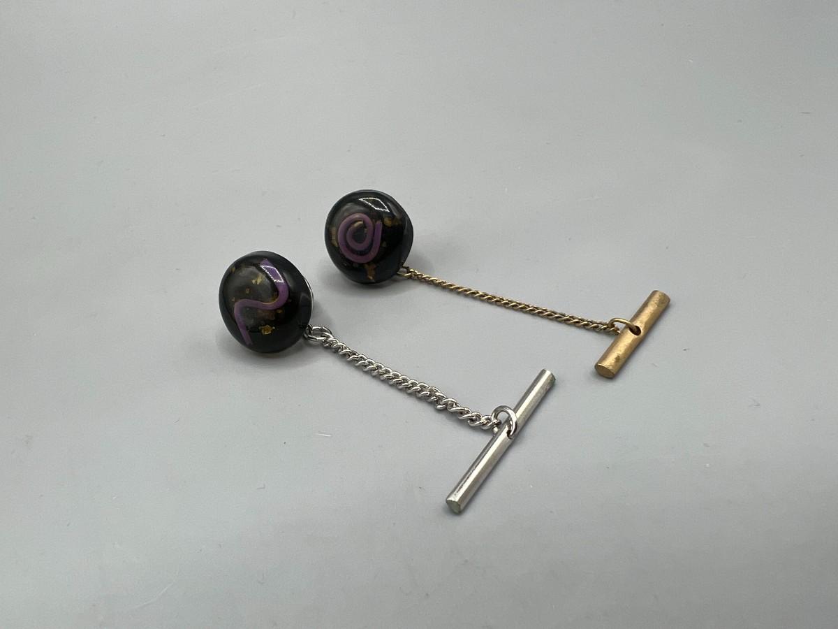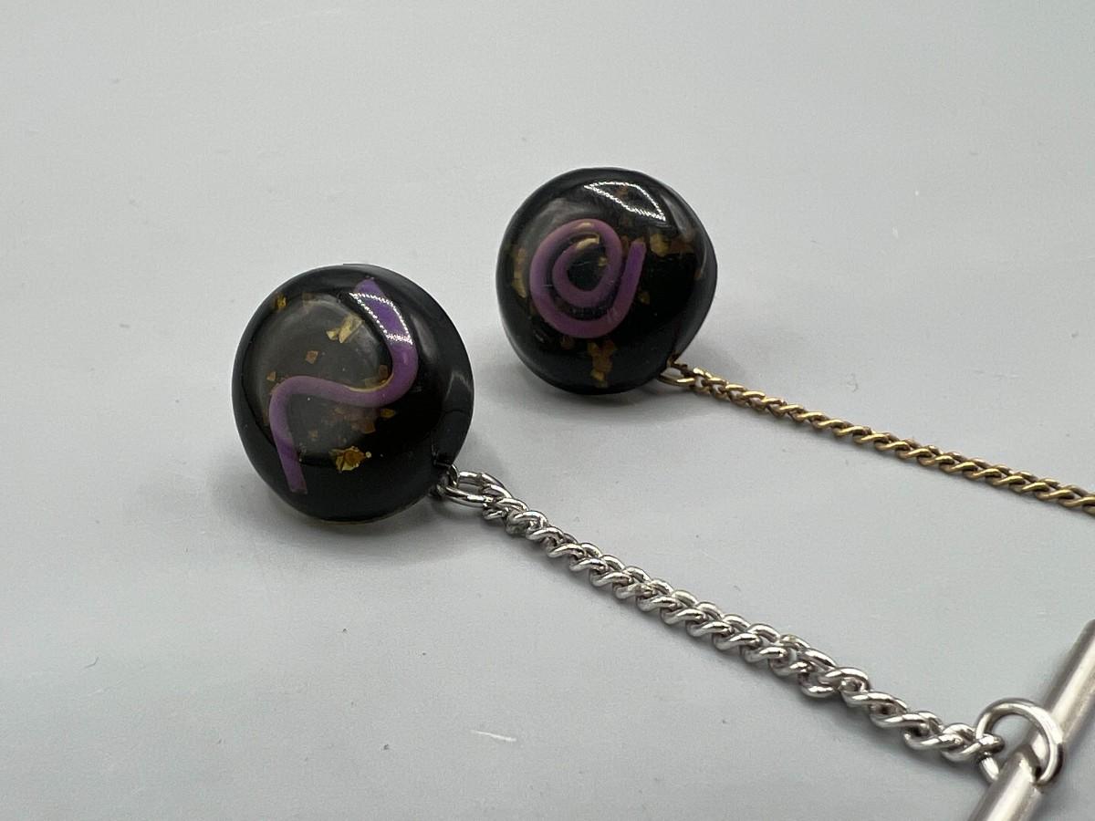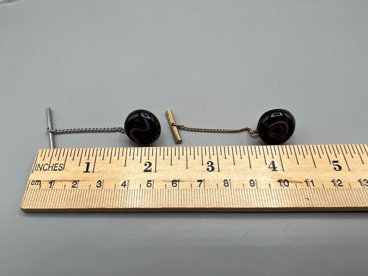 Pair of Fashionable Swirl Black Bead Tie Tack Clutch, there is no significant damage to the pieces and is in good wearable condition. Check pictures for more details and for sizing.