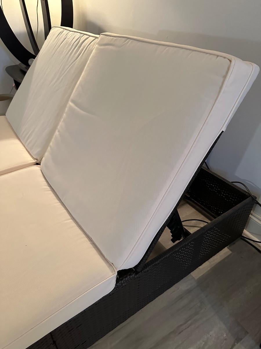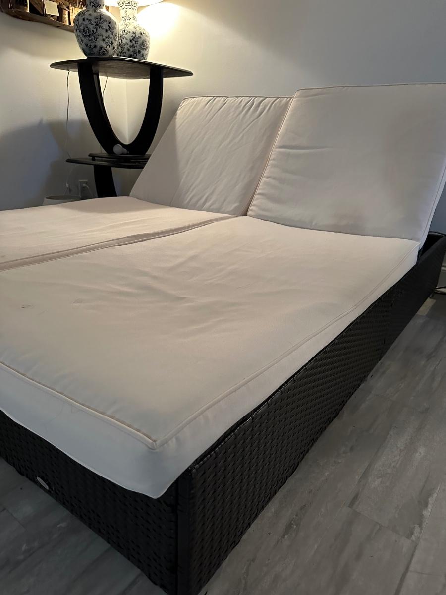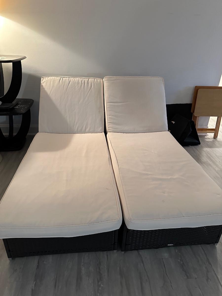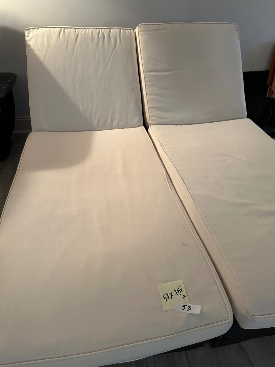 PAIR OF FAUX WICKER LOUNGE CHAIRS, 57" LONG, INCLUDES SAGE CUSHIONS, AS PICTURED