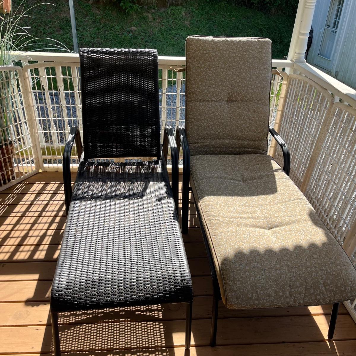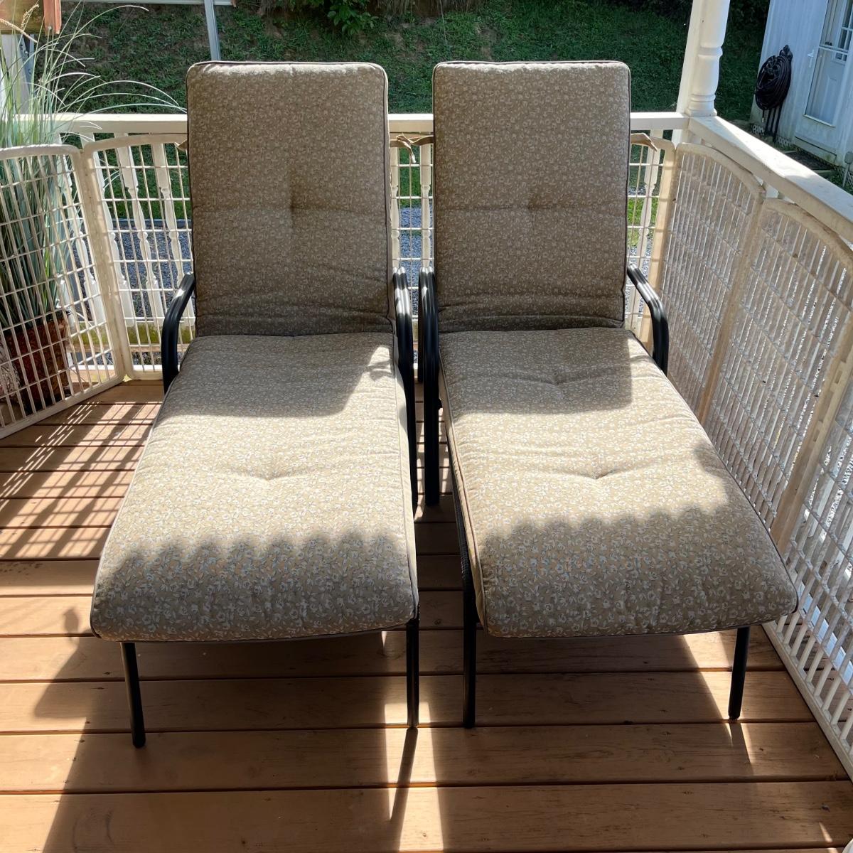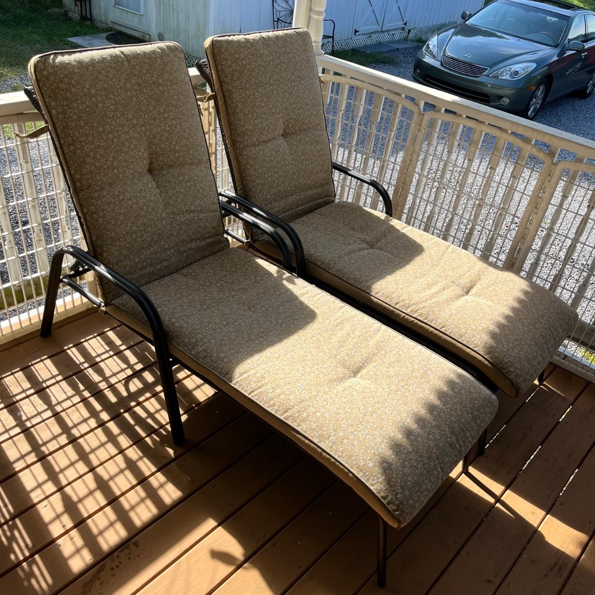 Lot includes two metal framed loungers with faux wicker and adjustable back so you can use as a chair or a lounger. Both come with matching cushions. Lounger measures 27” x 79” x 39”H when adjusted with seat back up. Cushions have some water stains on underneath side, see pictures.