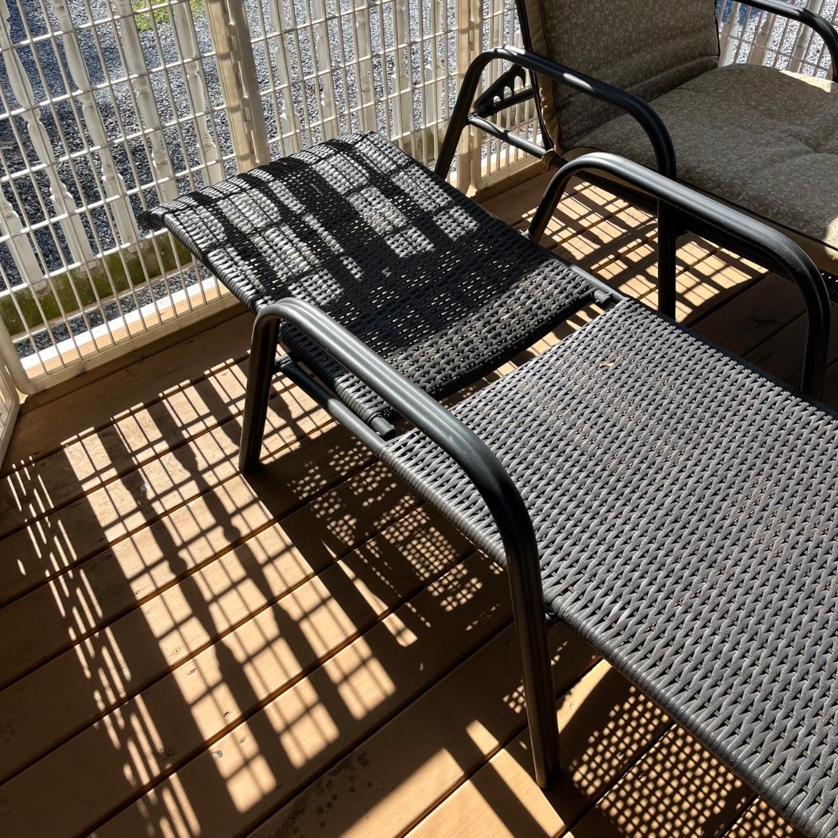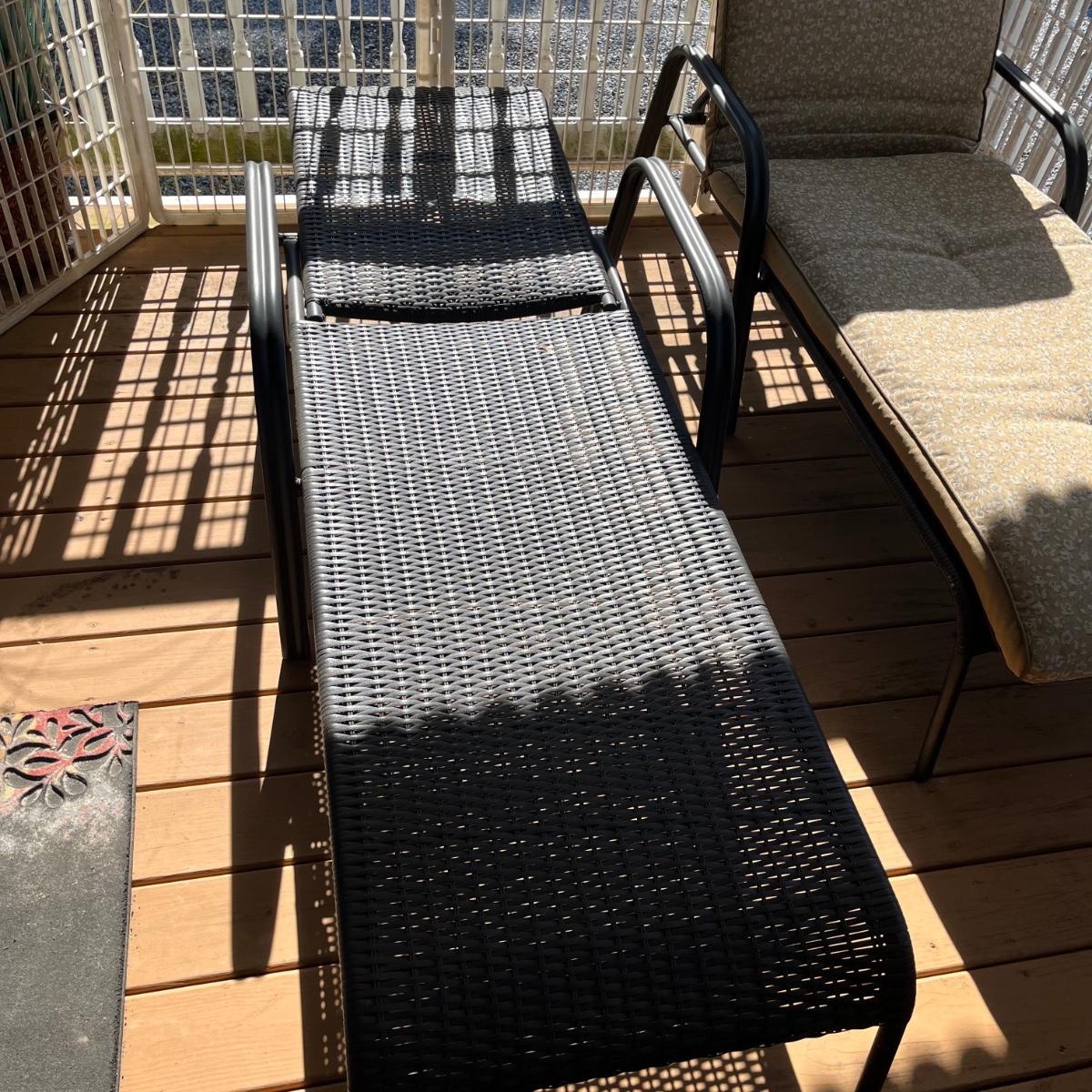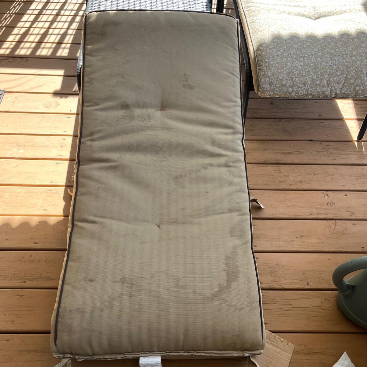 Lot includes two metal framed loungers with faux wicker and adjustable back so you can use as a chair or a lounger. Both come with matching cushions. Lounger measures 27” x 79” x 39”H when adjusted with seat back up. Cushions have some water stains on underneath side, see pictures.