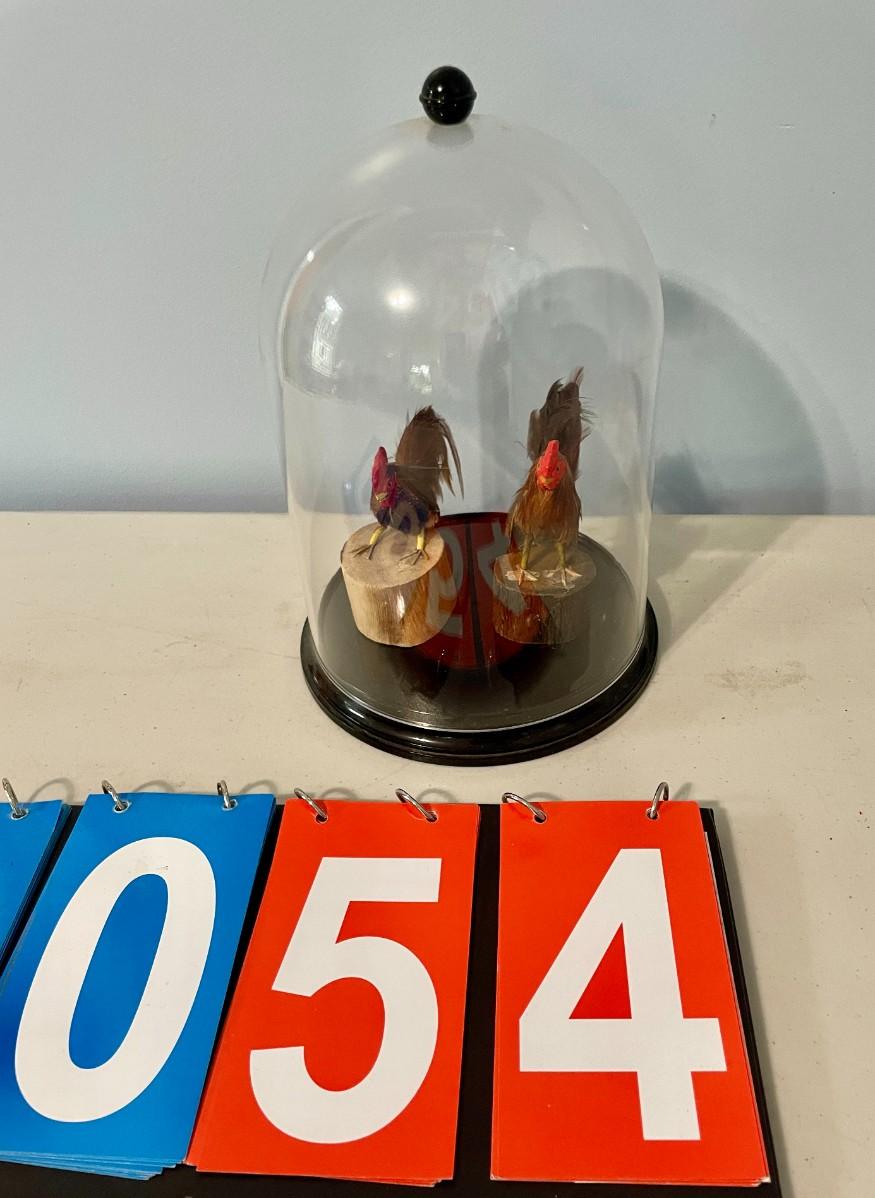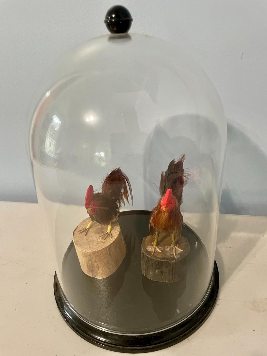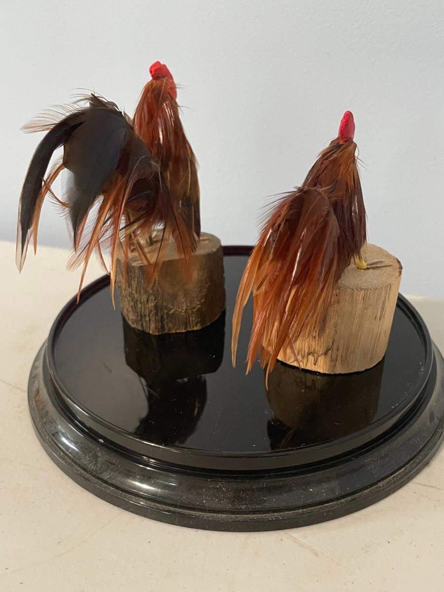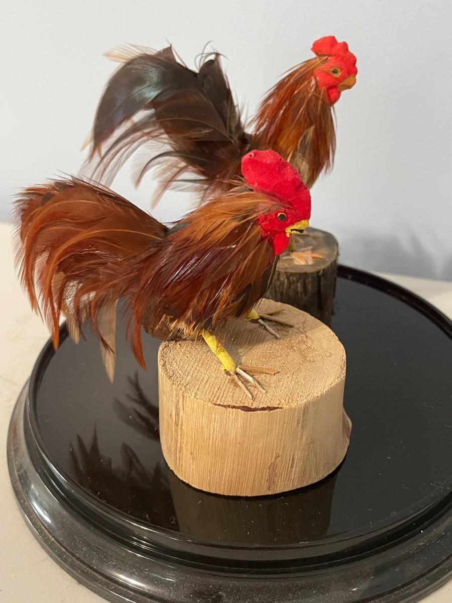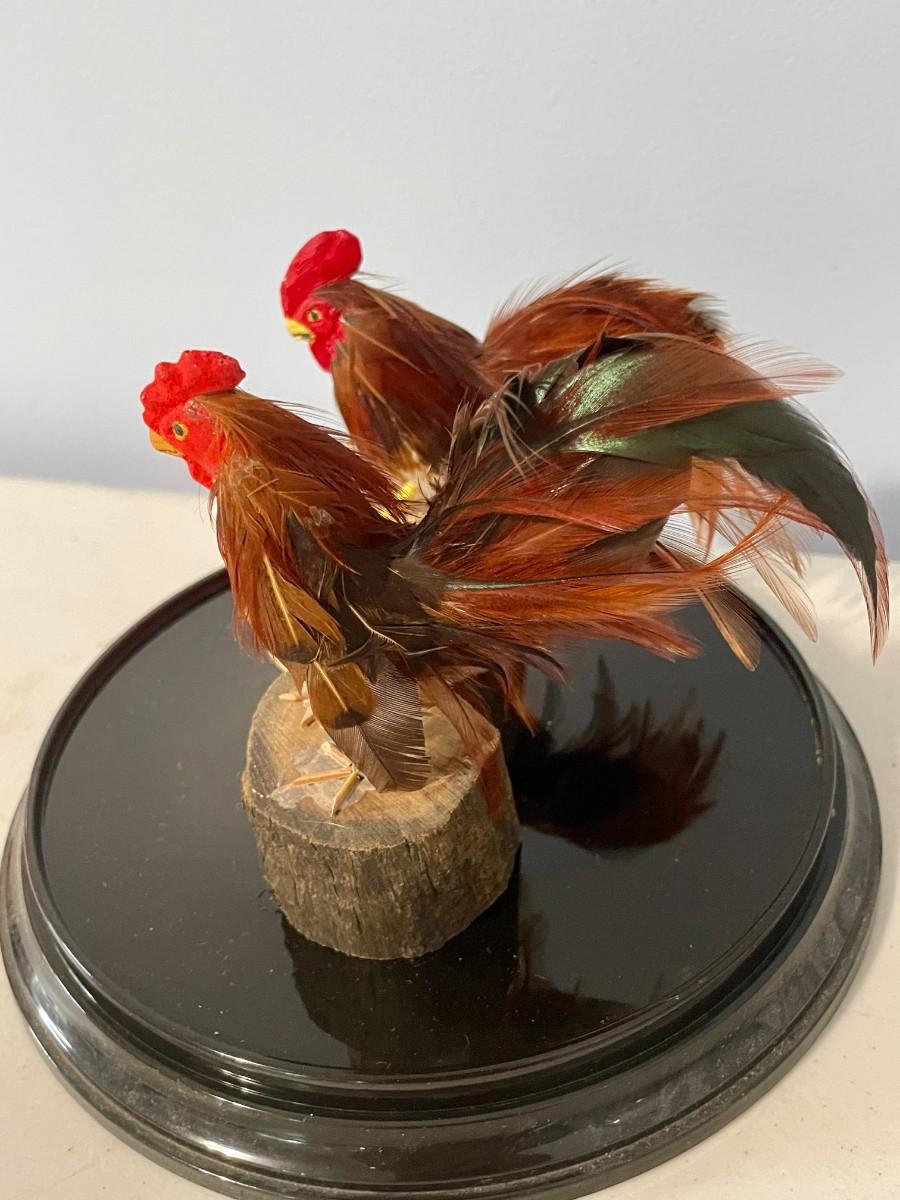 Pair of feathered rooster figurines "under glass"