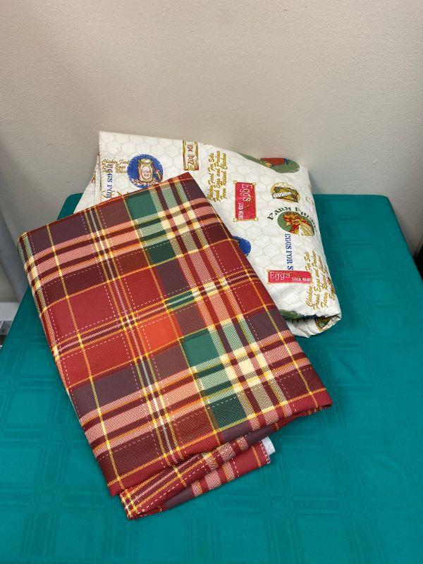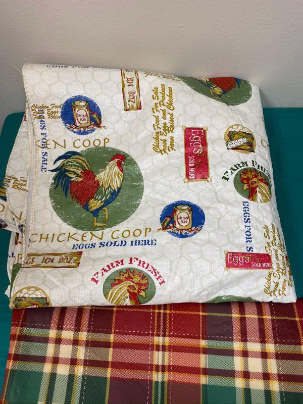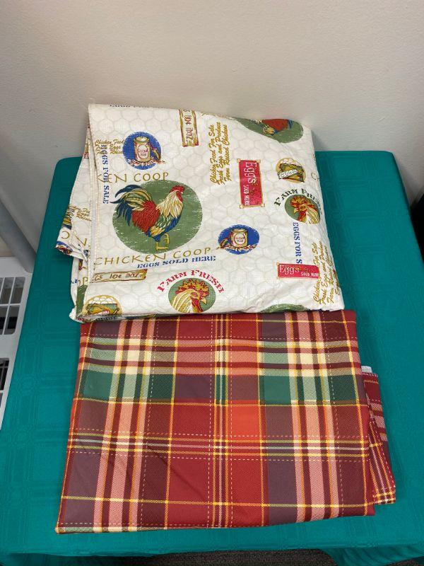 Felt back vinyl table clothes. One in red plaid, the other is farmhouse rooster. Good Condition.