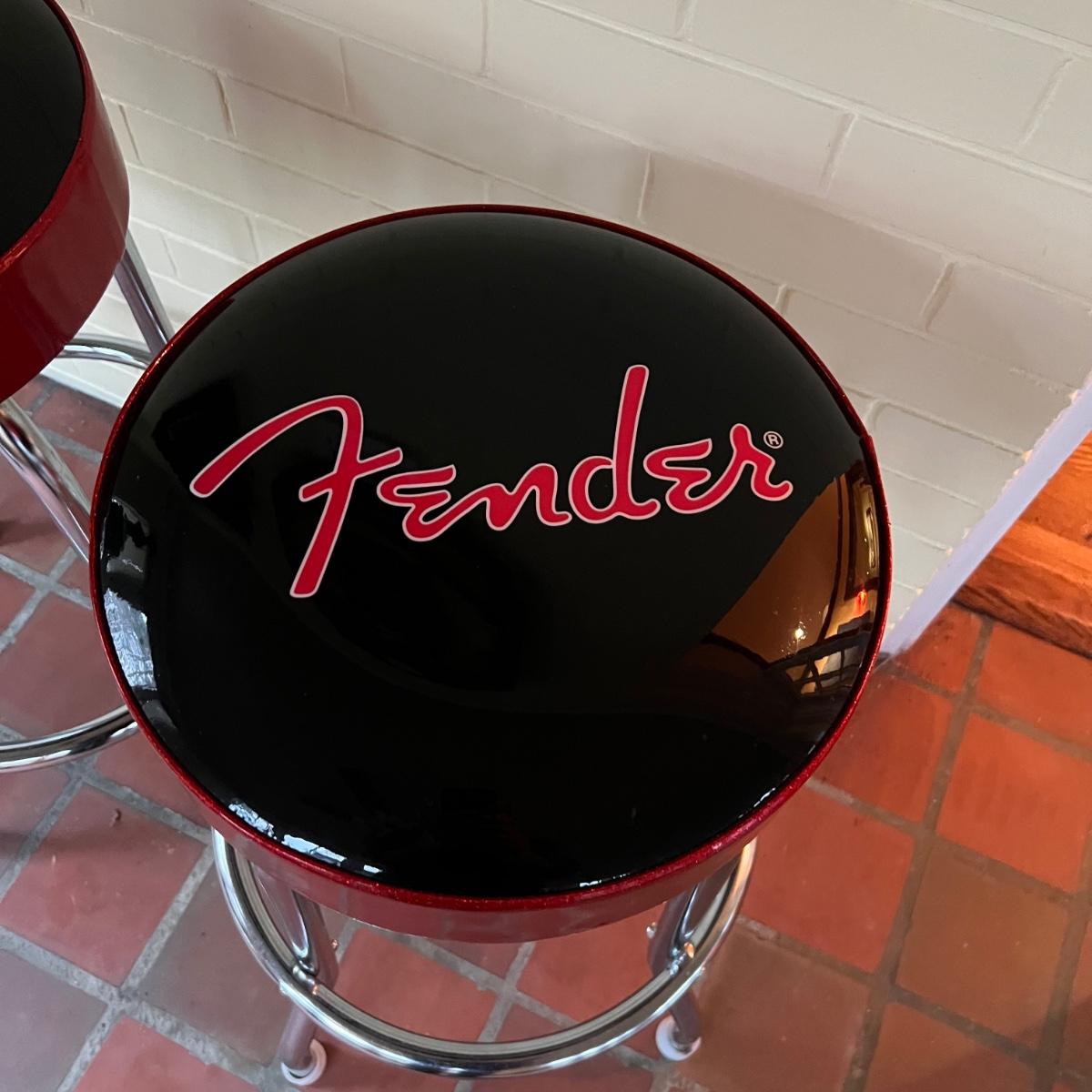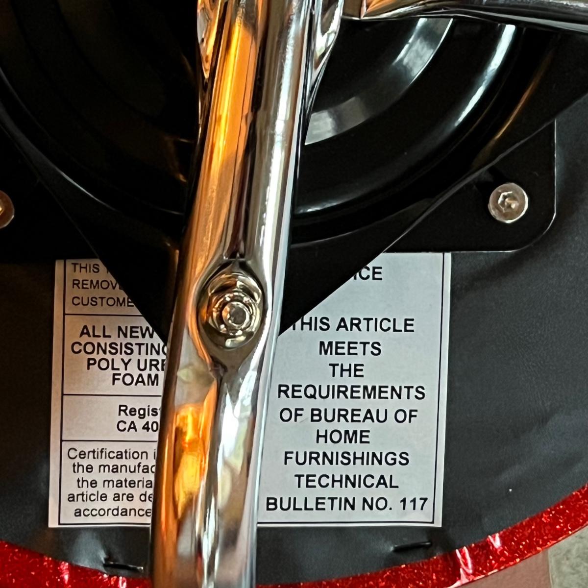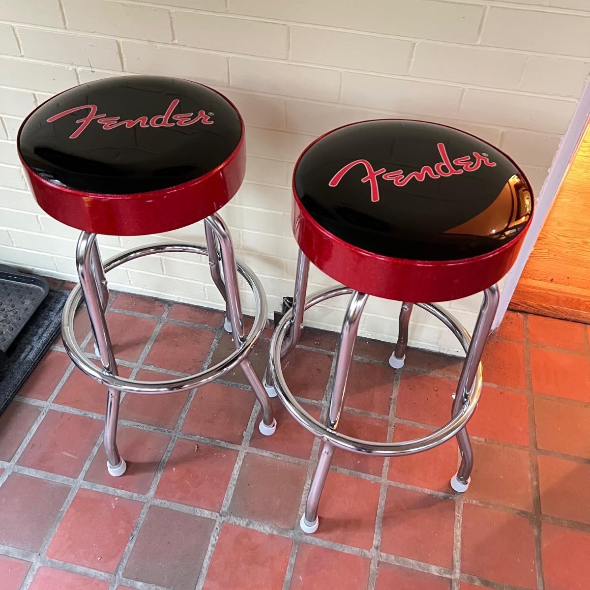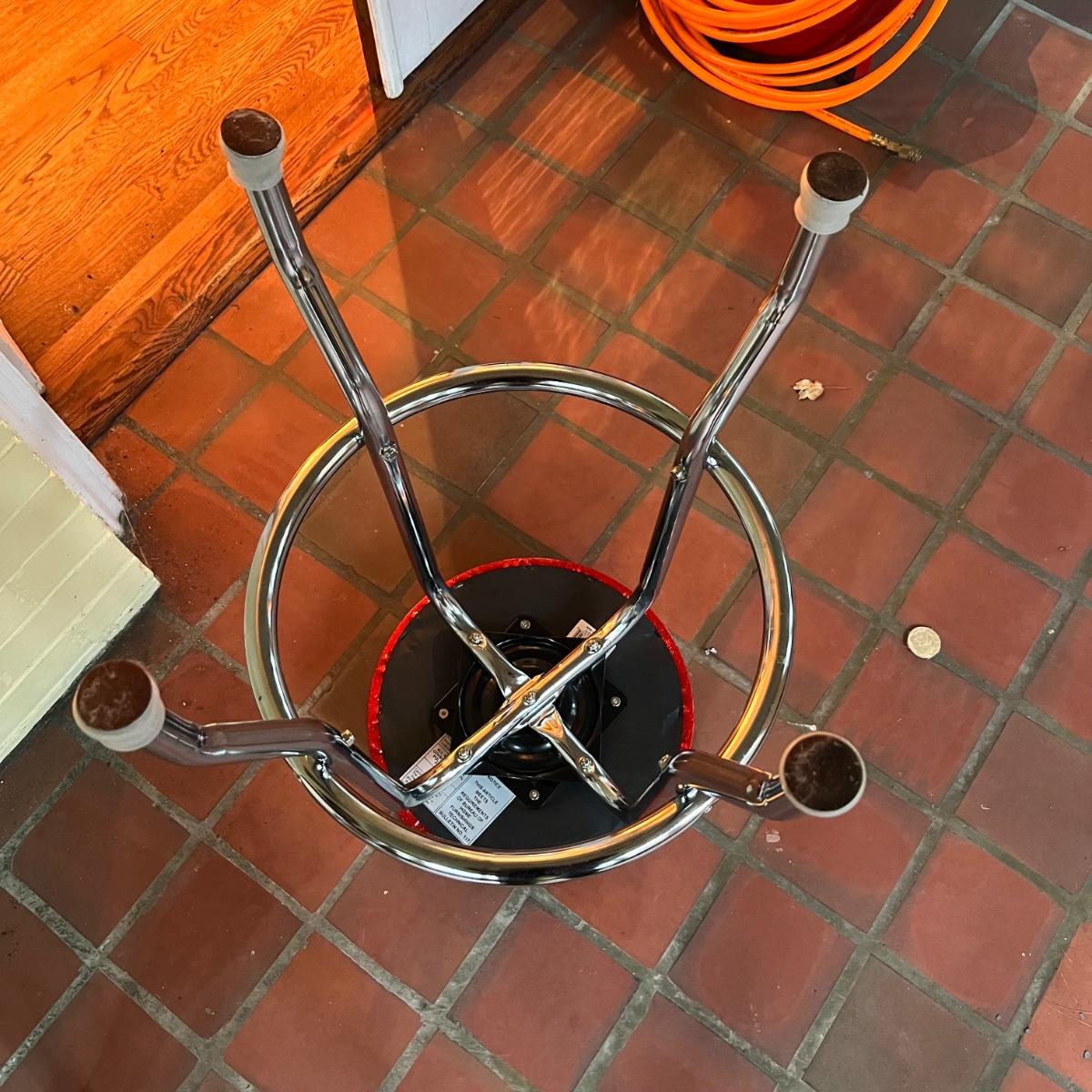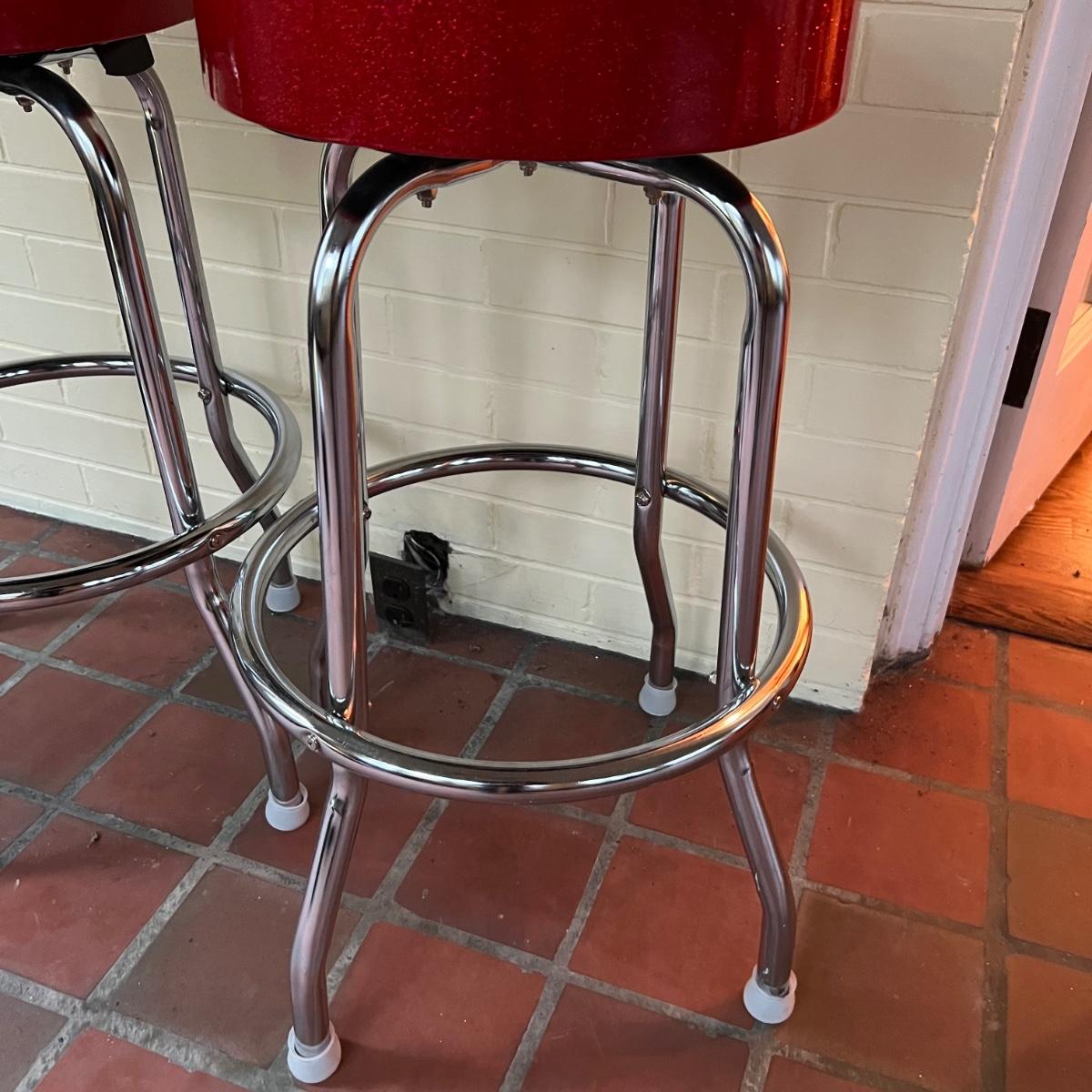 Matching pair of stools with metal frames and shiny vinyl like padded seats. These stools swivel but do not adjust in height.