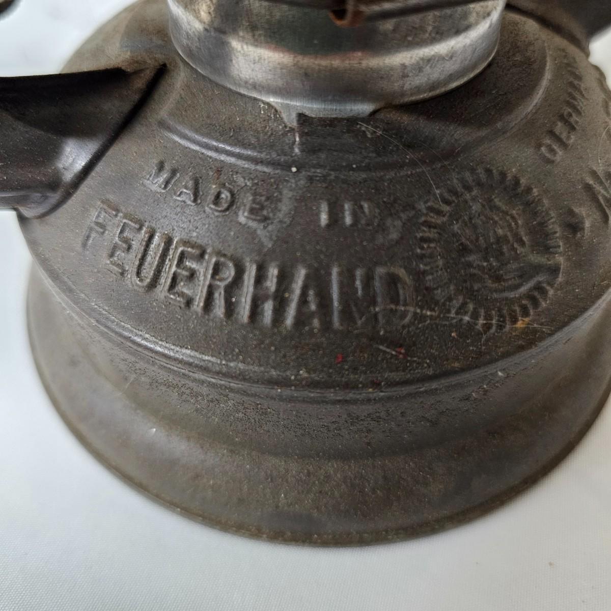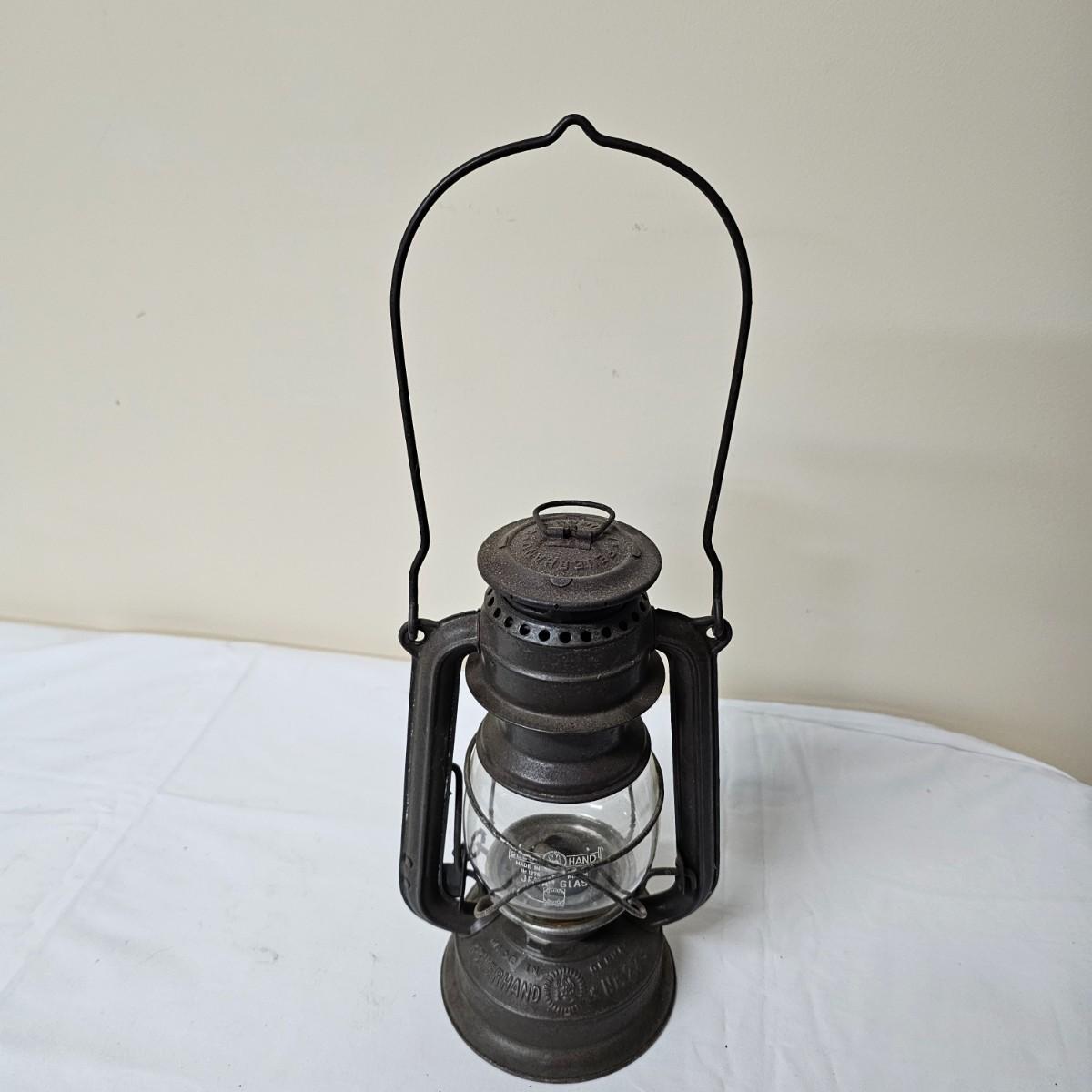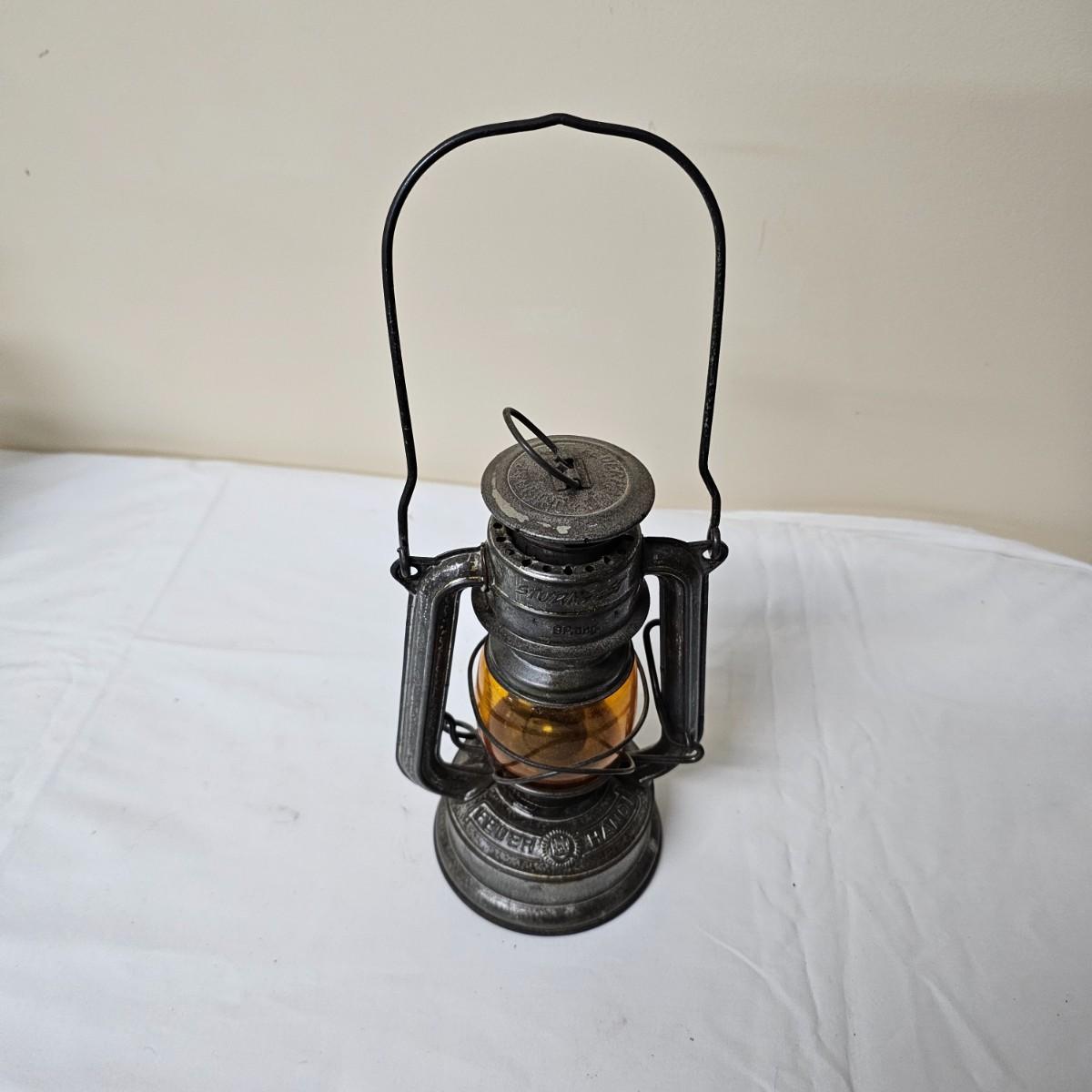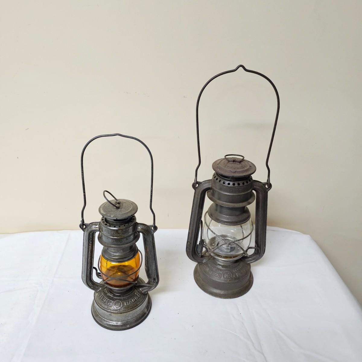 Two vintage W. German made Feuerhand kerosene lamps. Both lamps are dull gray in color, have handles and appear to have original chimney glass. Small lamp with amber glass is 4" x 5" x 11.5"H. Larger lamp has company name on clear chimney, measures 4.5" x 6" x 15"H. Some wear and tear on both, scratches on bottoms. See photos for details. Shipping available.