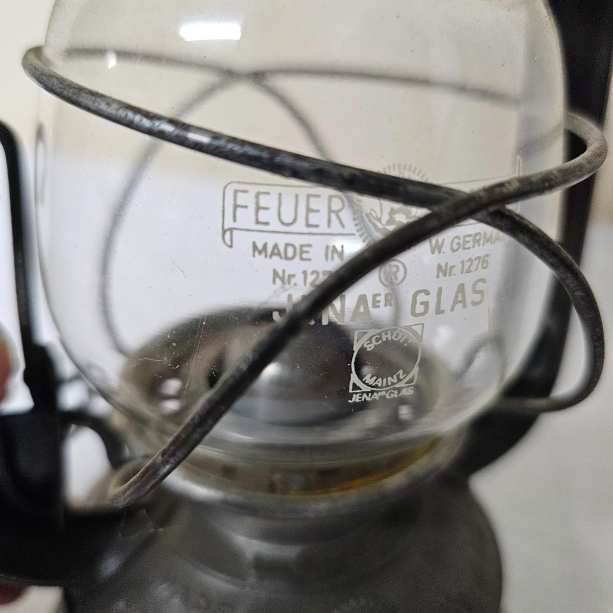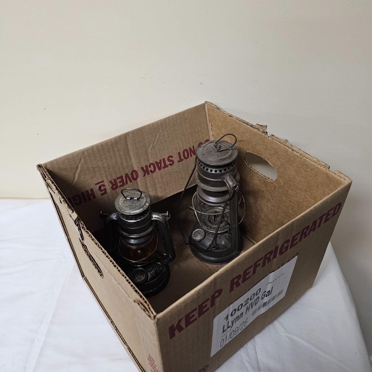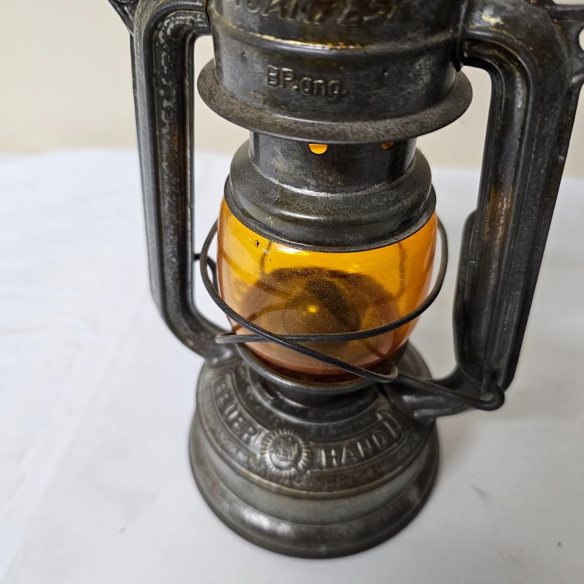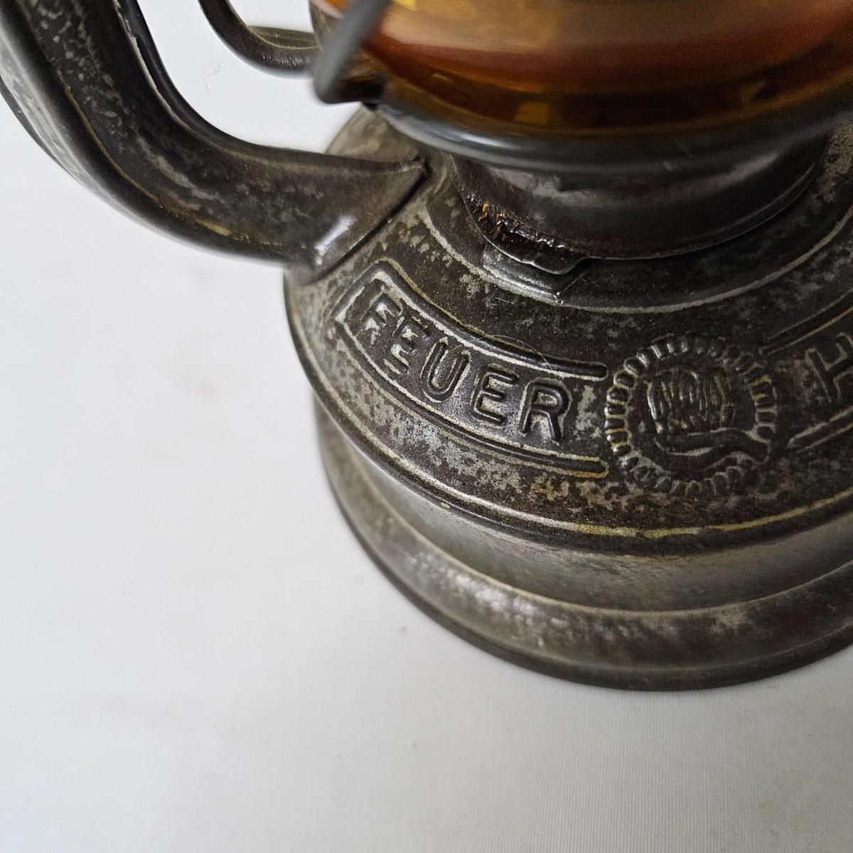 Two vintage W. German made Feuerhand kerosene lamps. Both lamps are dull gray in color, have handles and appear to have original chimney glass. Small lamp with amber glass is 4" x 5" x 11.5"H. Larger lamp has company name on clear chimney, measures 4.5" x 6" x 15"H. Some wear and tear on both, scratches on bottoms. See photos for details. Shipping available.