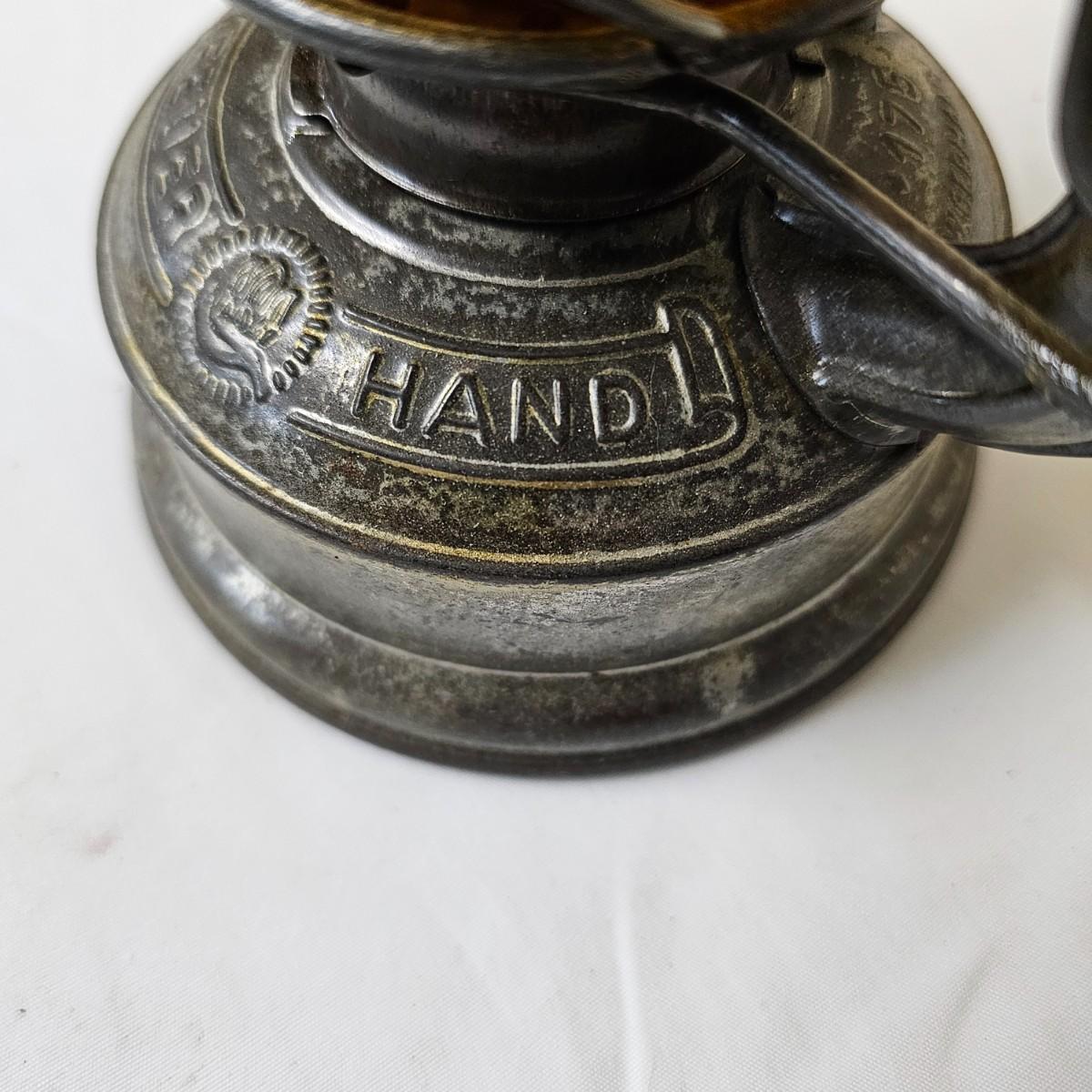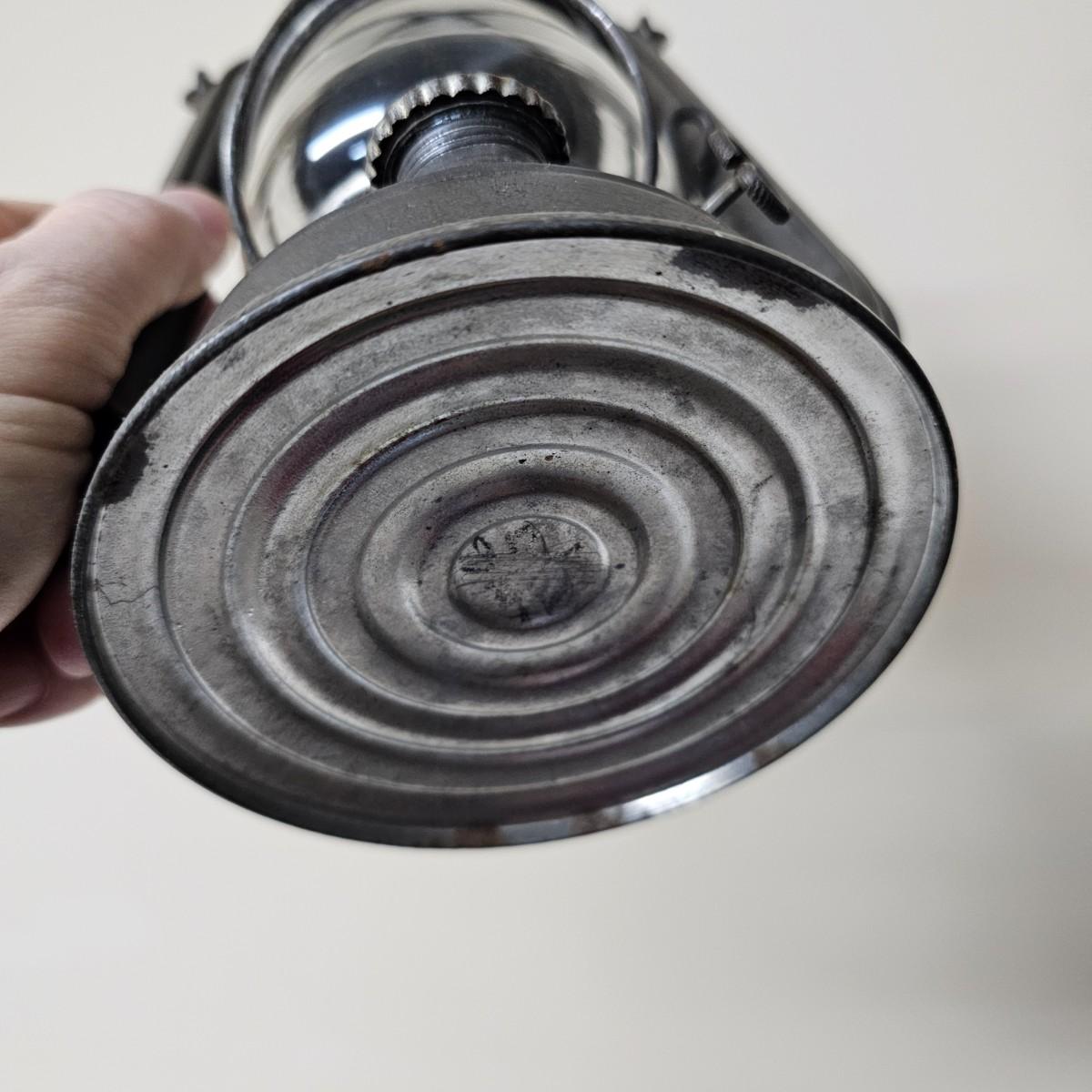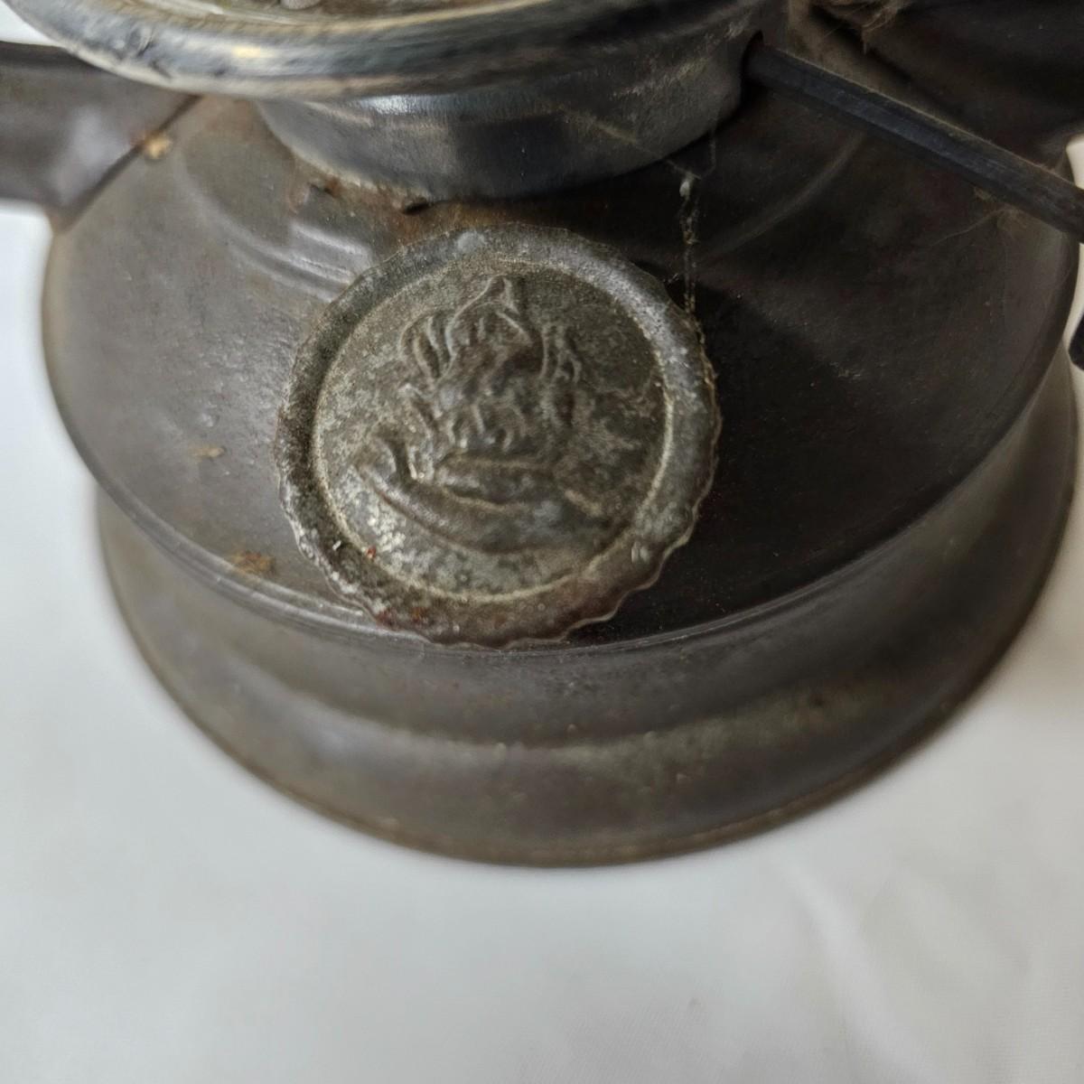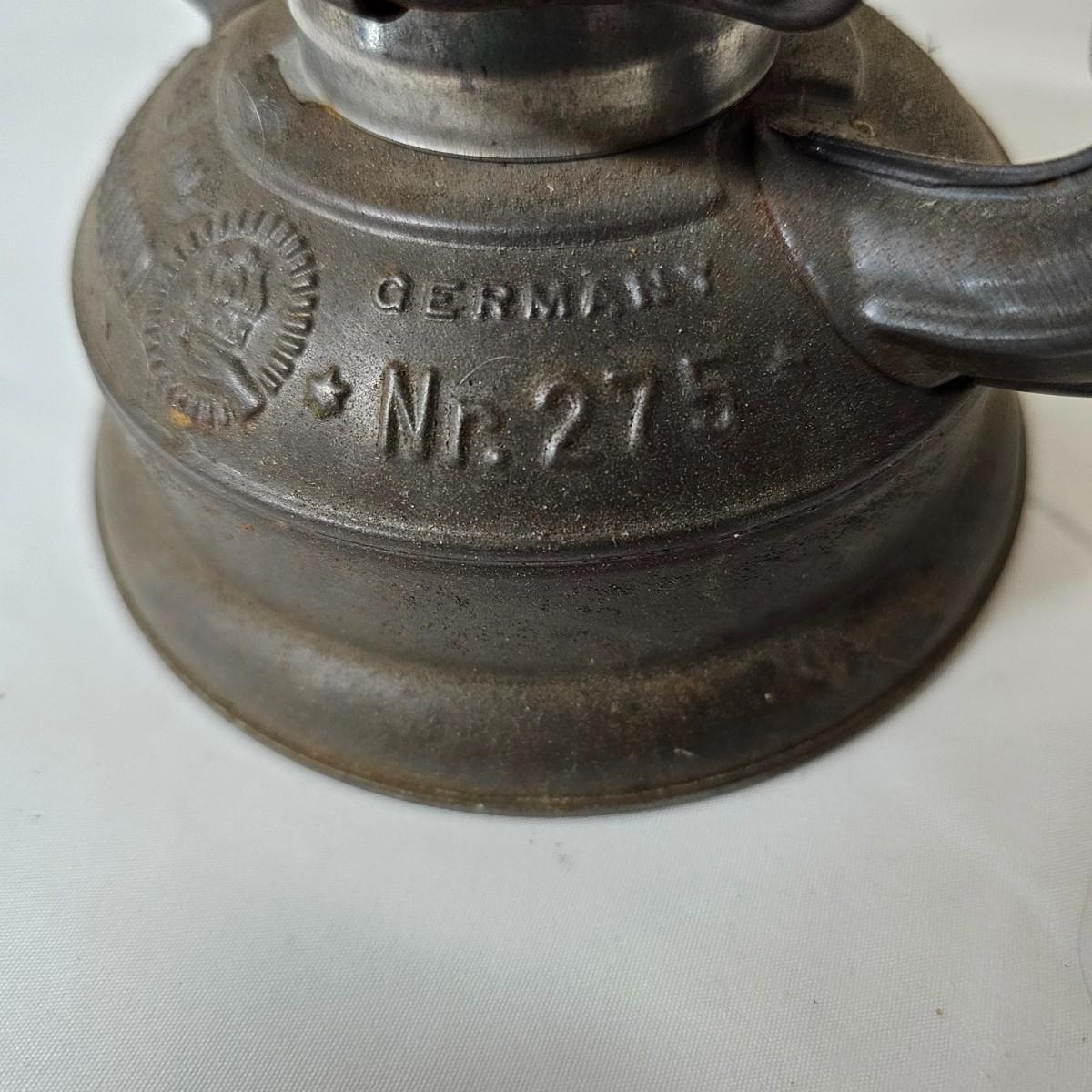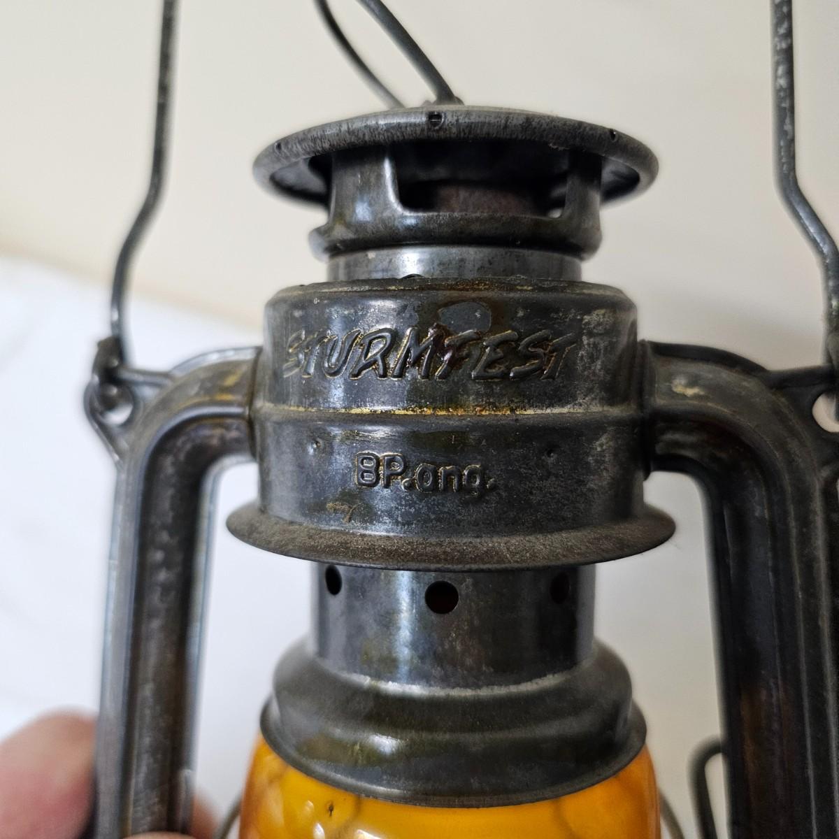 Two vintage W. German made Feuerhand kerosene lamps. Both lamps are dull gray in color, have handles and appear to have original chimney glass. Small lamp with amber glass is 4" x 5" x 11.5"H. Larger lamp has company name on clear chimney, measures 4.5" x 6" x 15"H. Some wear and tear on both, scratches on bottoms. See photos for details. Shipping available.
