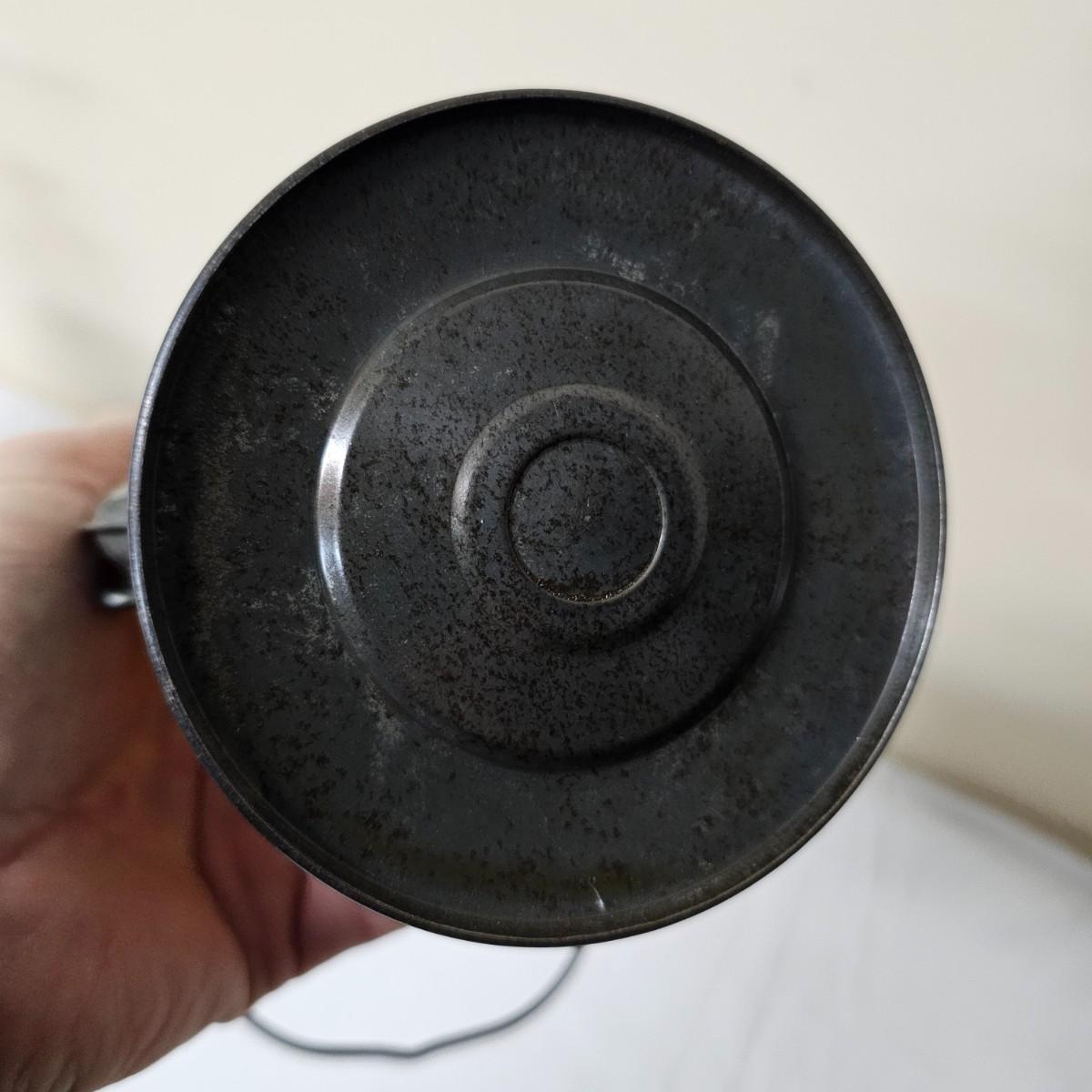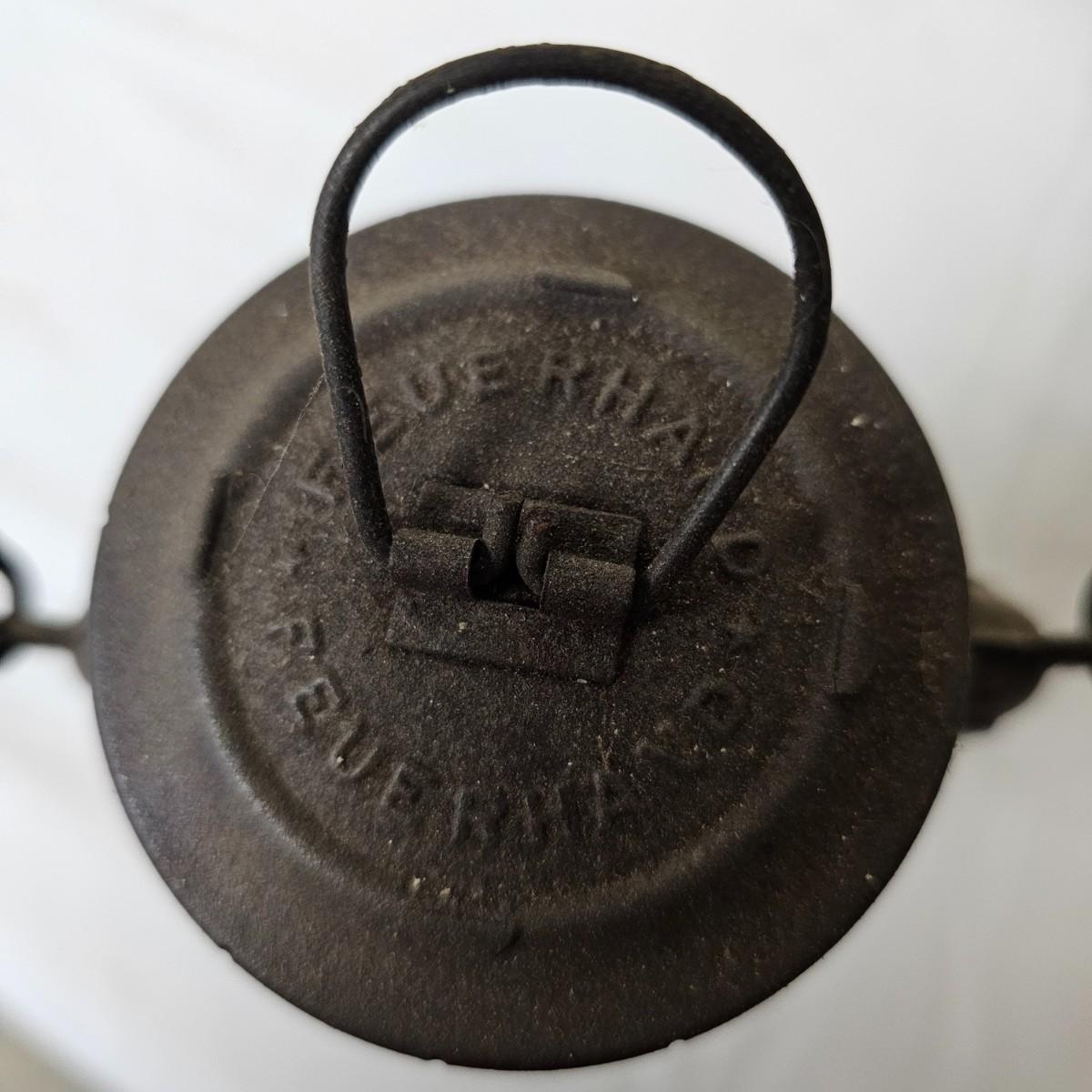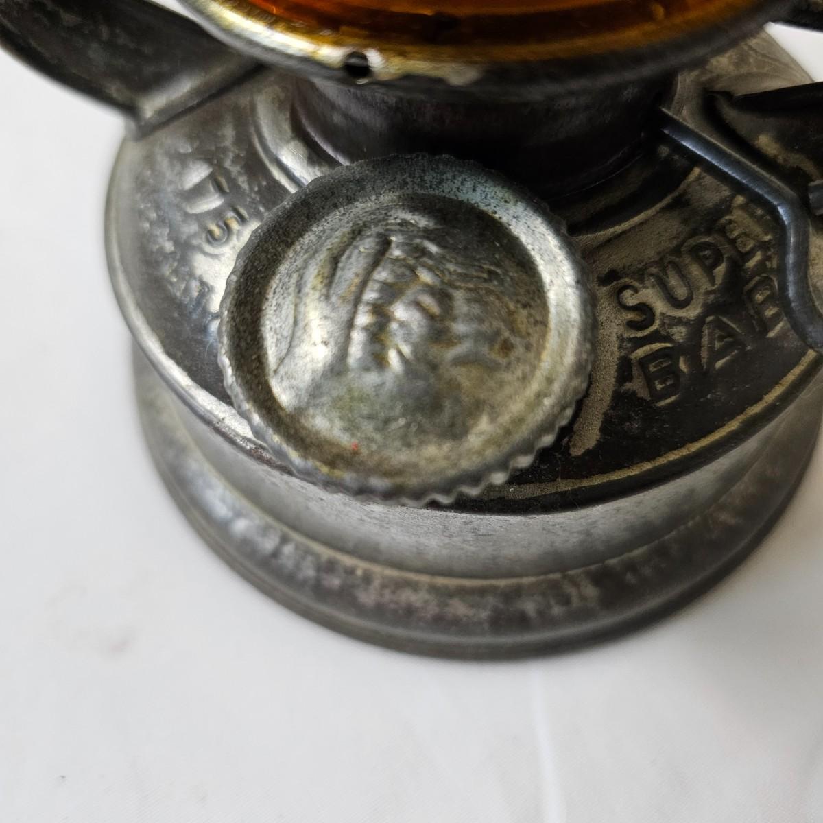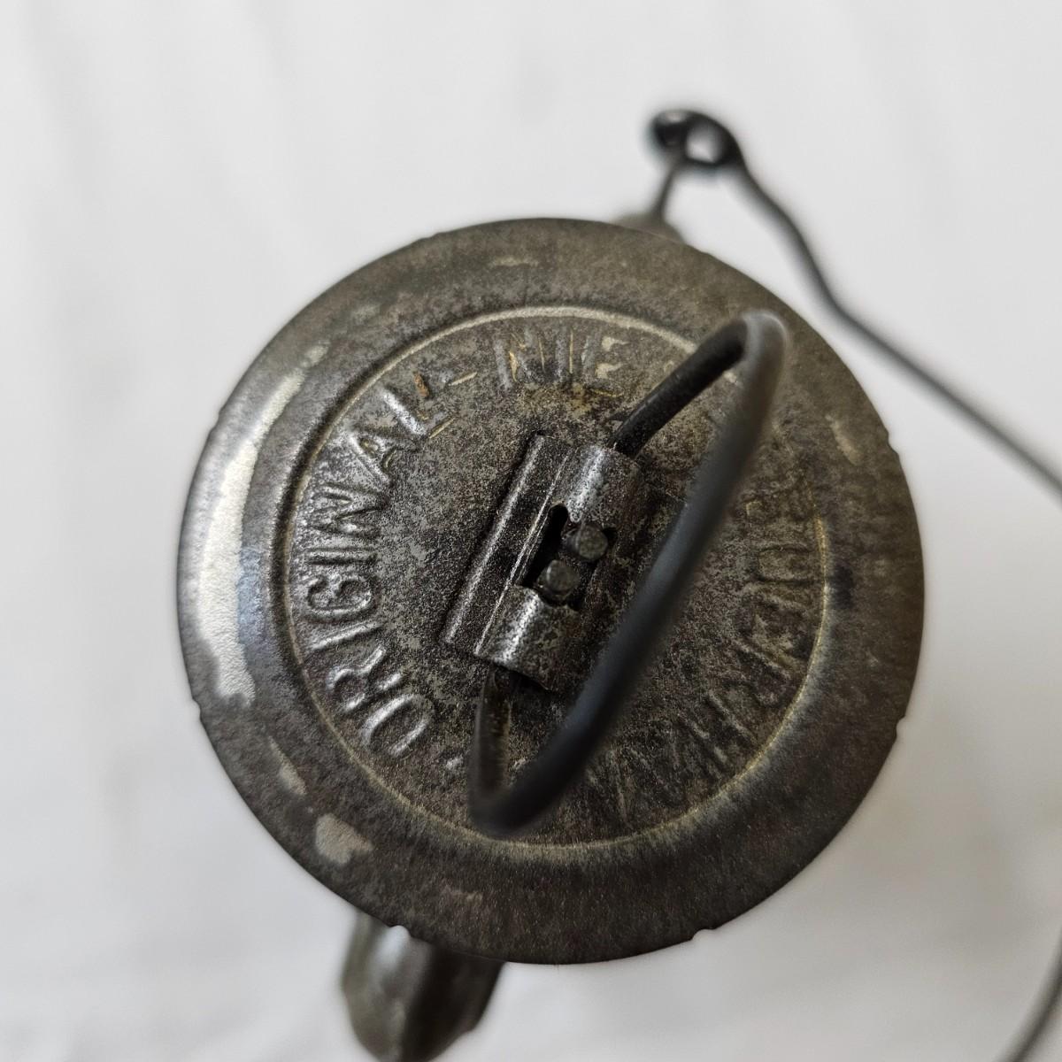 Two vintage W. German made Feuerhand kerosene lamps. Both lamps are dull gray in color, have handles and appear to have original chimney glass. Small lamp with amber glass is 4" x 5" x 11.5"H. Larger lamp has company name on clear chimney, measures 4.5" x 6" x 15"H. Some wear and tear on both, scratches on bottoms. See photos for details. Shipping available.