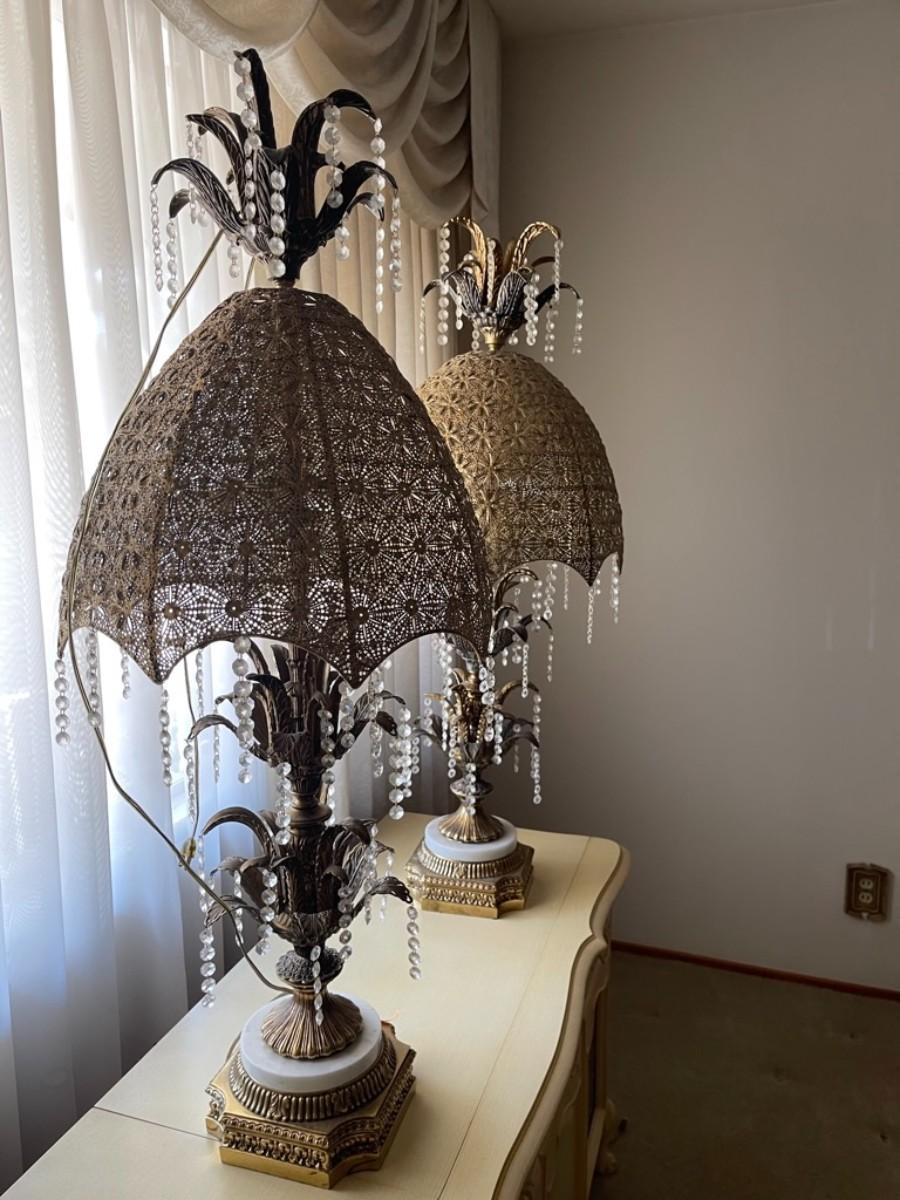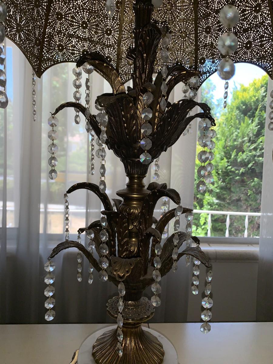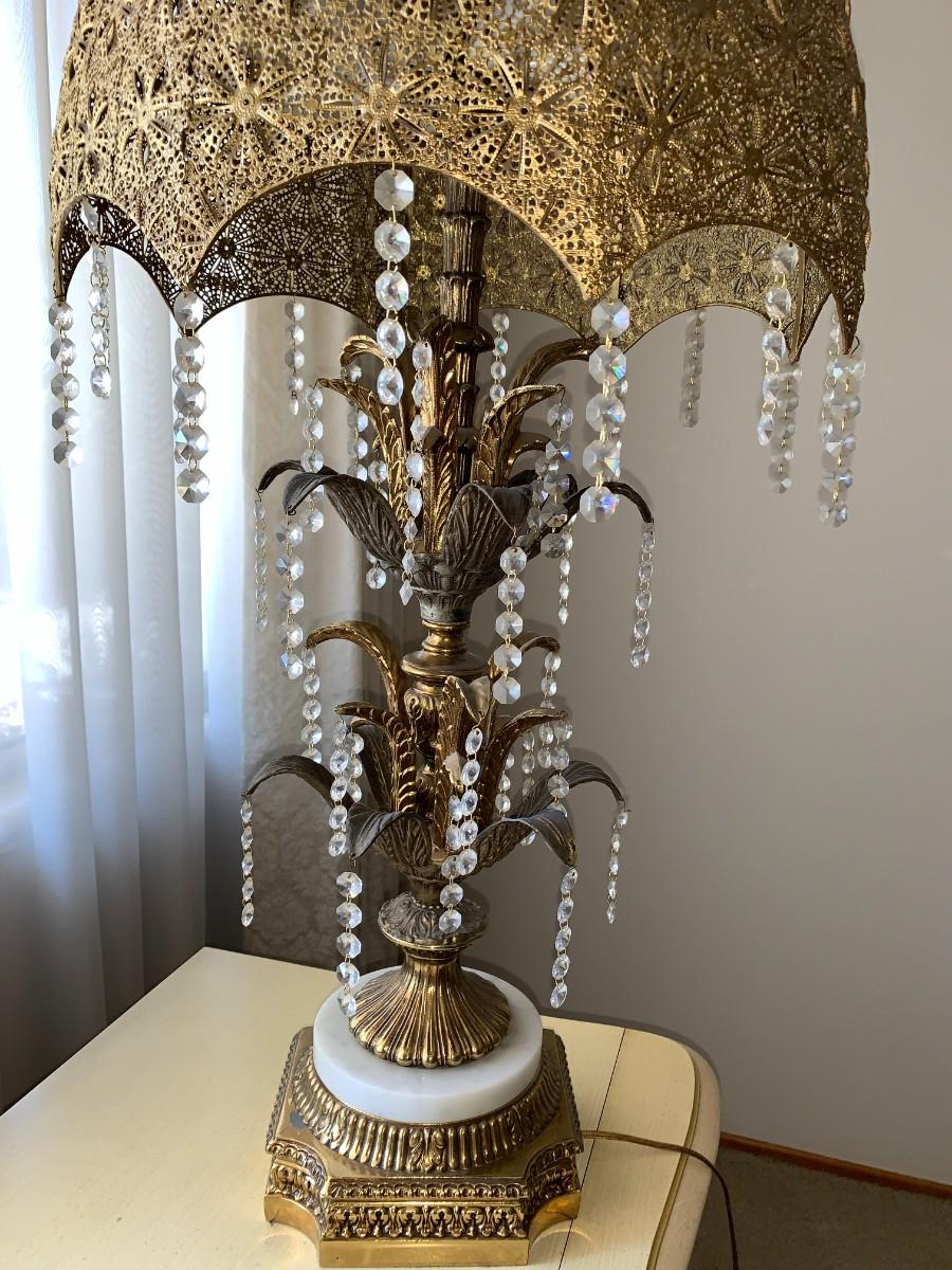 Pair of Antique Hollywood Regency Style Brass Filigree Shade, Crystal, Marble & Metal Base Table Lamps. Work. See Photos for wear on base. Very Heavy