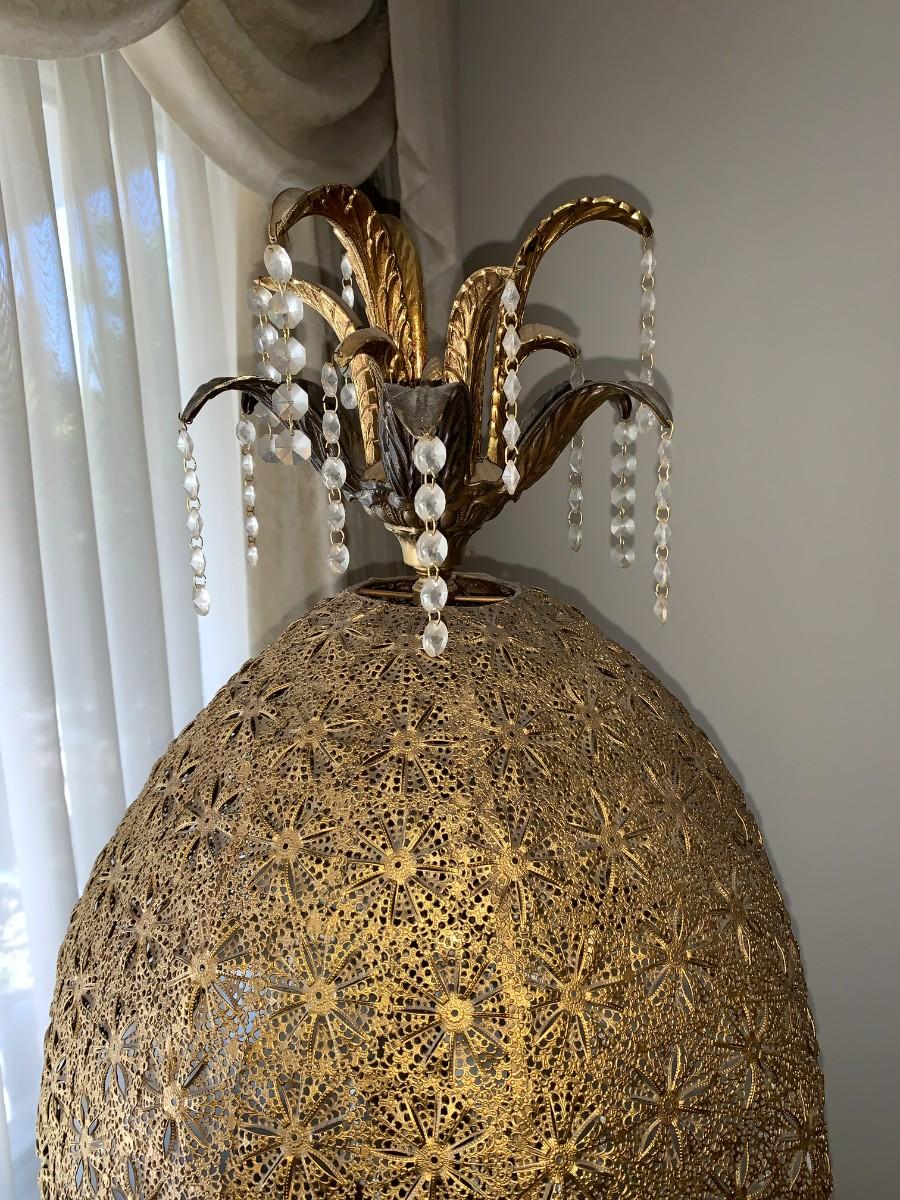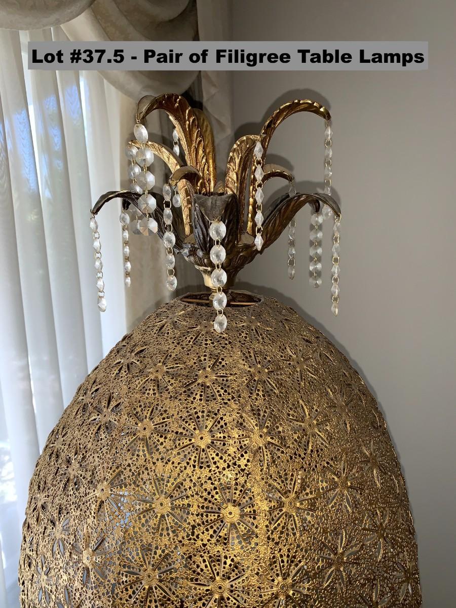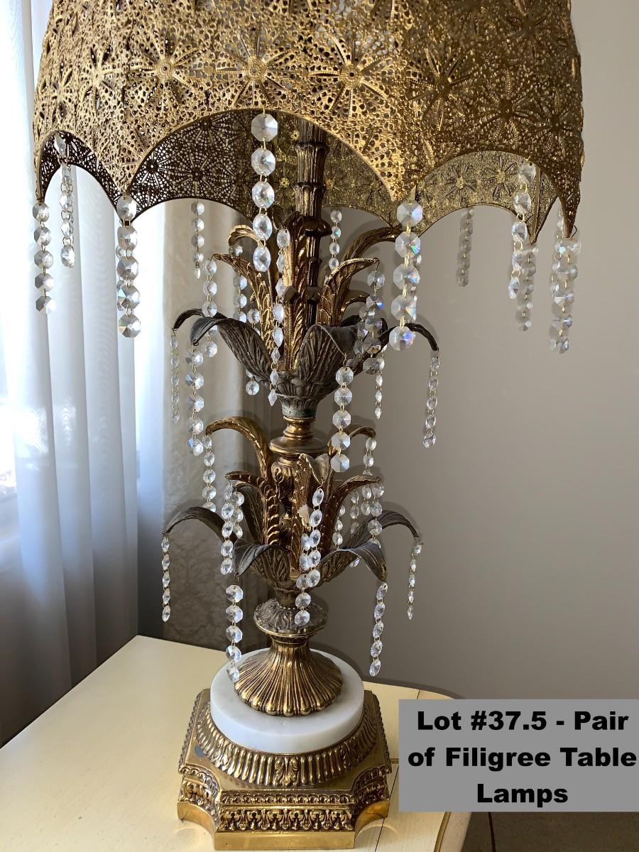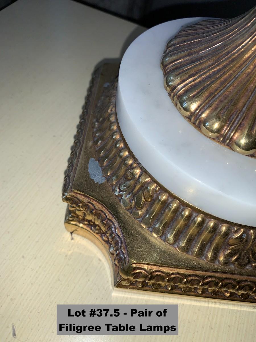 Pair of Antique Hollywood Regency Style Brass Filigree Shade, Crystal, Marble & Metal Base Table Lamps. Work. See Photos for wear on base. Very Heavy