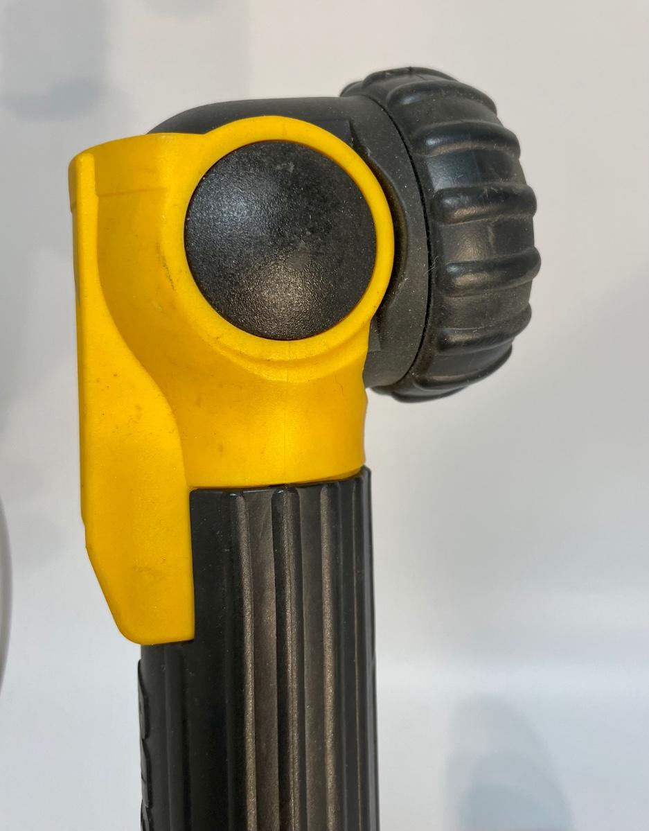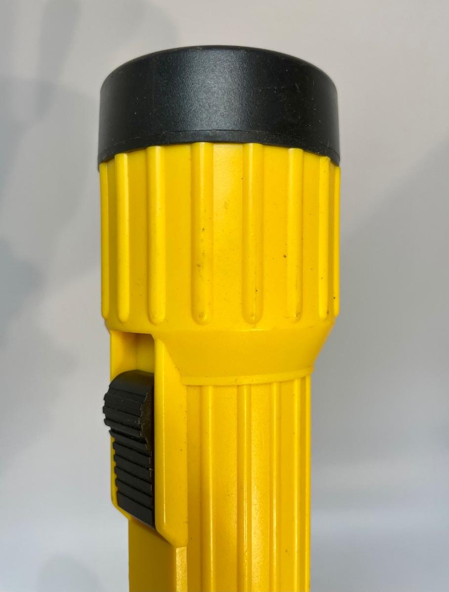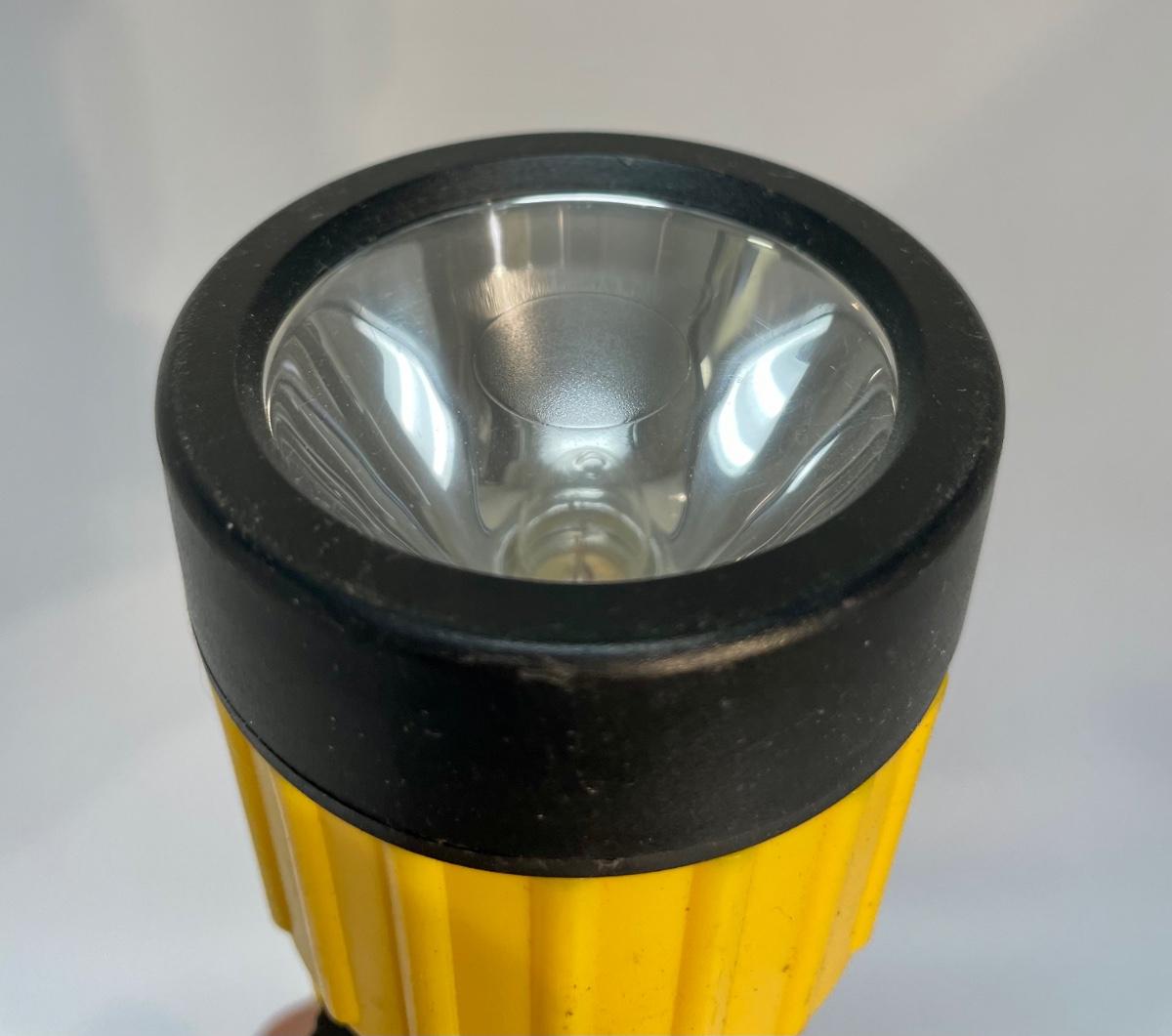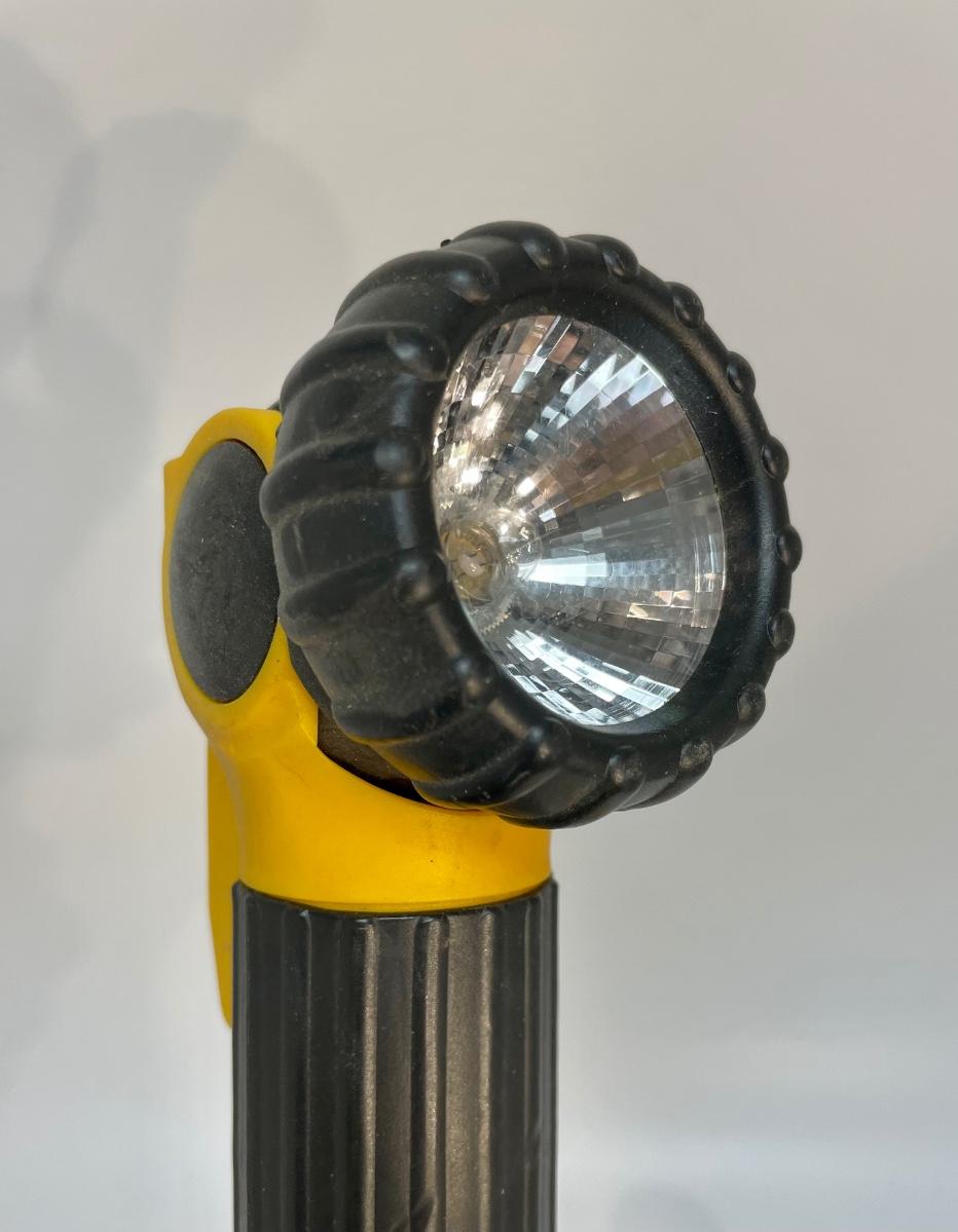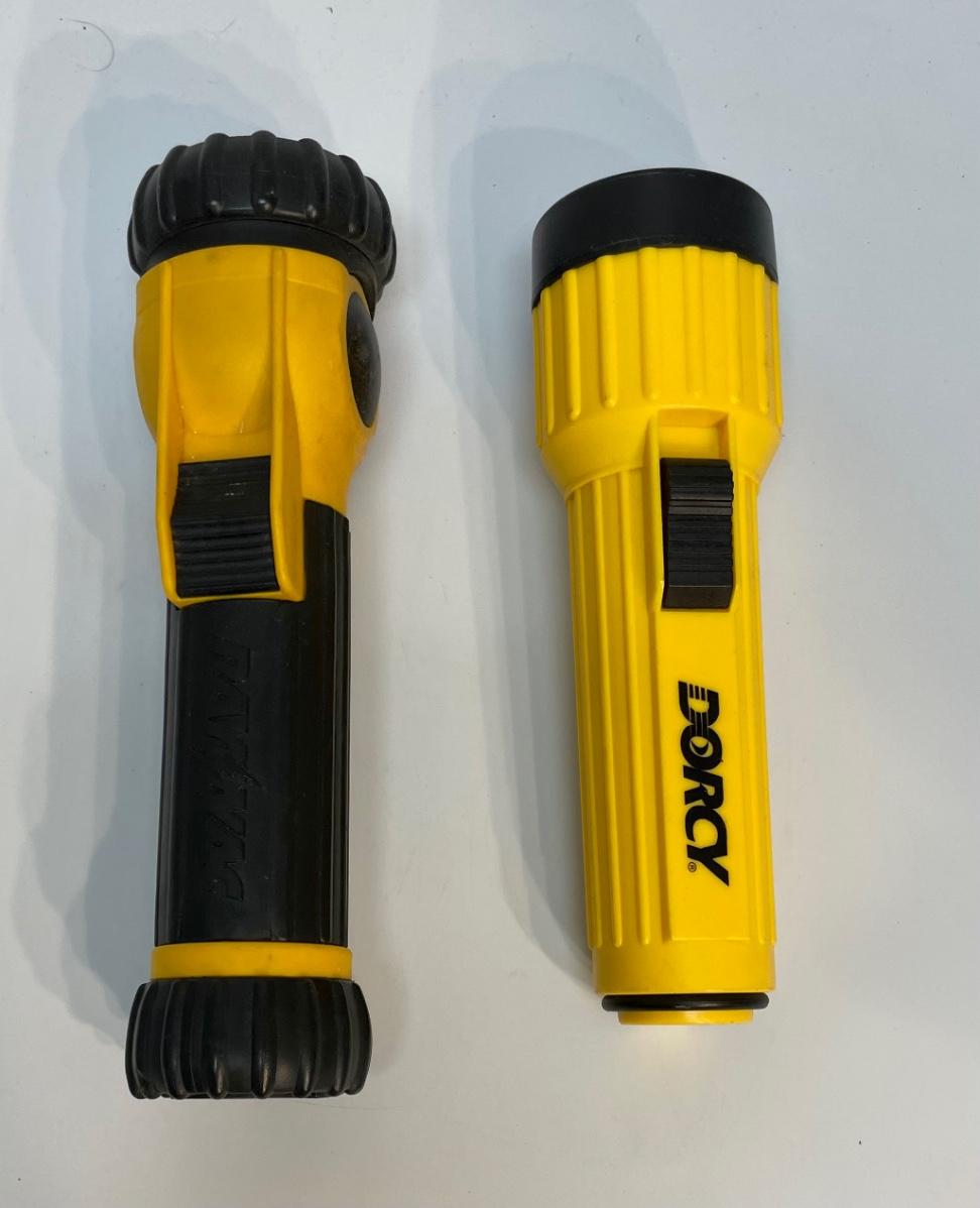 Pair of yellow safety flashlights. Each uses 2 D cells. Both tested and work as expected. One has a head that can swivel 90 degrees.