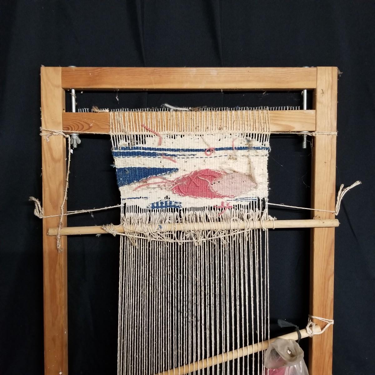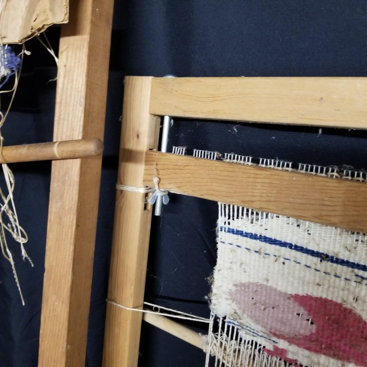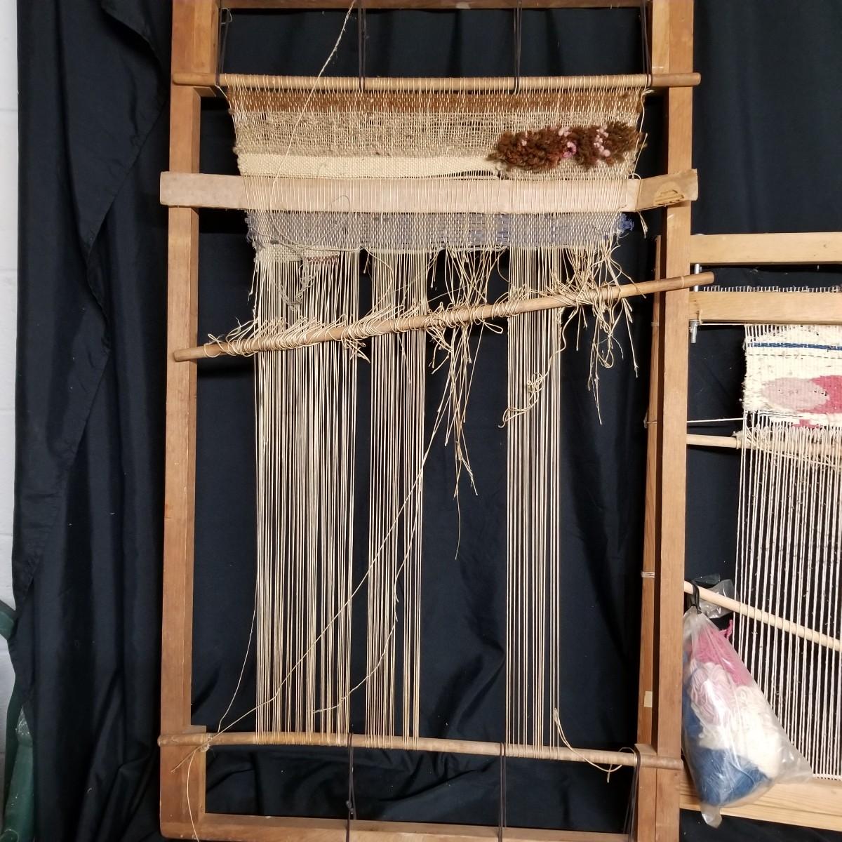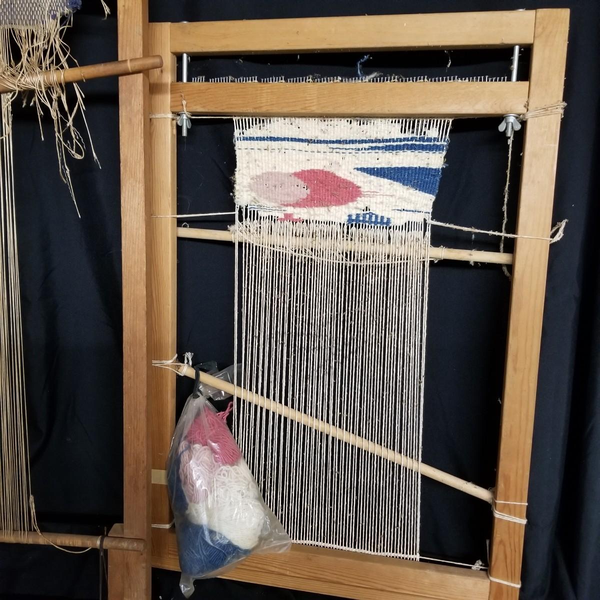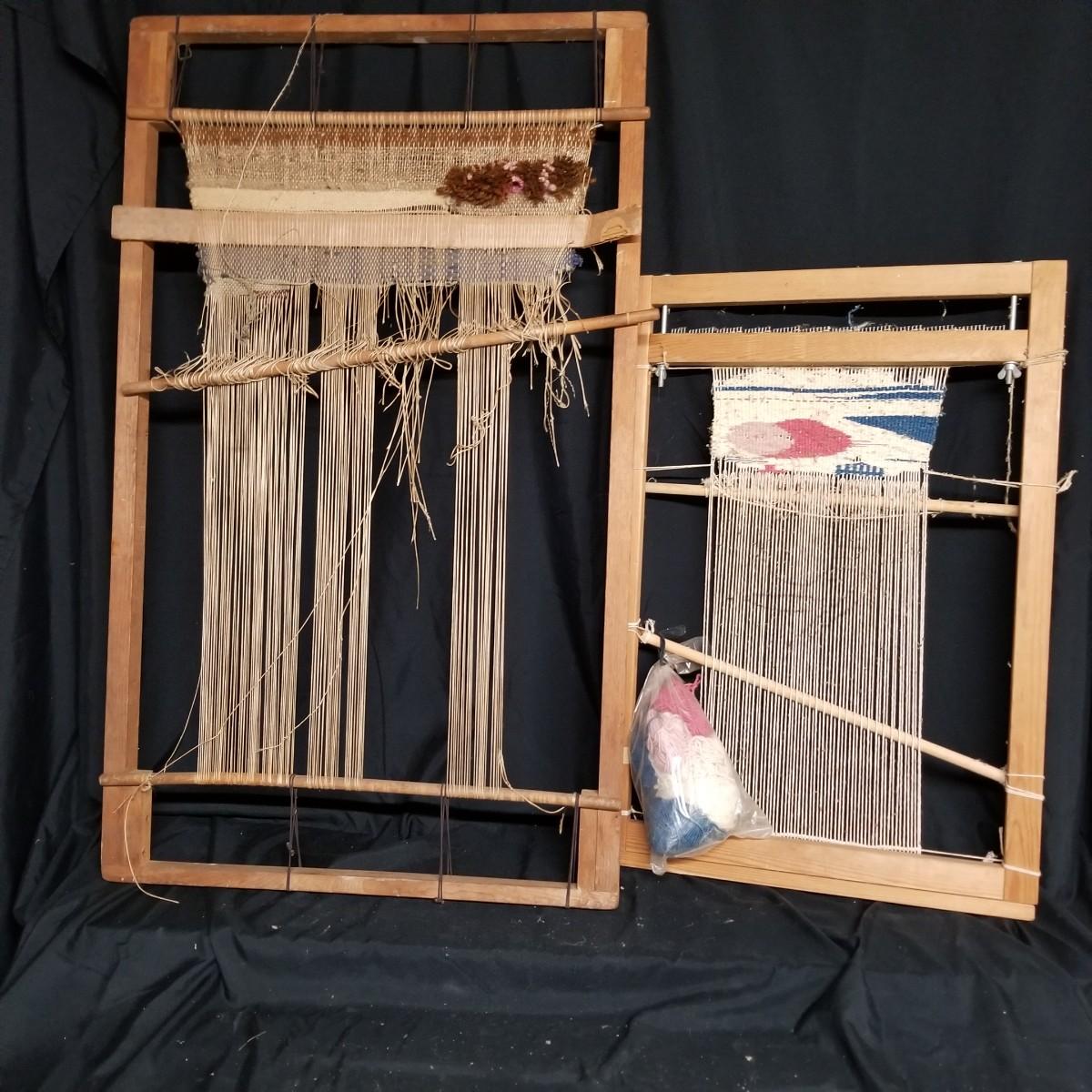 Two single frame weaving frames with projects attached. String warp, wood and paper lease sticks. Adjustable tension on both, solid wood frames. The larger frame is 23" x 39" x 2", the smaller frame is 18.5"x 27.5" x 1". Shipping may be costly, we suggest calling our local UPS with dimensions and getting an estimate prior to bidding. 828-252-6930.