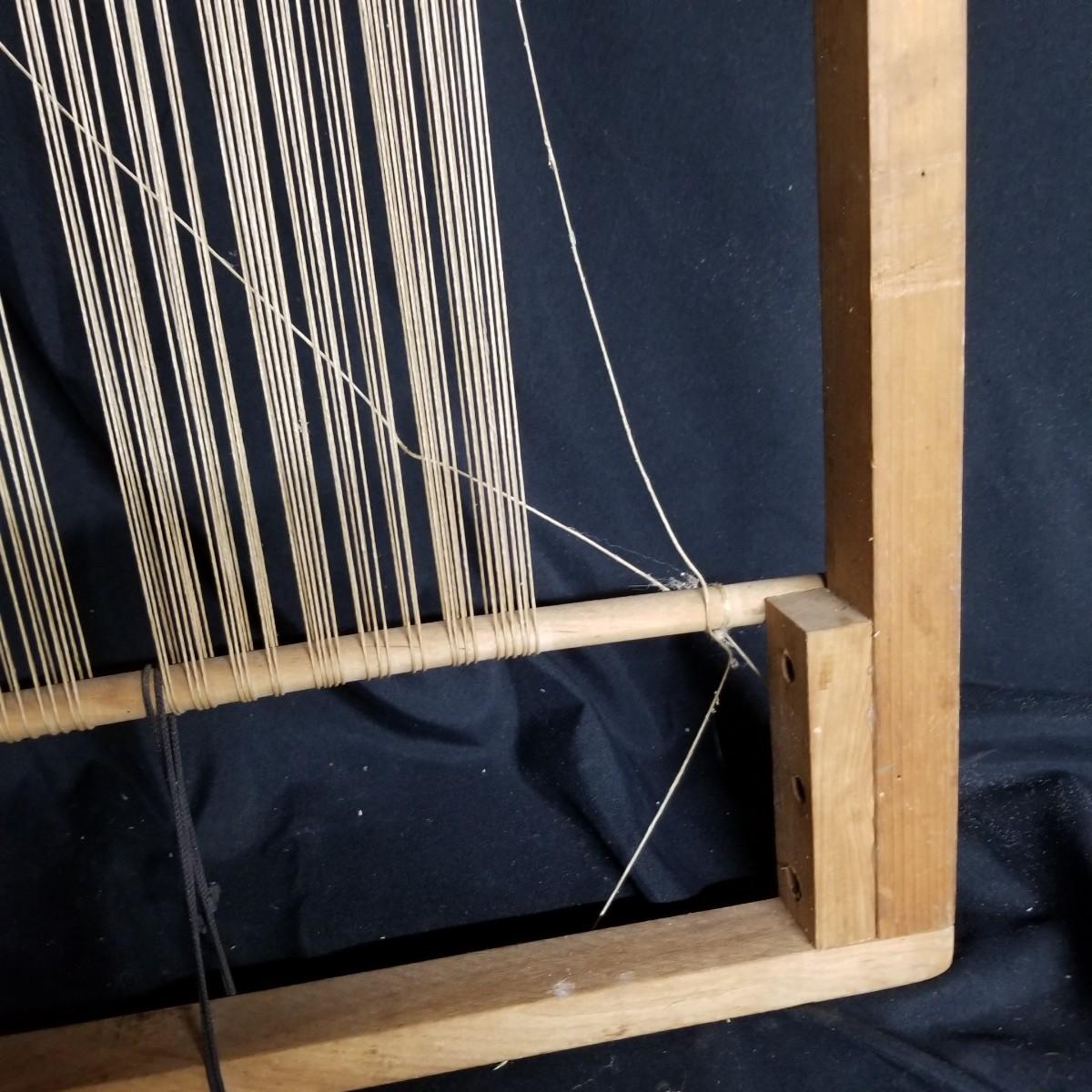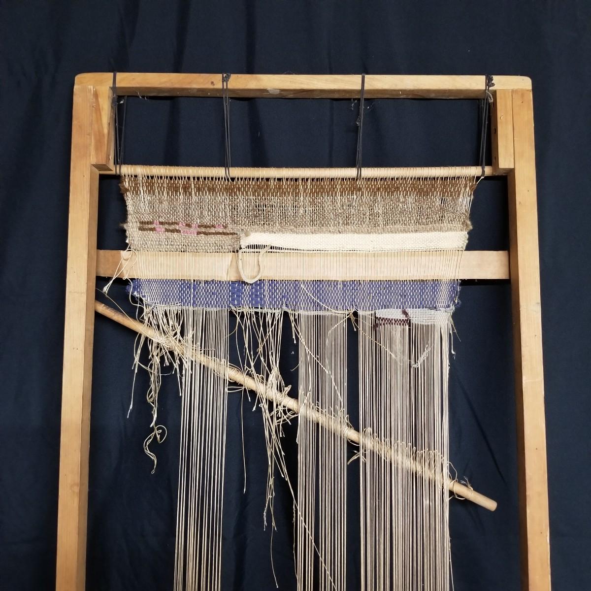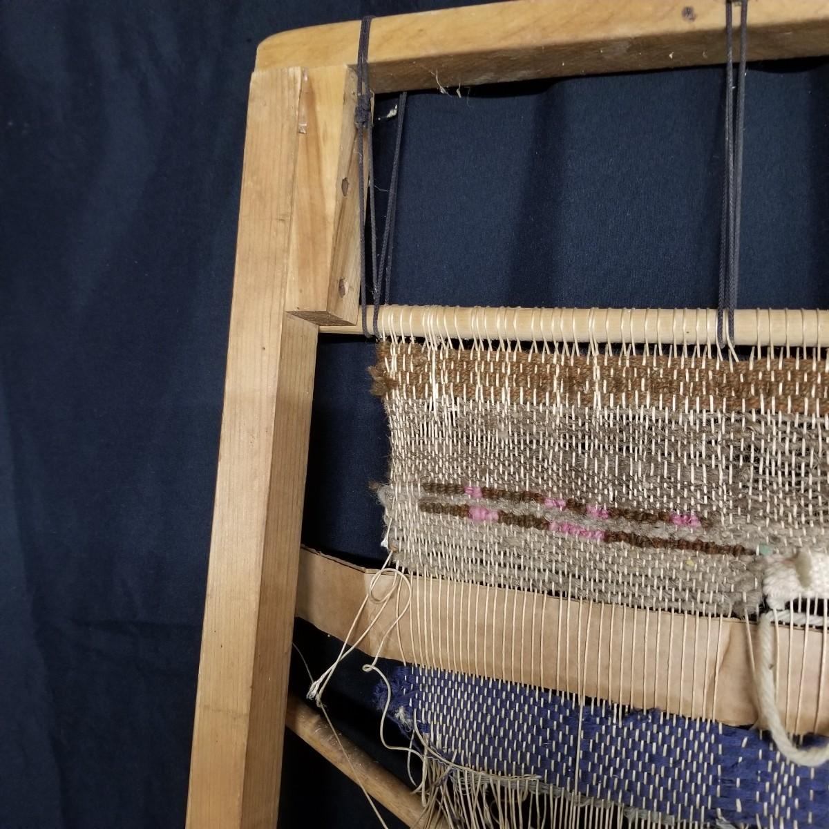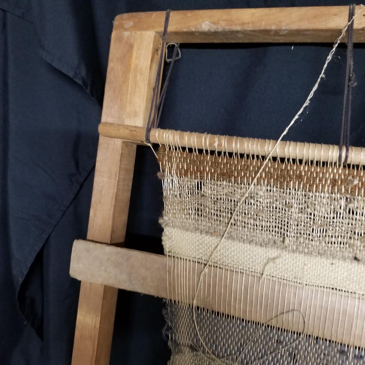 Two single frame weaving frames with projects attached. String warp, wood and paper lease sticks. Adjustable tension on both, solid wood frames. The larger frame is 23" x 39" x 2", the smaller frame is 18.5"x 27.5" x 1". Shipping may be costly, we suggest calling our local UPS with dimensions and getting an estimate prior to bidding. 828-252-6930.