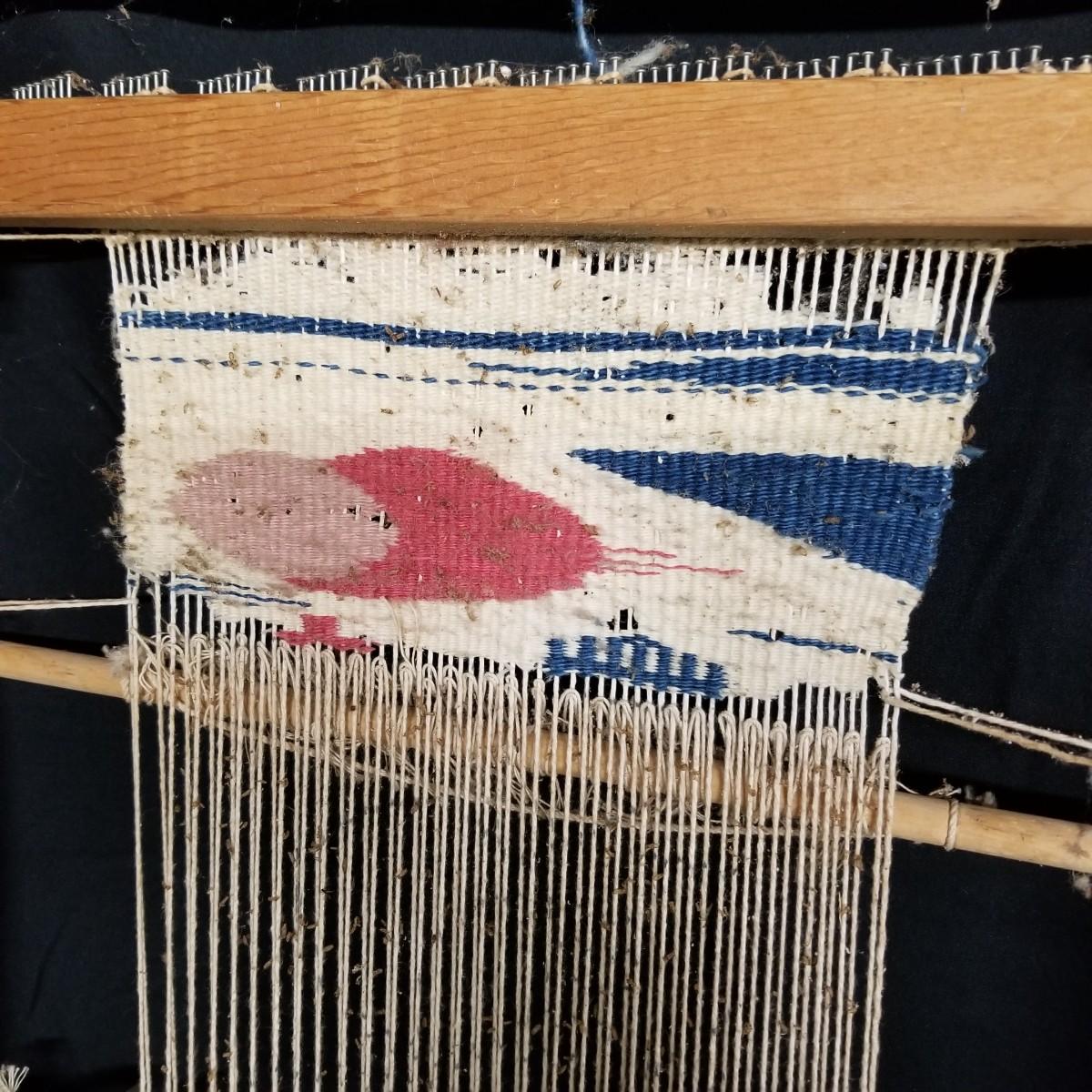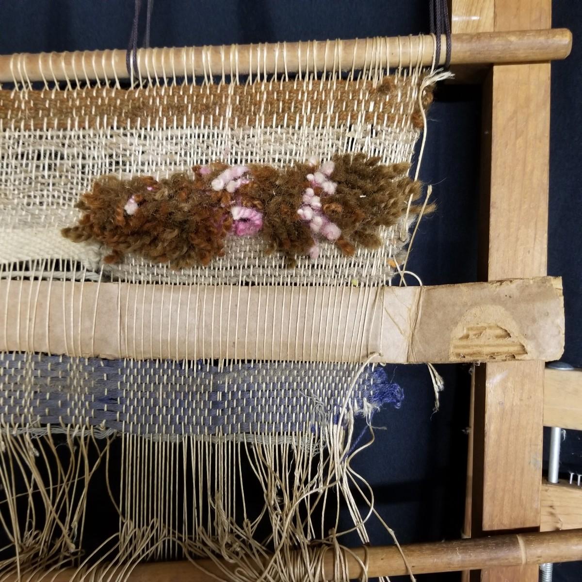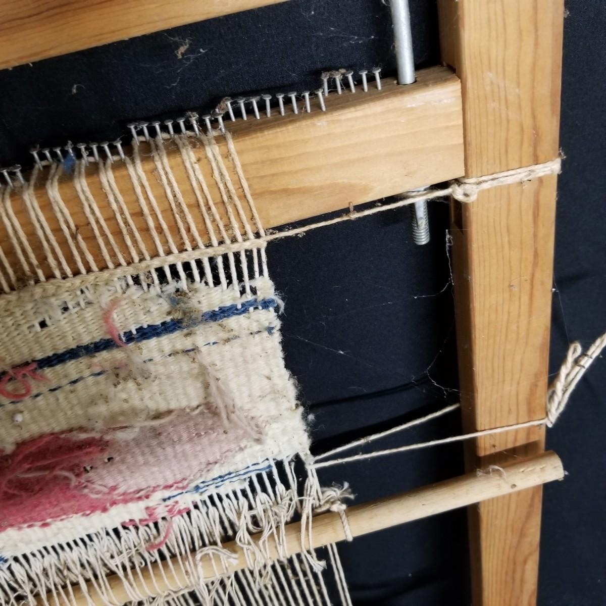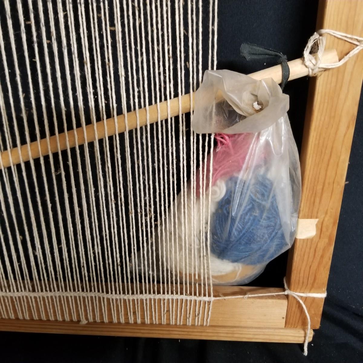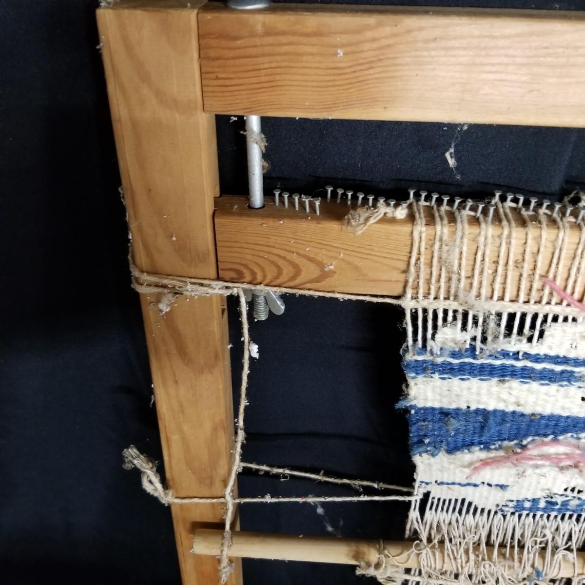 Two single frame weaving frames with projects attached. String warp, wood and paper lease sticks. Adjustable tension on both, solid wood frames. The larger frame is 23" x 39" x 2", the smaller frame is 18.5"x 27.5" x 1". Shipping may be costly, we suggest calling our local UPS with dimensions and getting an estimate prior to bidding. 828-252-6930.