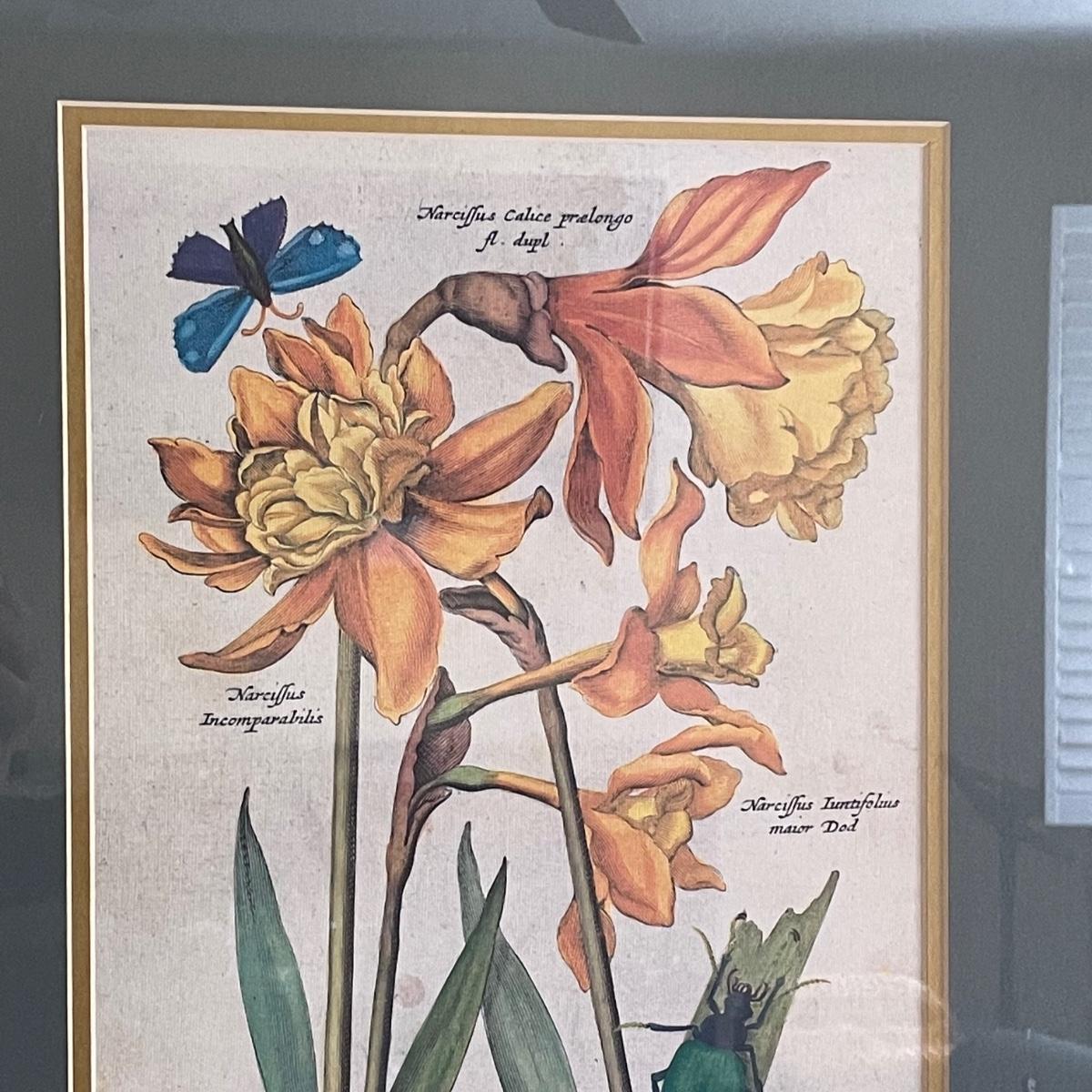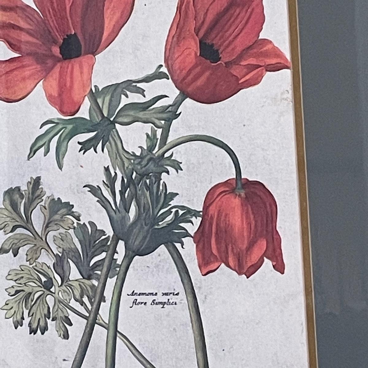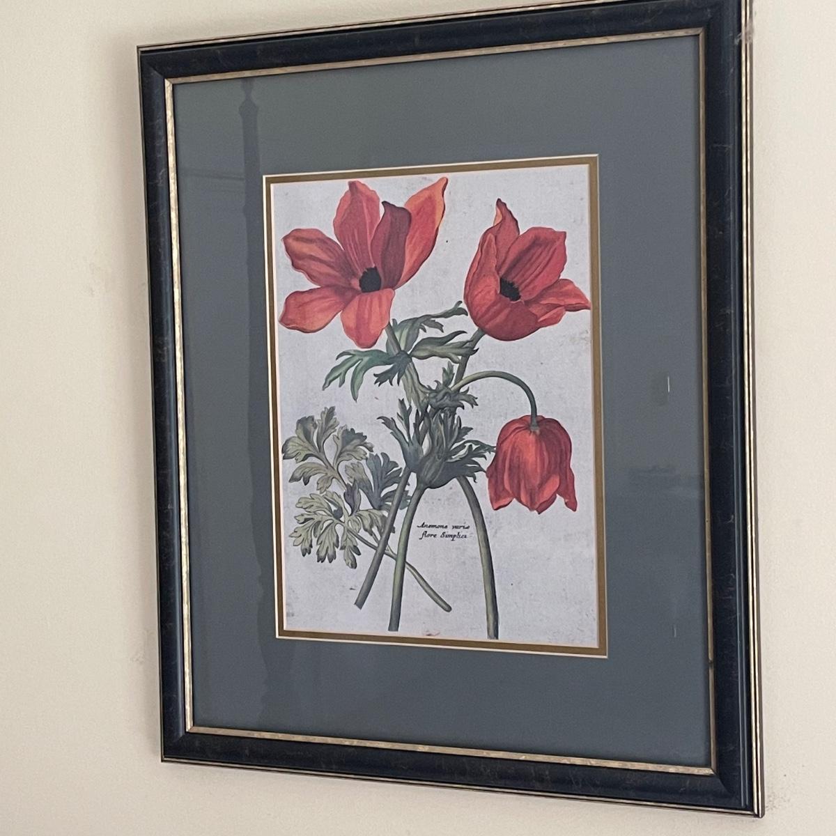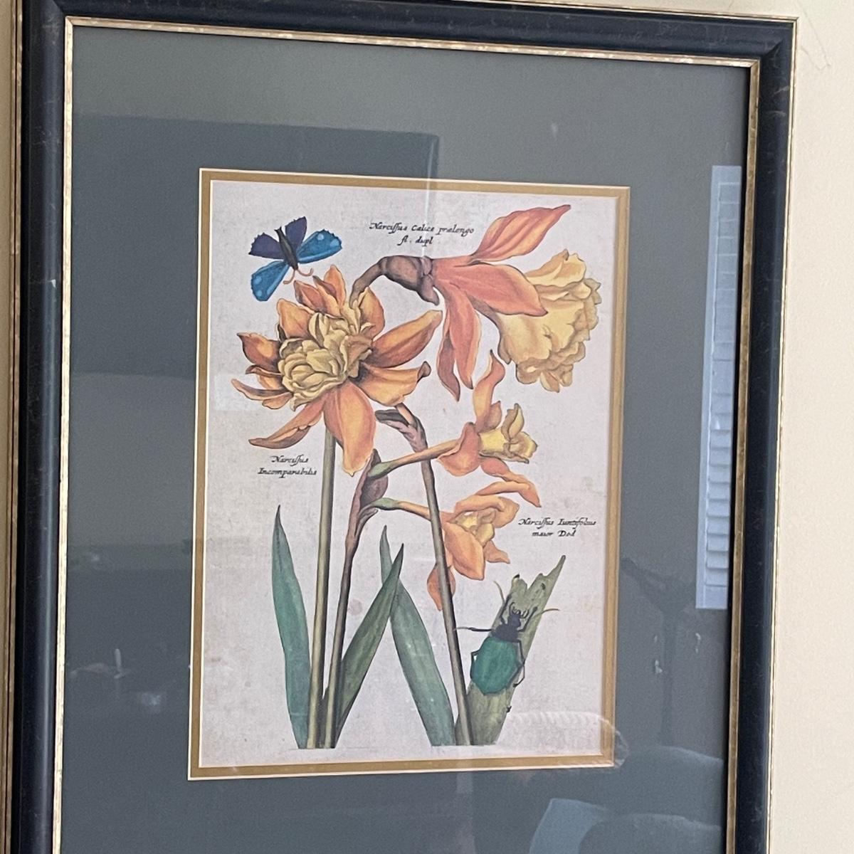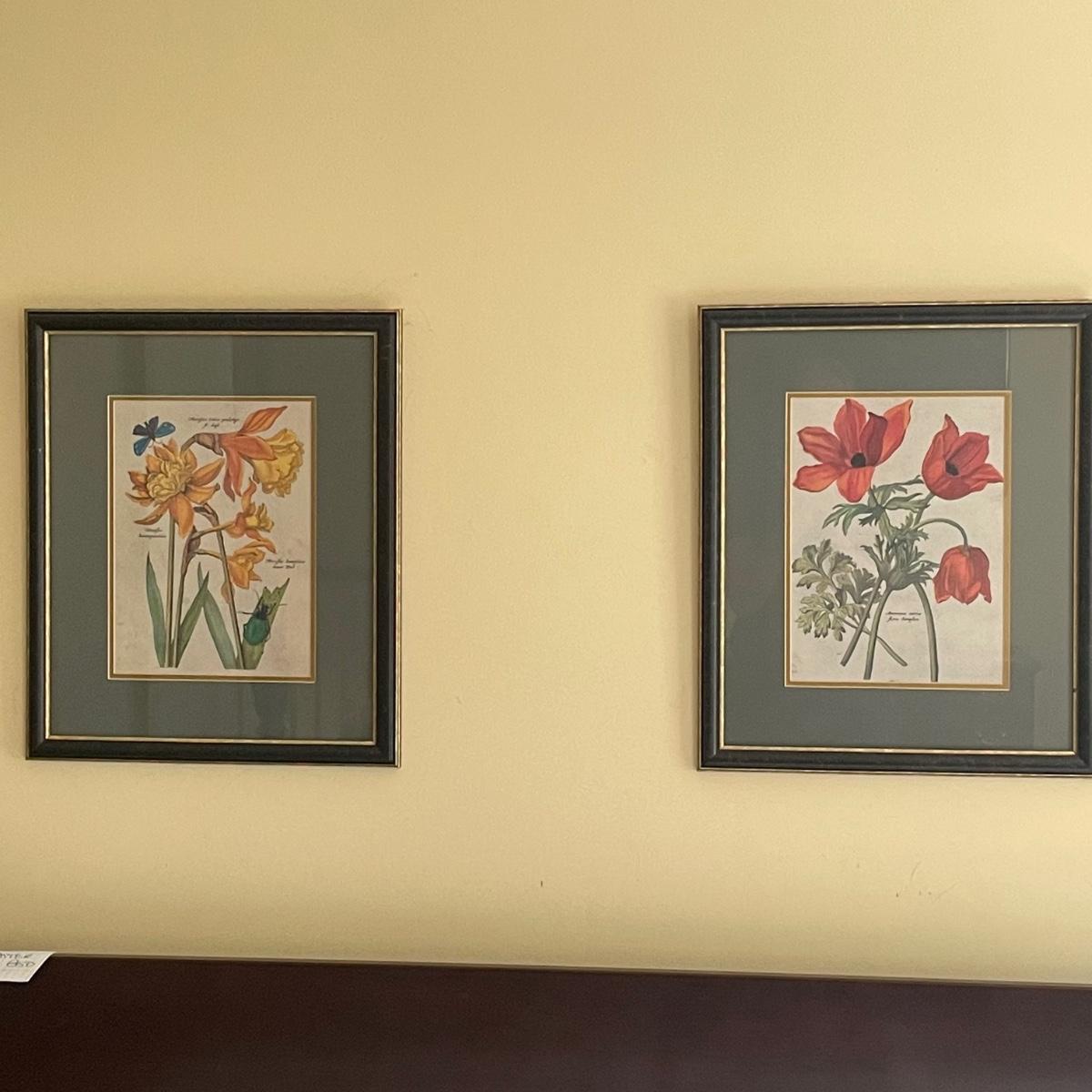 These 2 floral prints are titled Narcissus and Anemone. They are both mounted in matching black frames with an attractive marble like design and they each measure 13” x 18".